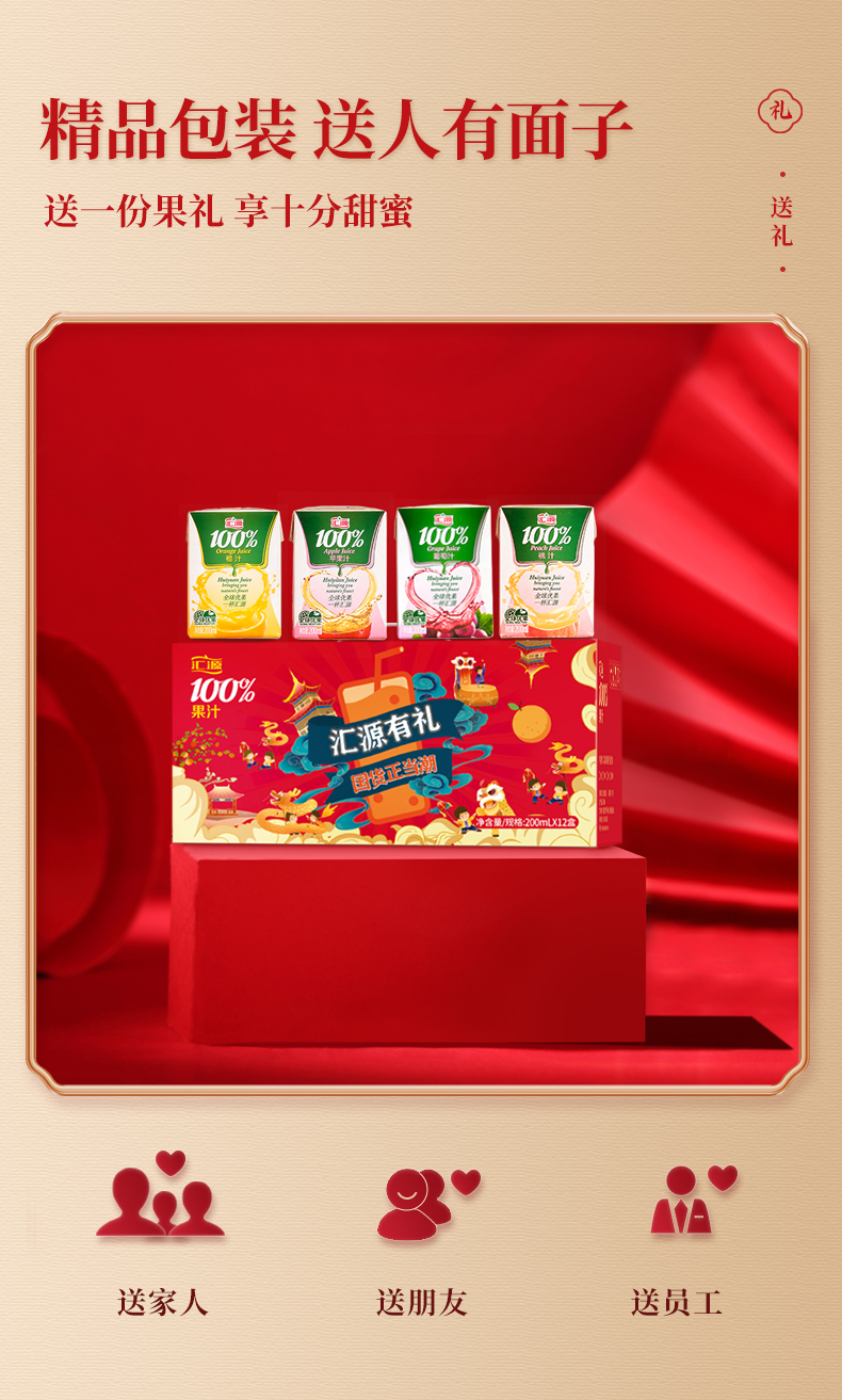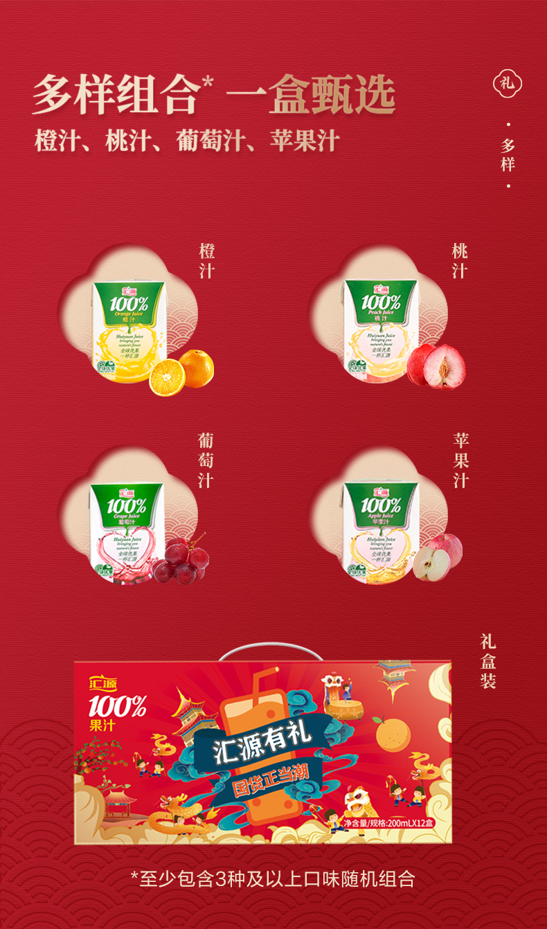 汇源果汁200ml*12盒 国风礼盒 饮料 整箱 口味随机 送礼 过年 年货 包邮