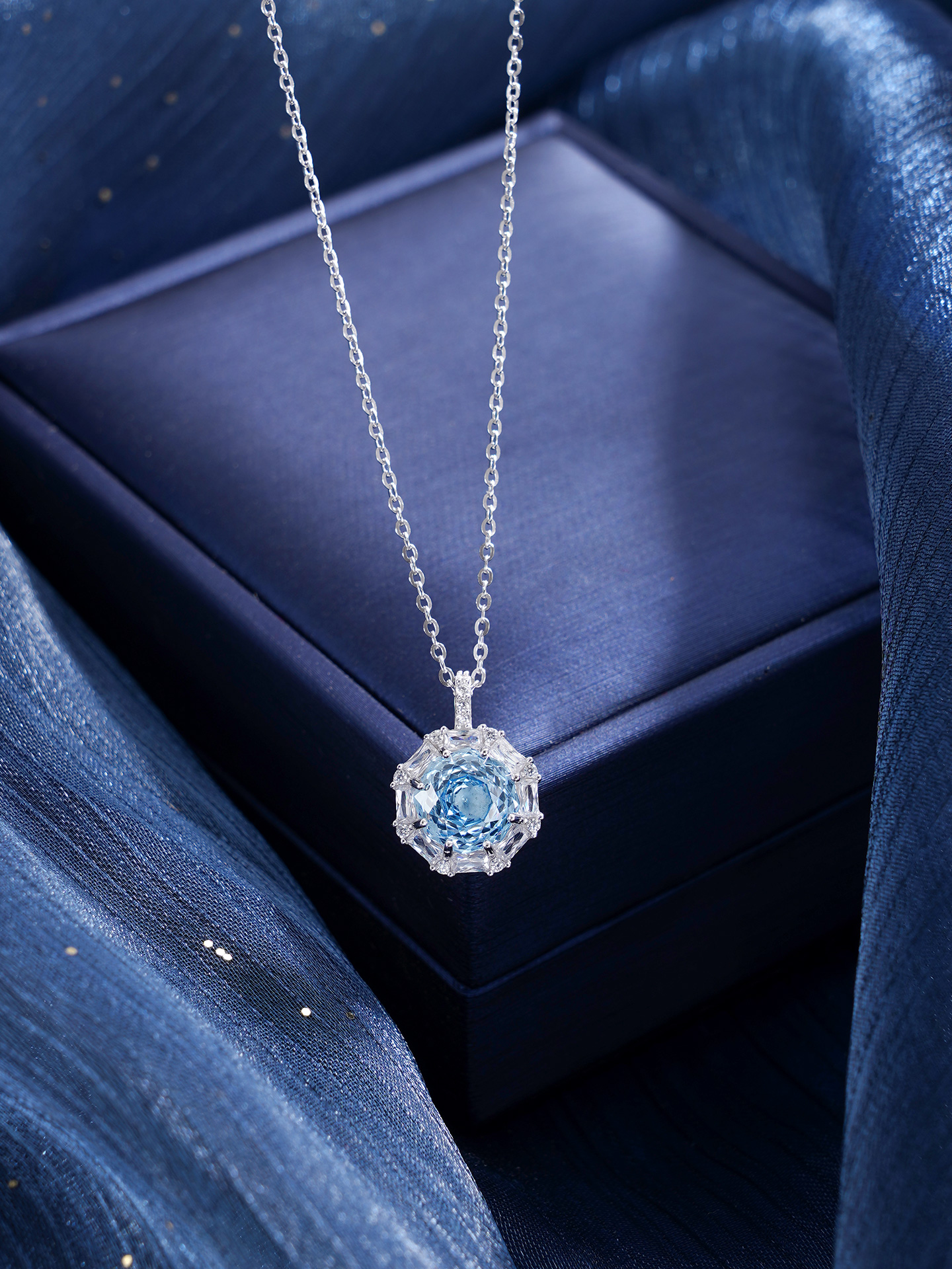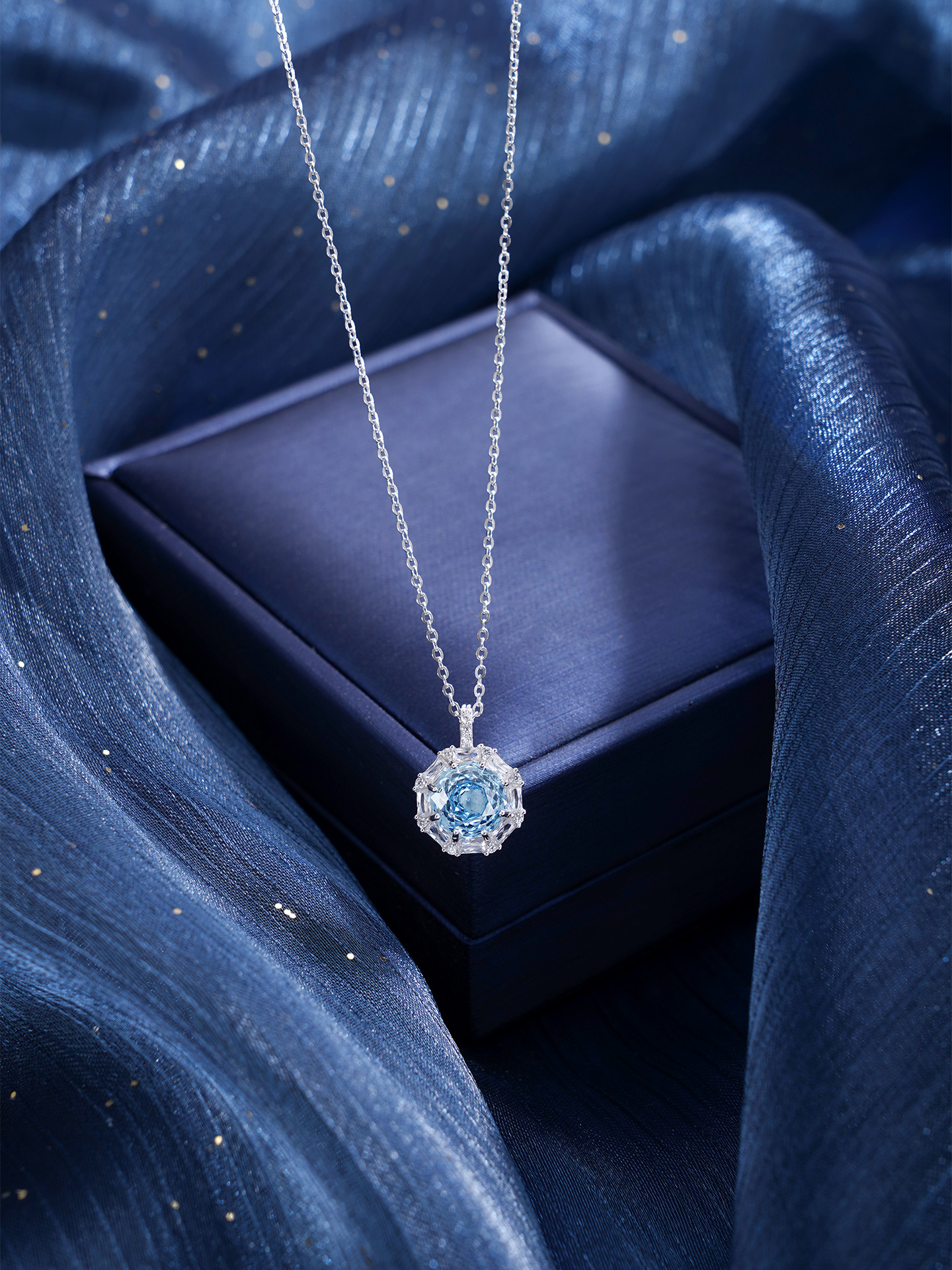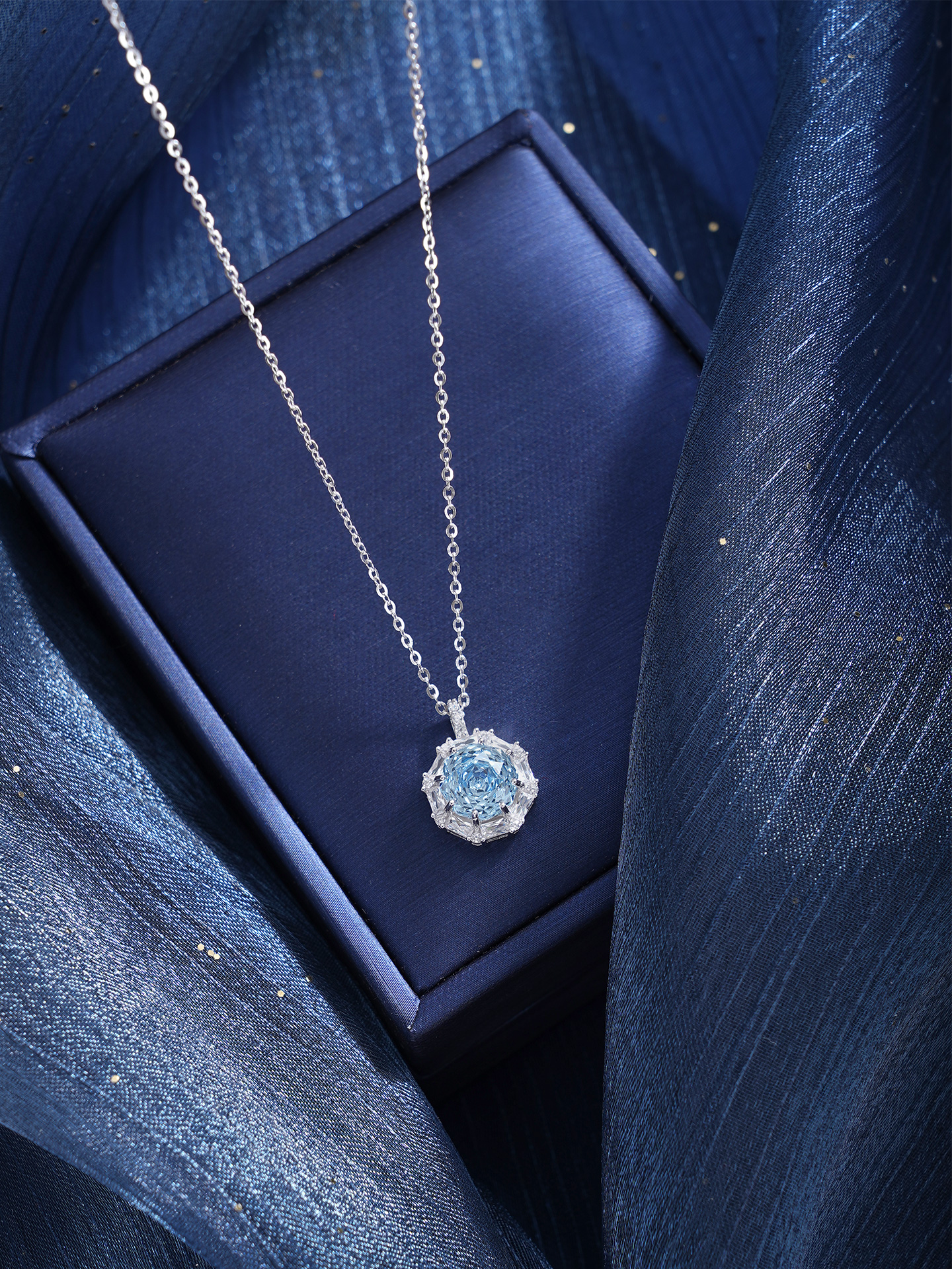 【寓意】:蓝宝石代表忠贞与高贵,以玫瑰切工塑造花形吊坠,寓意爱意炽热,深情不渝。