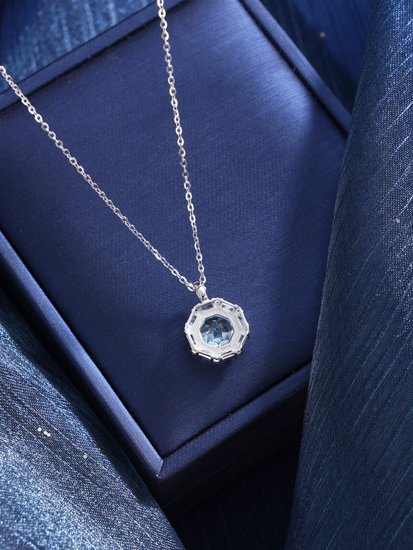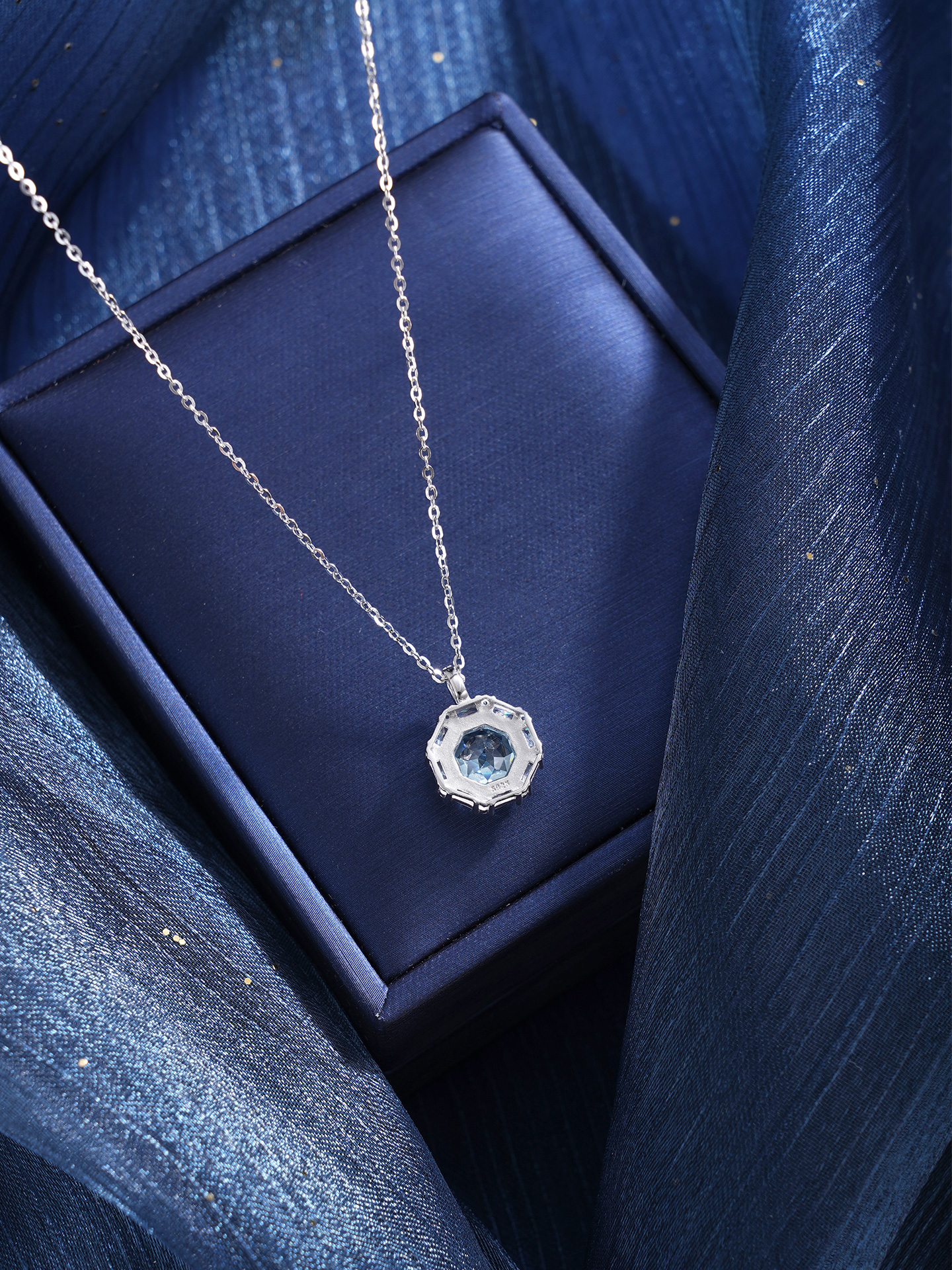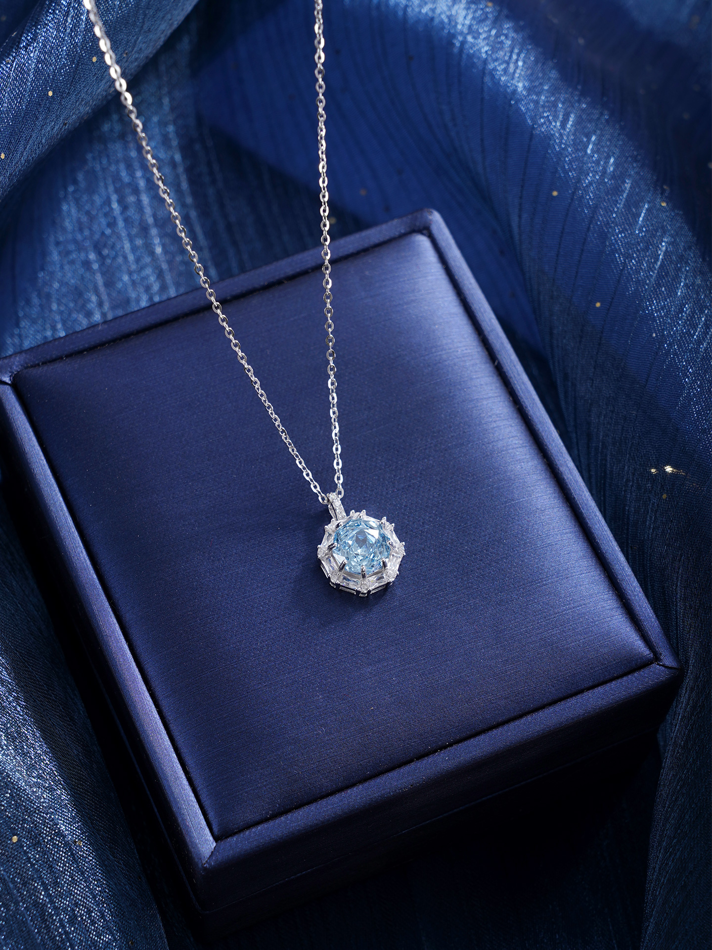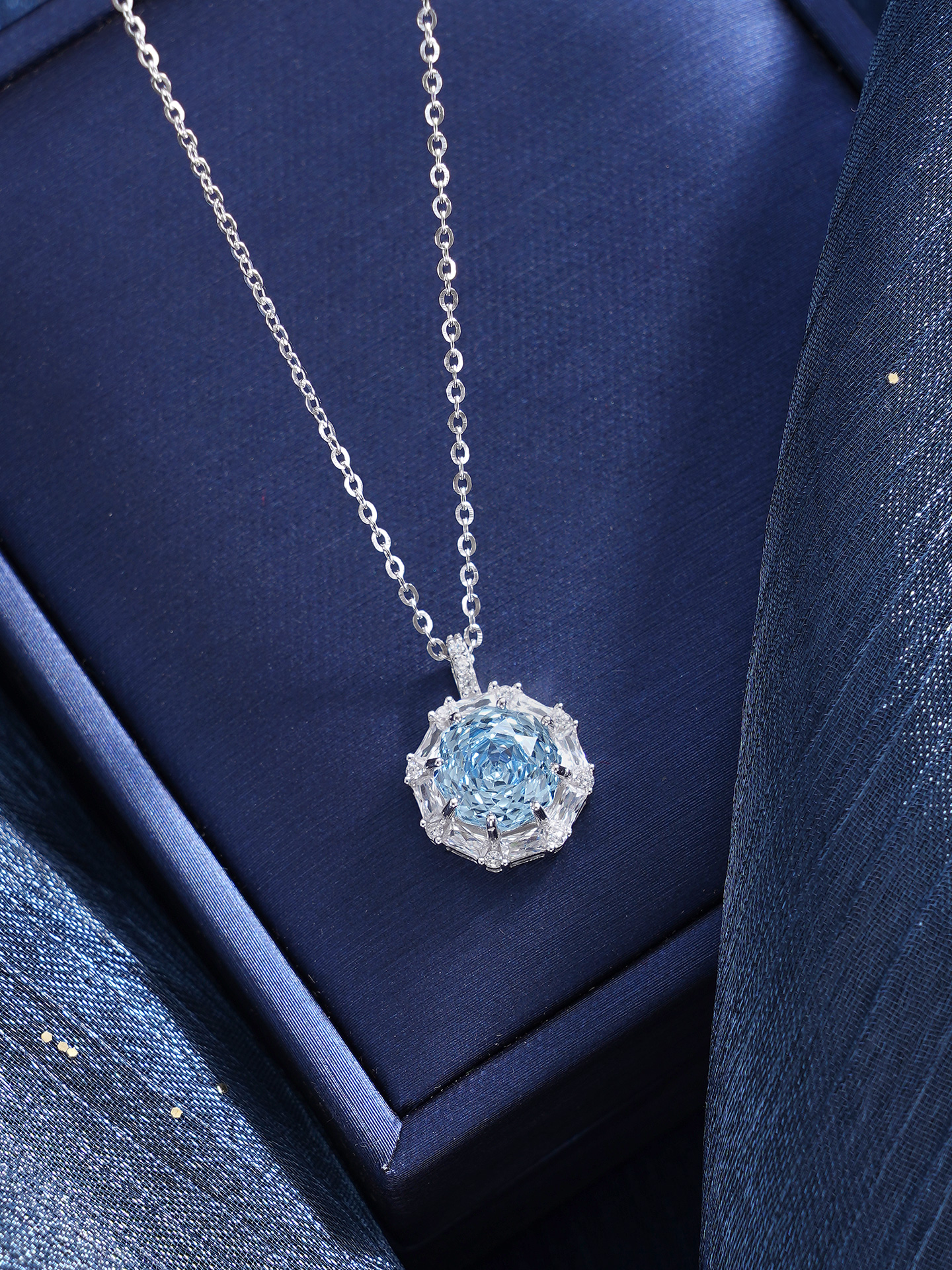 【寓意】:蓝宝石代表忠贞与高贵,以玫瑰切工塑造花形吊坠,寓意爱意炽热,深情不渝。