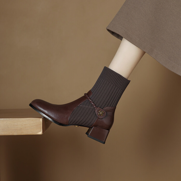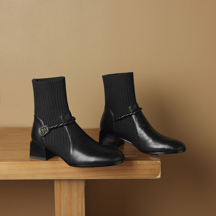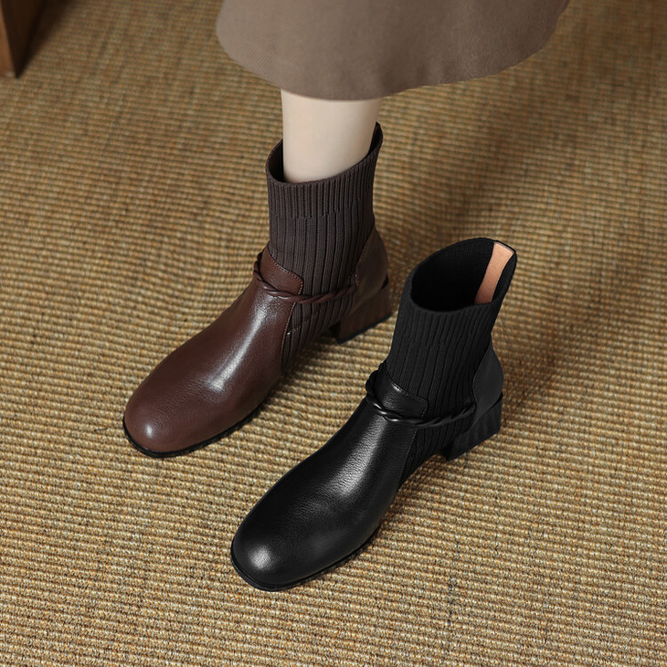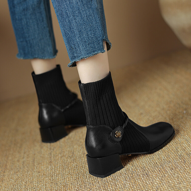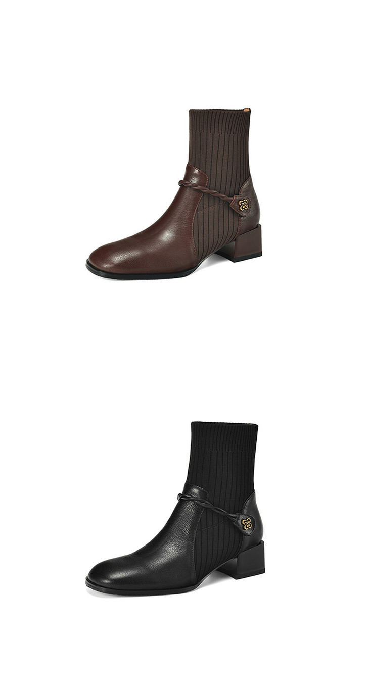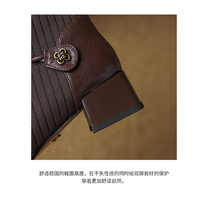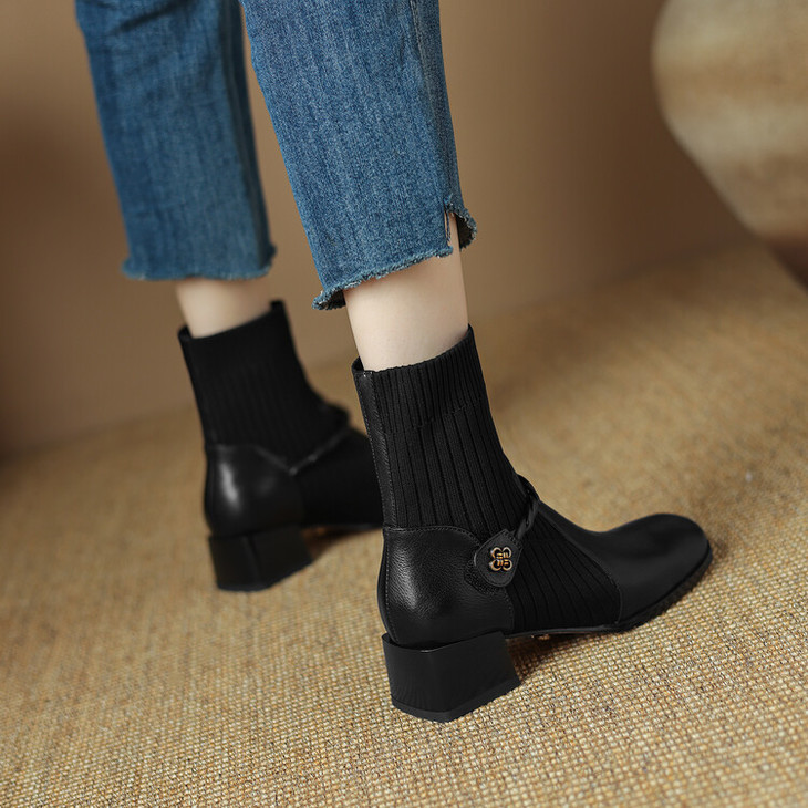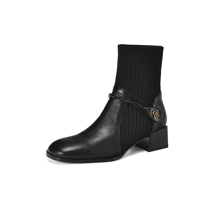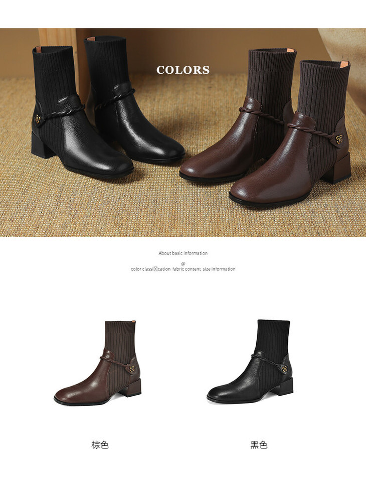 【预售5天】洋气小短靴春秋单靴圆头中跟粗跟真皮毛线口黑色棕色弹力袜靴LD&6943