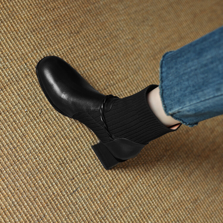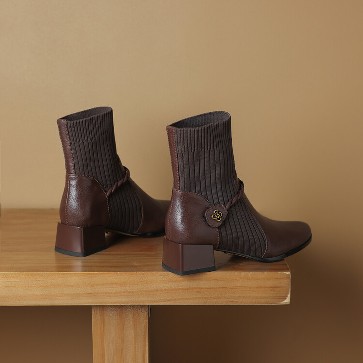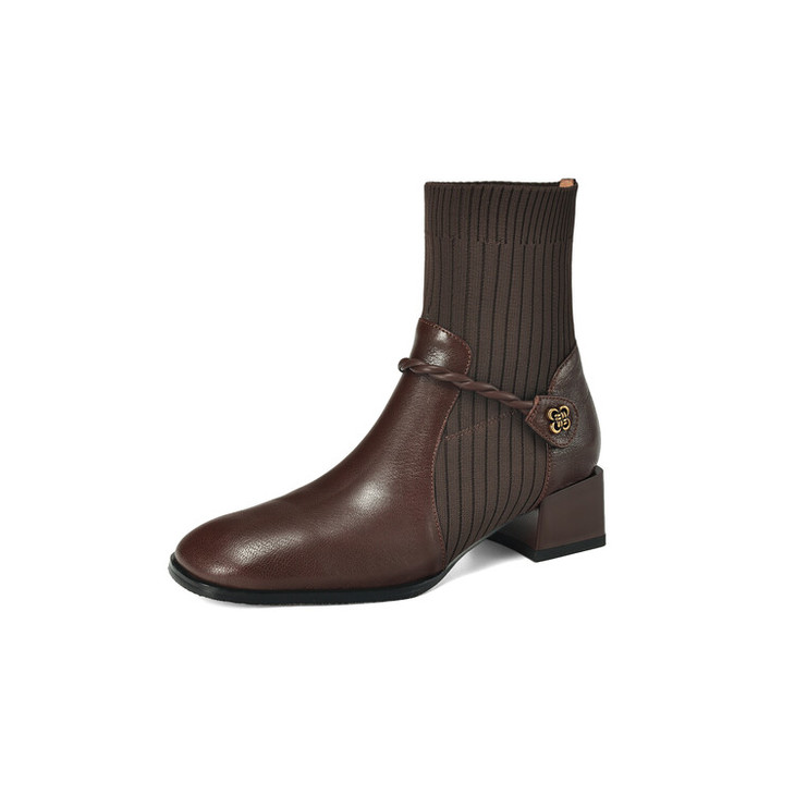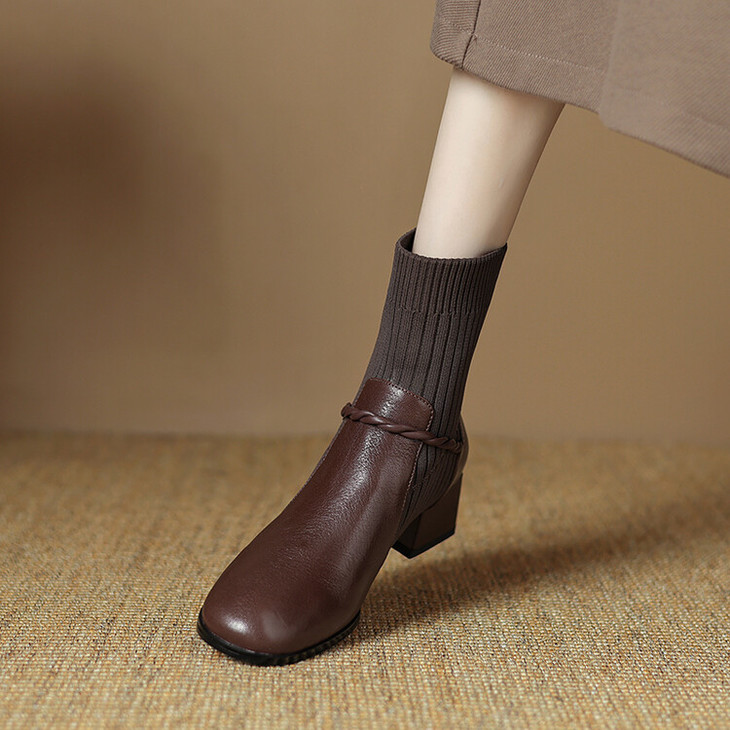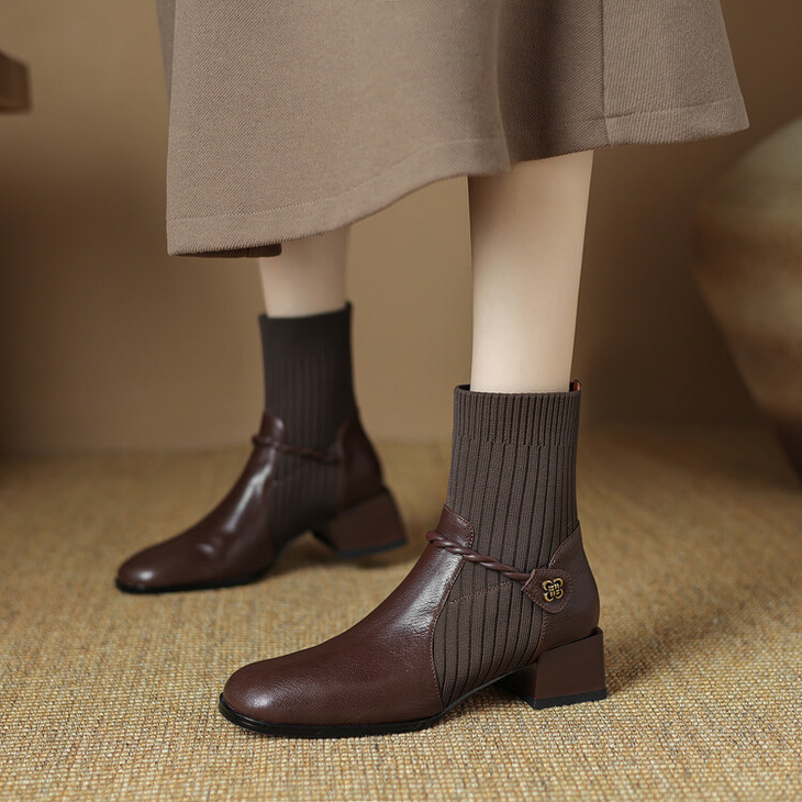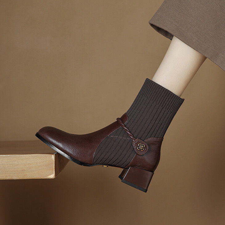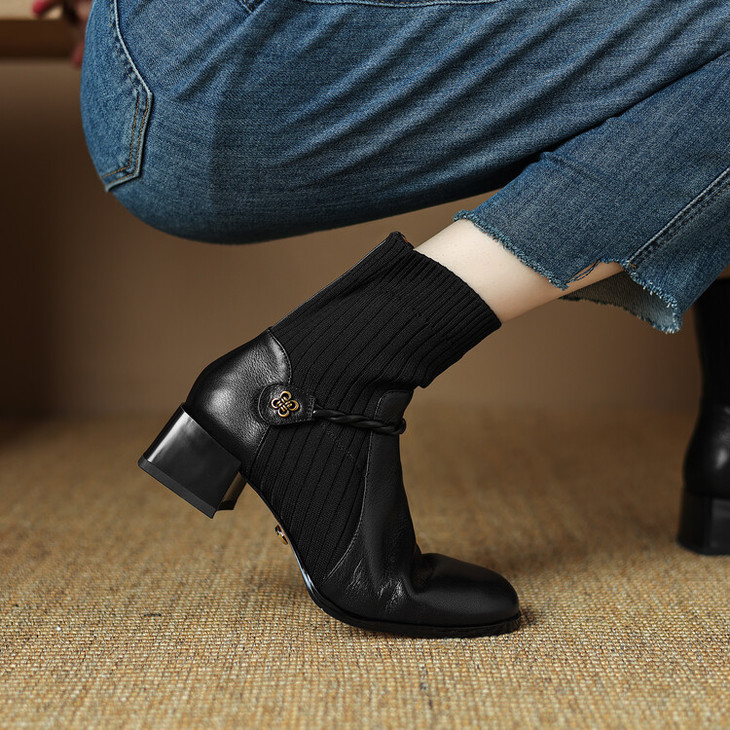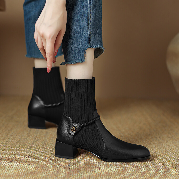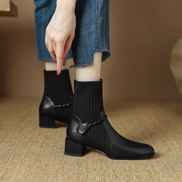 【预售5天】洋气小短靴春秋单靴圆头中跟粗跟真皮毛线口黑色棕色弹力袜靴LD&6943