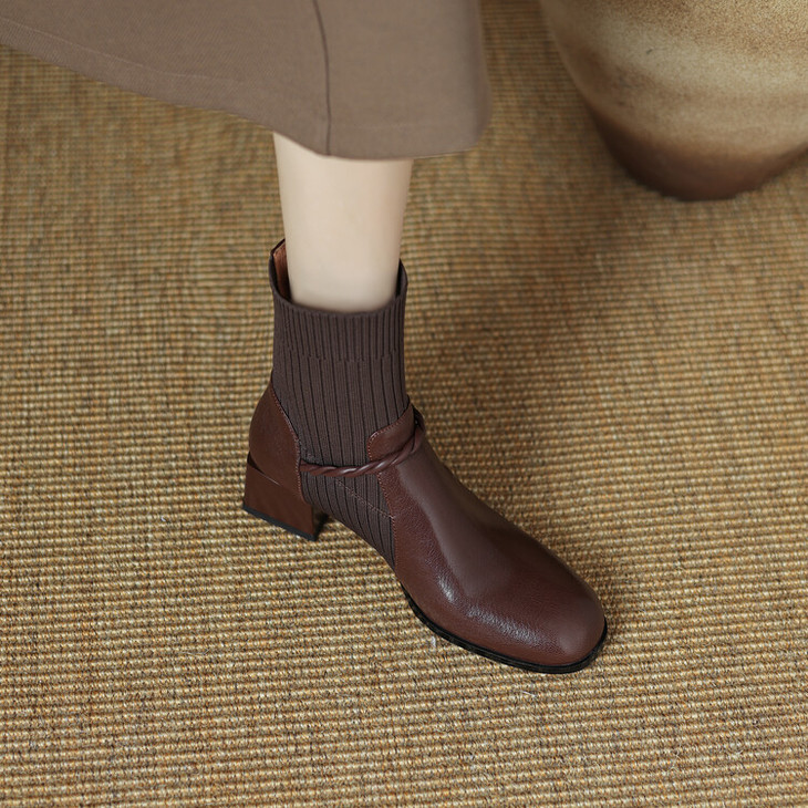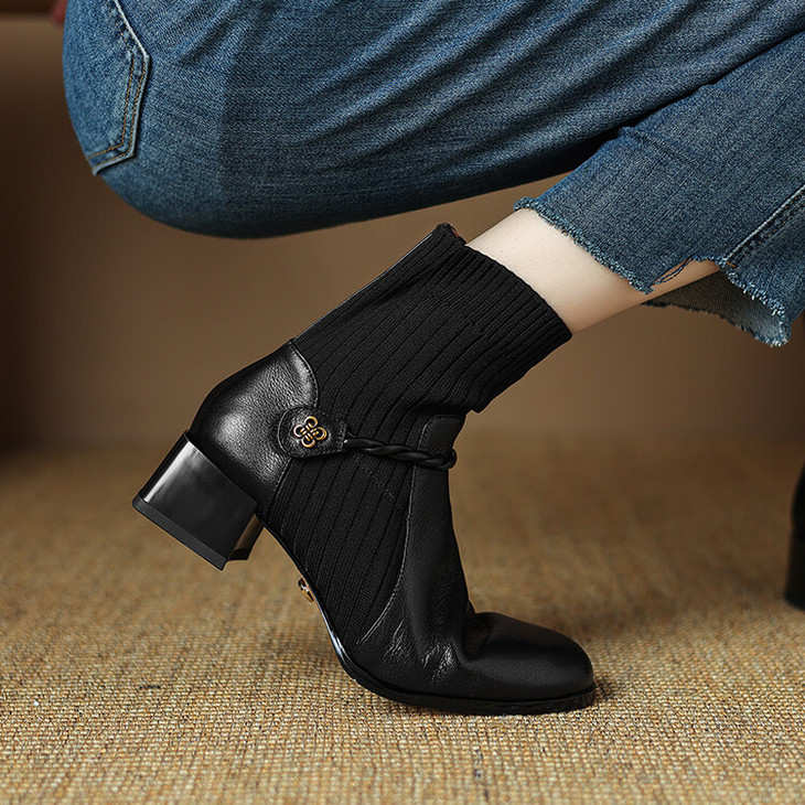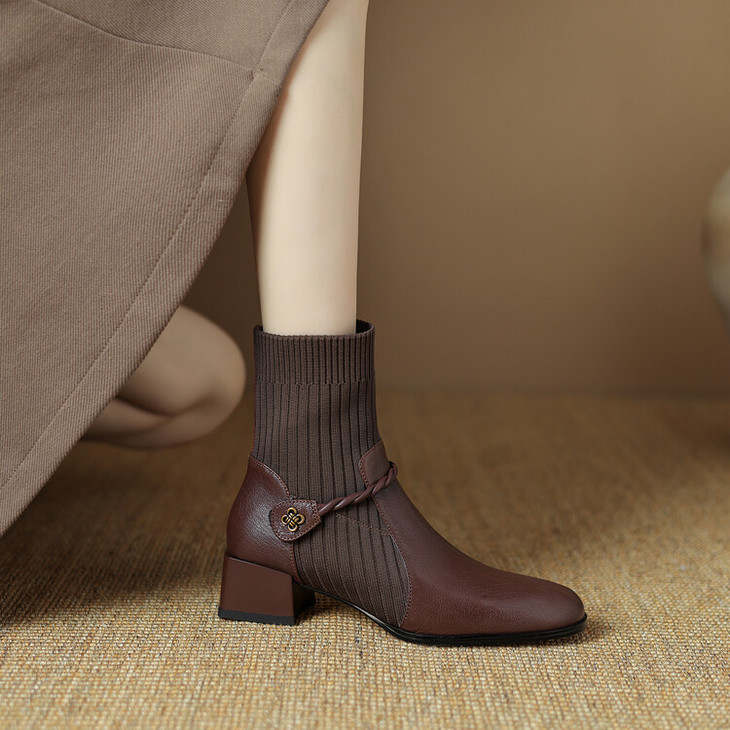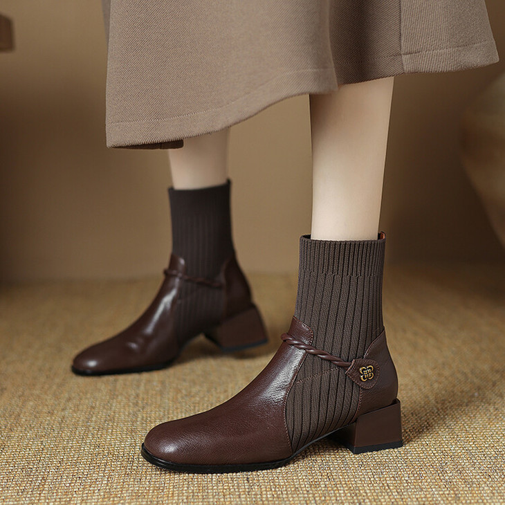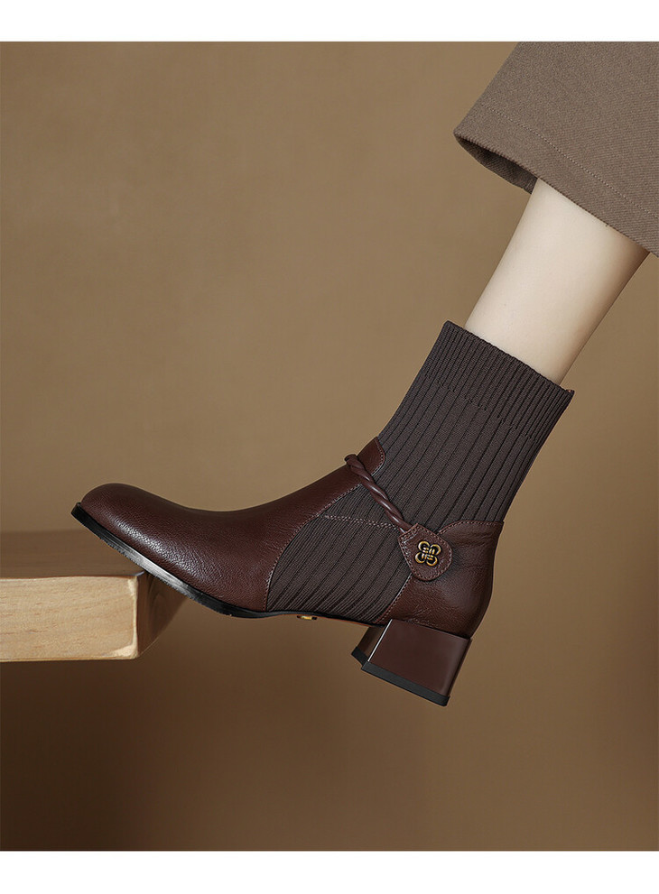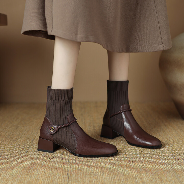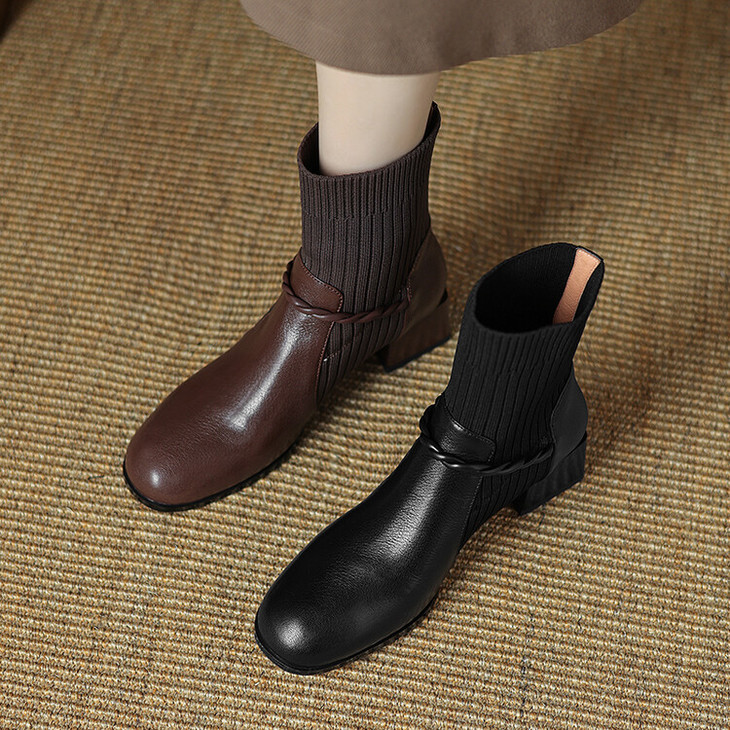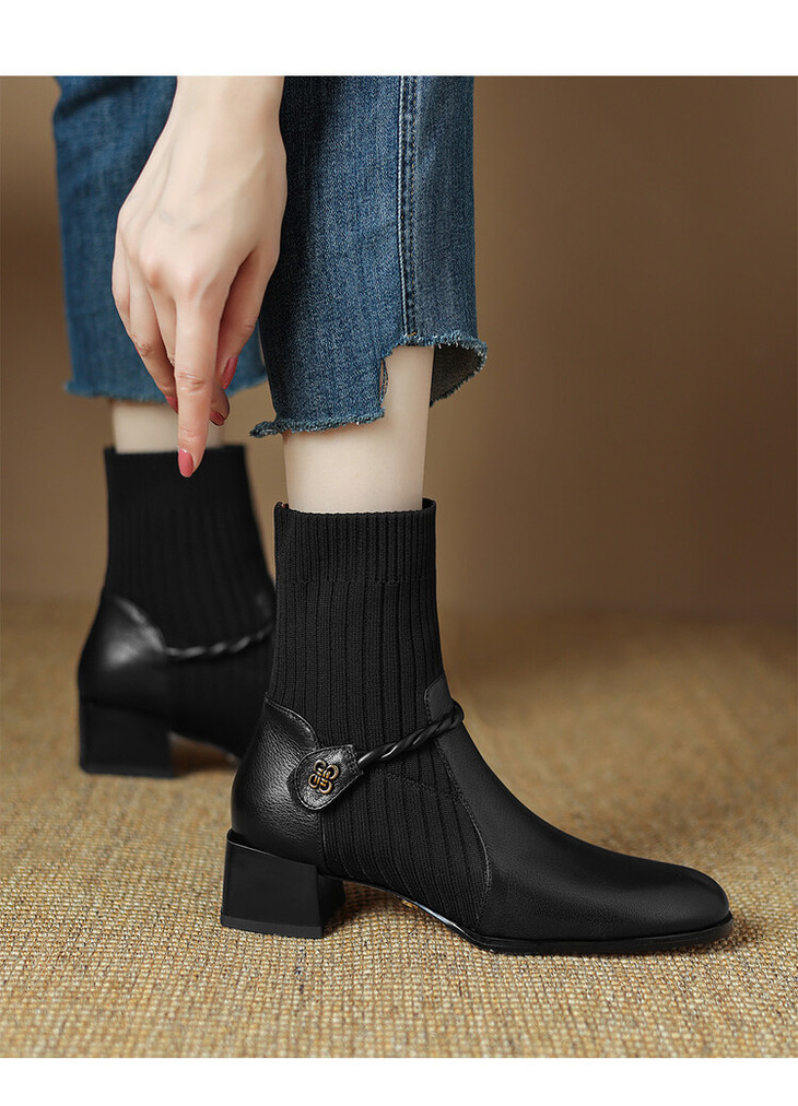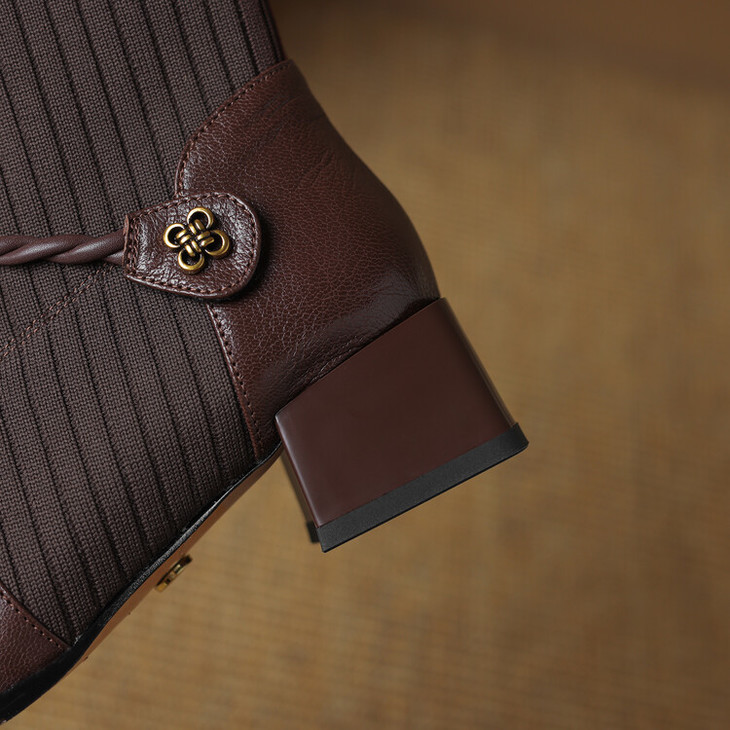 【预售5天】洋气小短靴春秋单靴圆头中跟粗跟真皮毛线口黑色棕色弹力袜靴LD&6943
