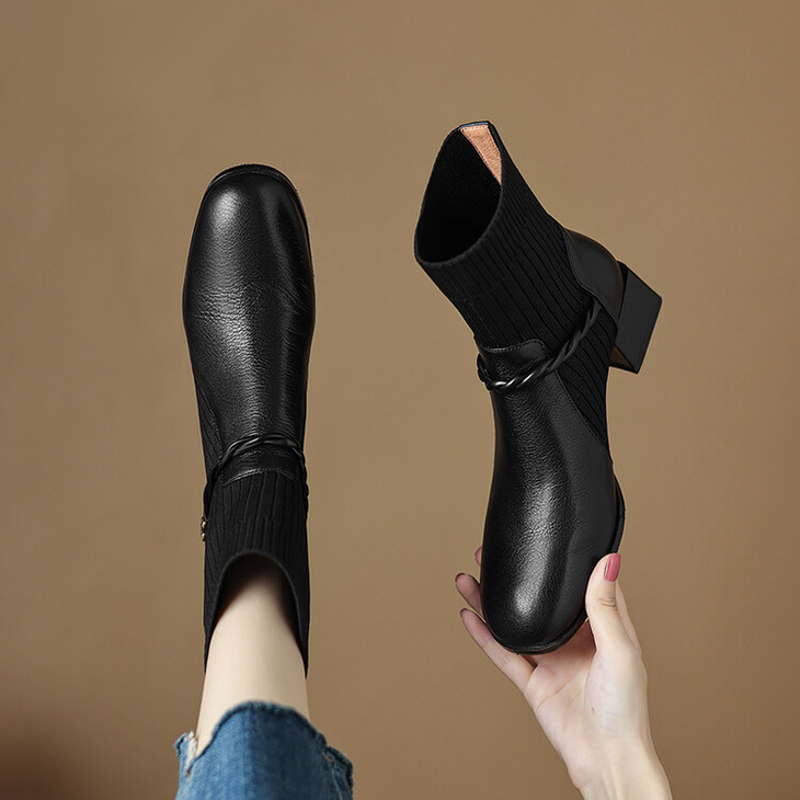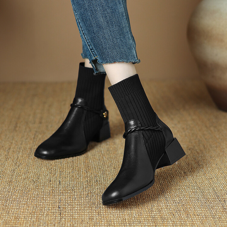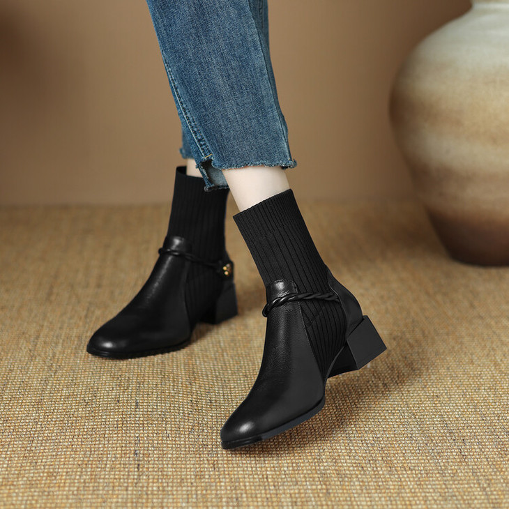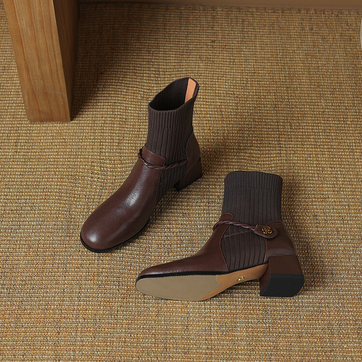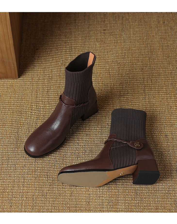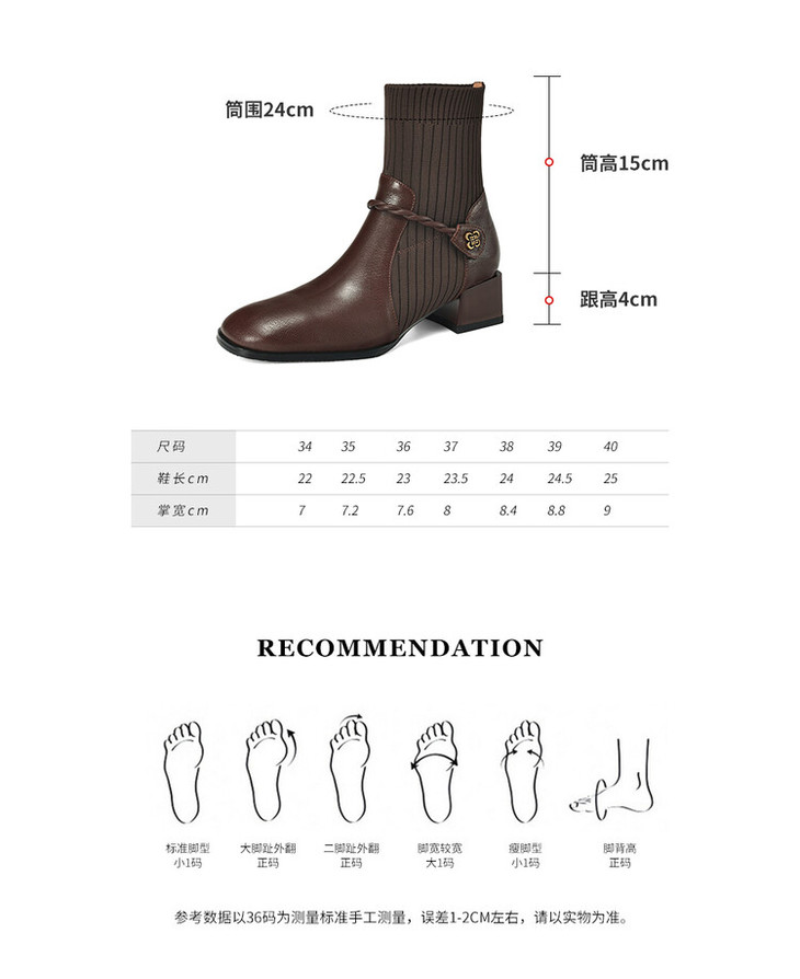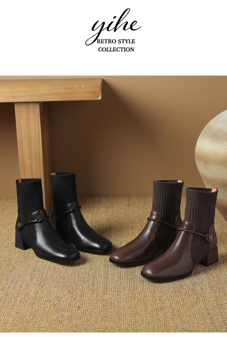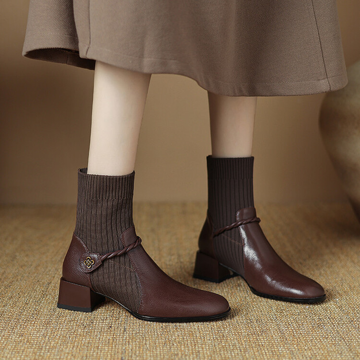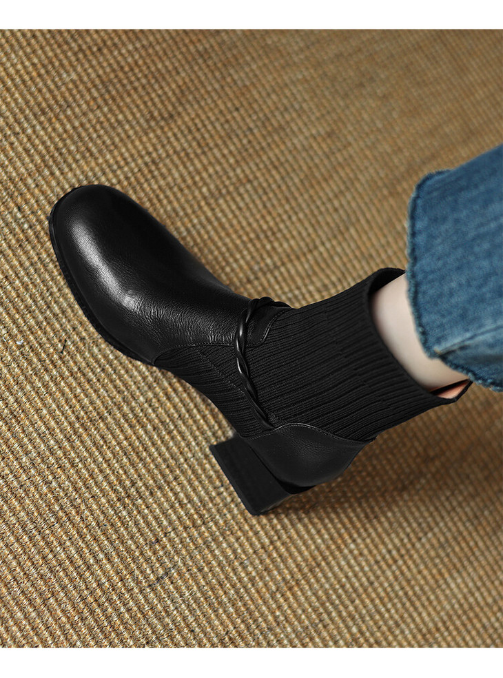 【预售5天】洋气小短靴春秋单靴圆头中跟粗跟真皮毛线口黑色棕色弹力袜靴LD&6943