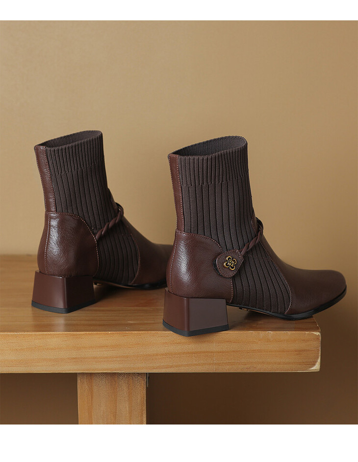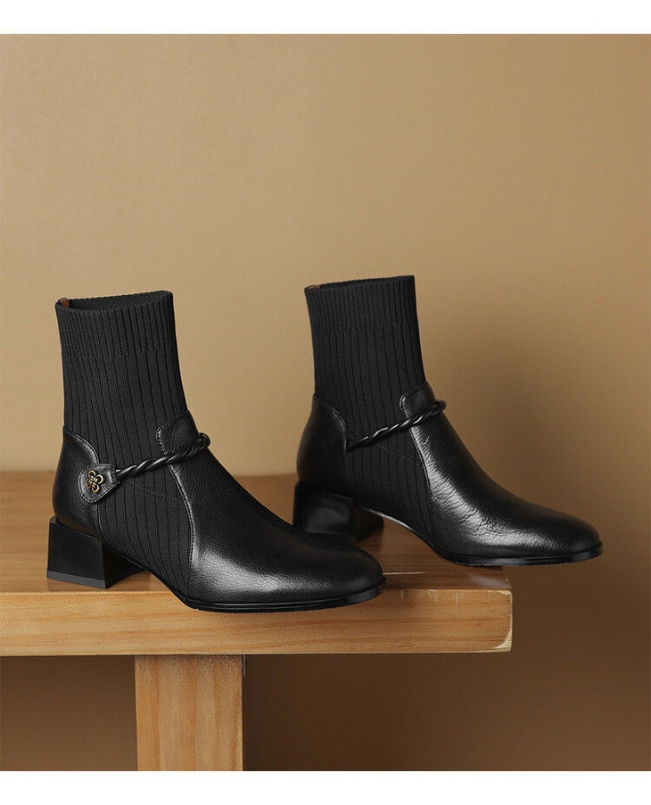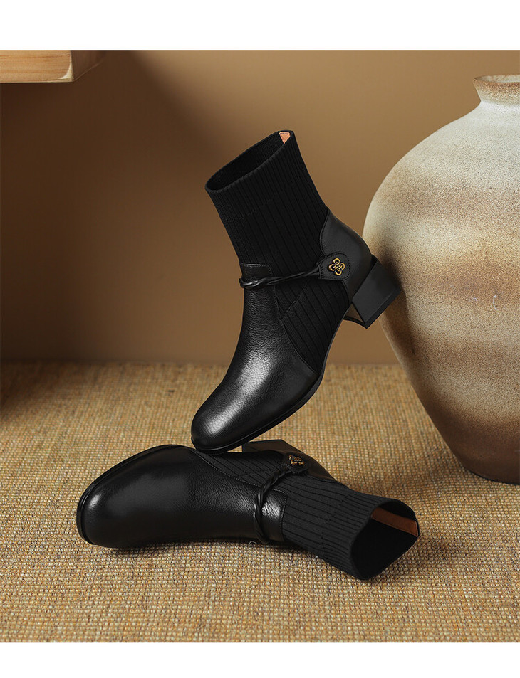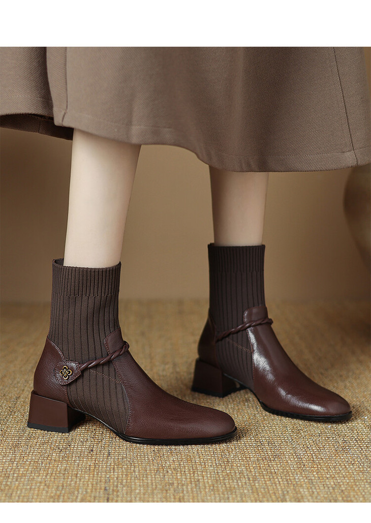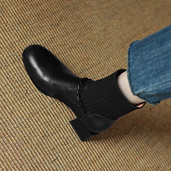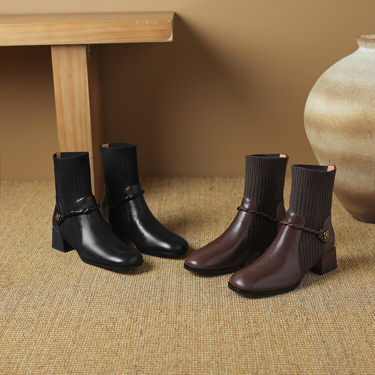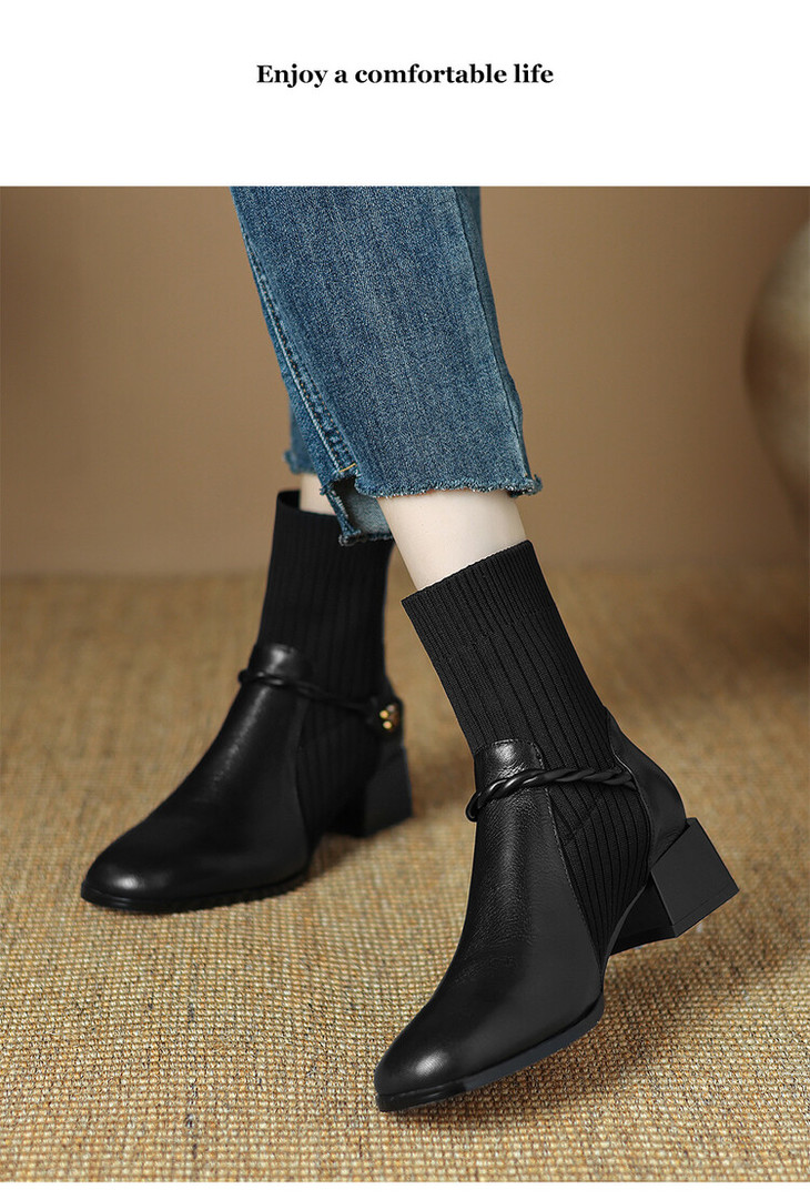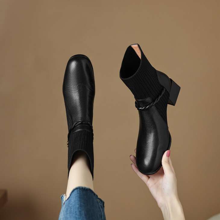 【预售5天】洋气小短靴春秋单靴圆头中跟粗跟真皮毛线口黑色棕色弹力袜靴LD&6943