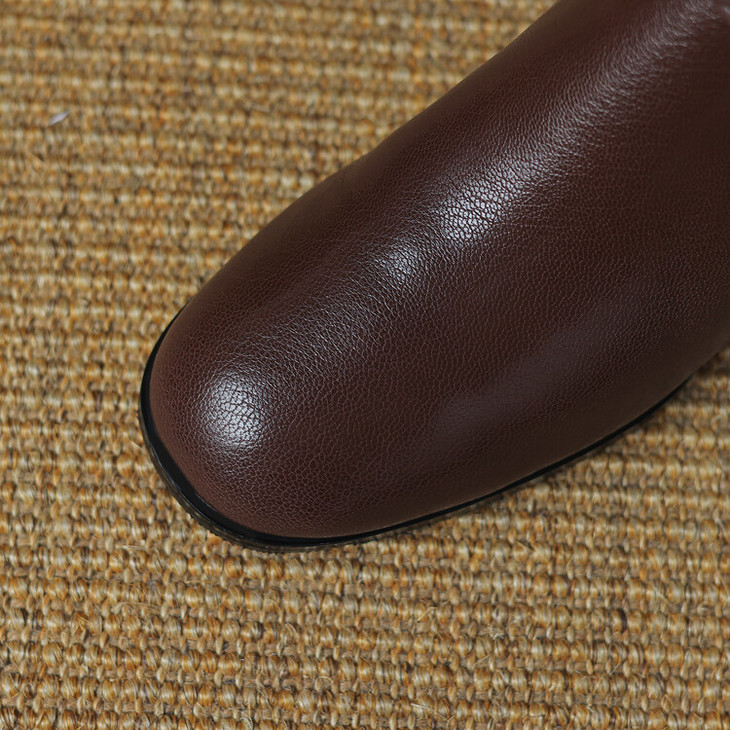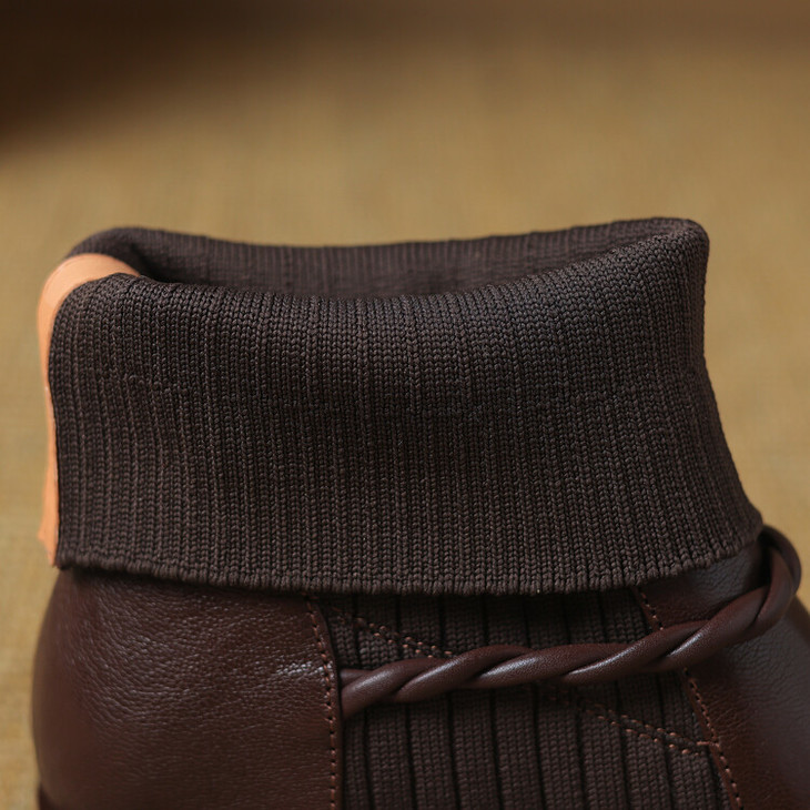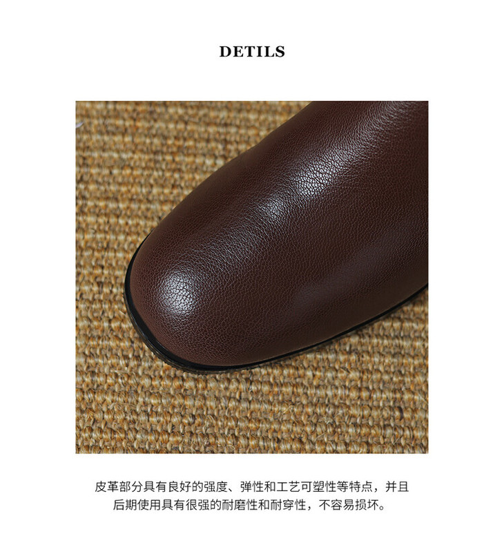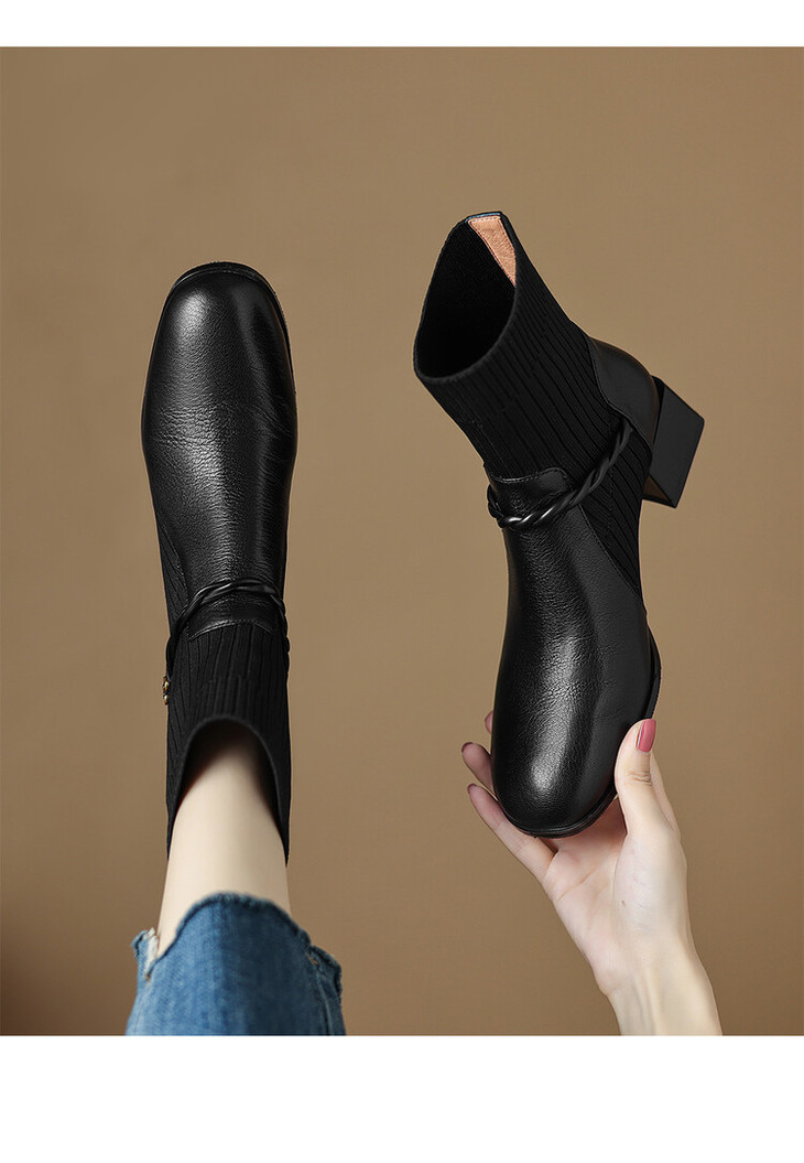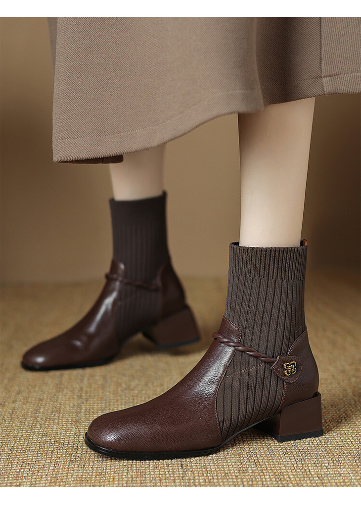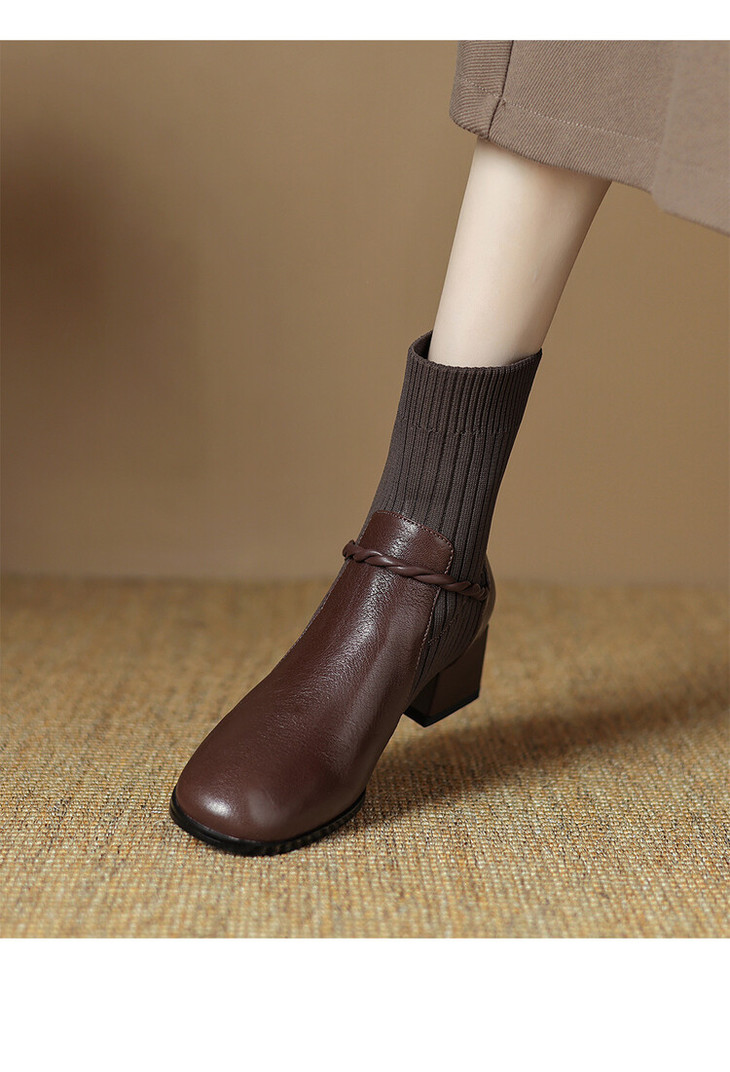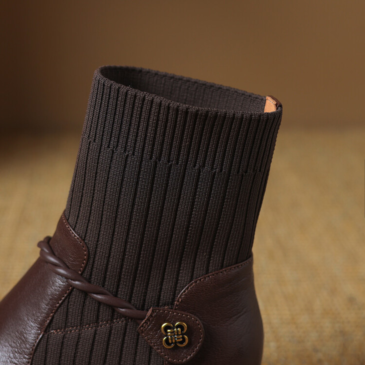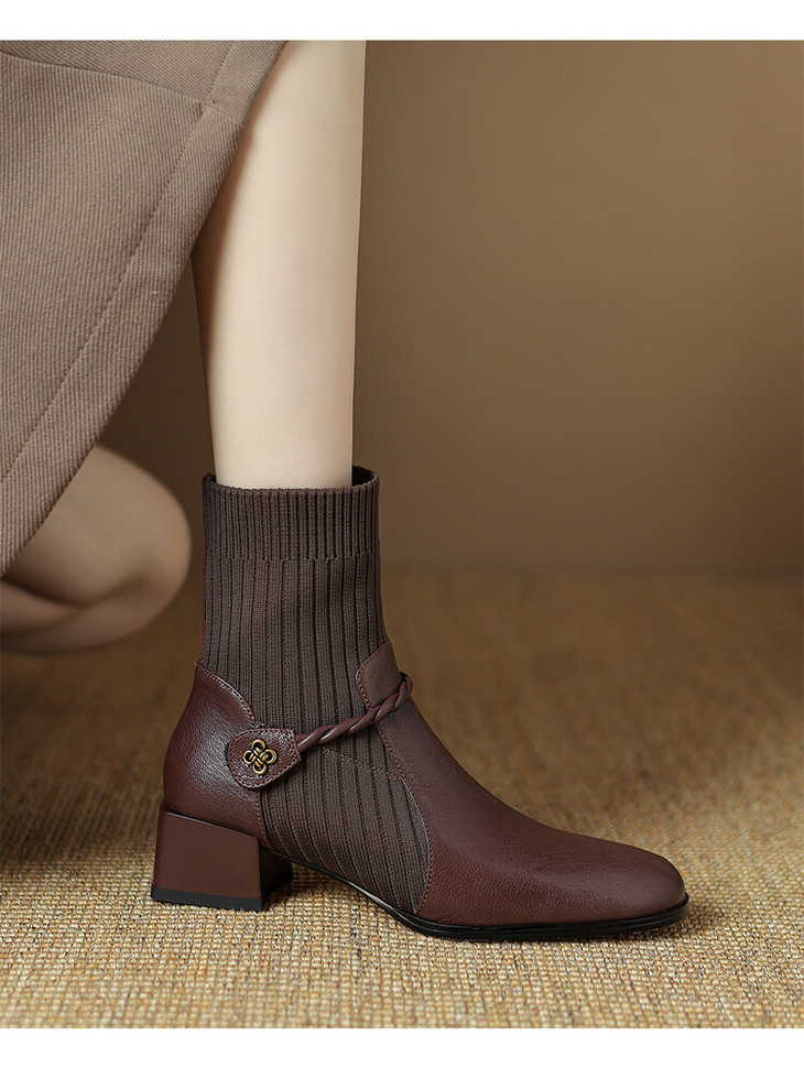 【预售5天】洋气小短靴春秋单靴圆头中跟粗跟真皮毛线口黑色棕色弹力袜靴LD&6943