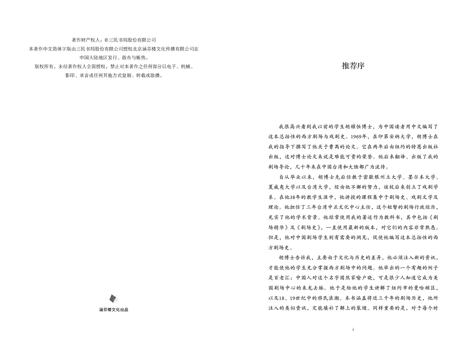 现在中国参与世界剧场的步伐豪迈,对于西方剧场与戏剧的知识总括,益处极多。《西方戏剧史》将方便中国艺术家们和西方同道之间的沟通,提供一些透视点,借以观察西方在三千年来所累积的丰厚遗产。