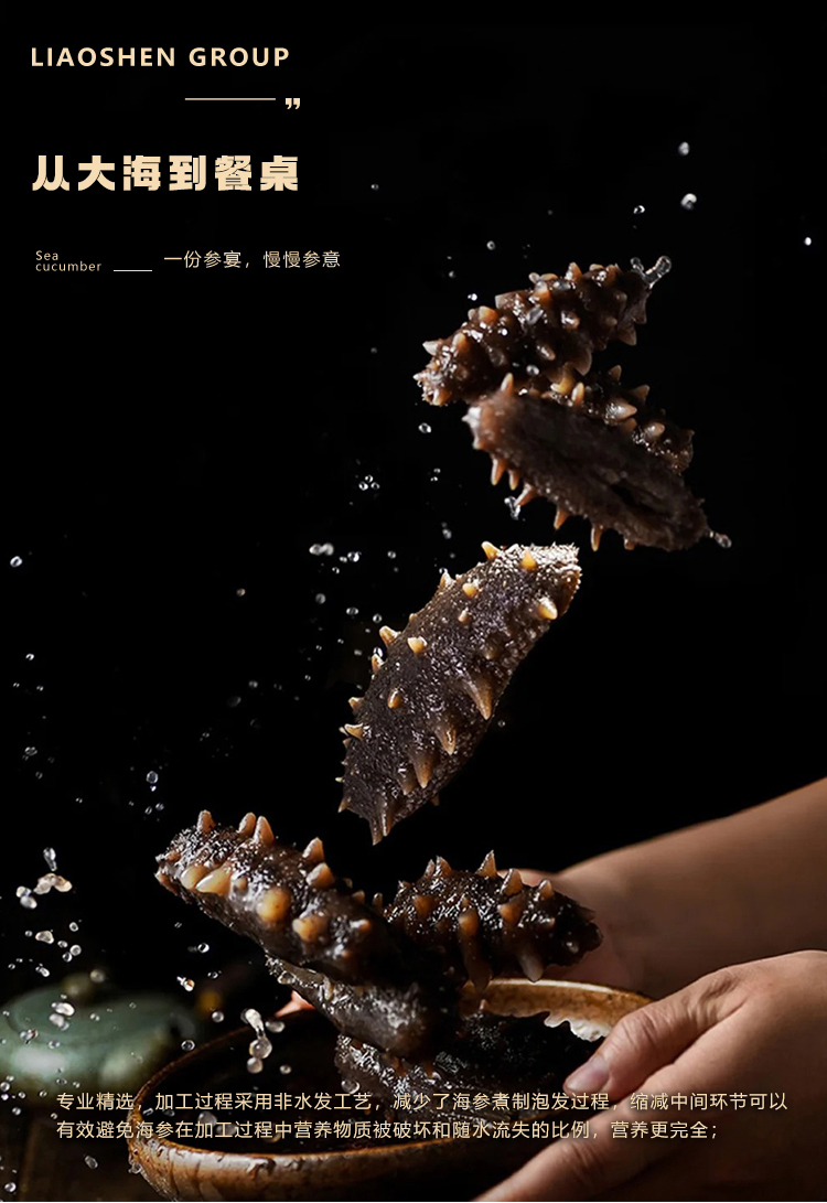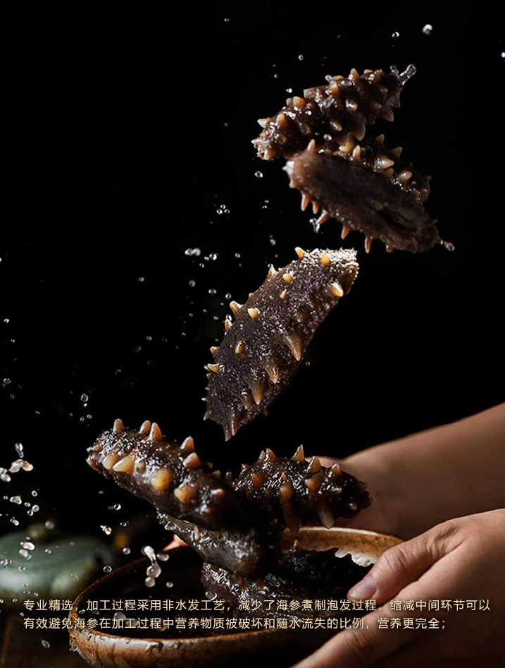 采用非水发工艺,整体加工过程,缩减海参煮制泡发等中间环节,鲜炖即食,营养保留更完全。
