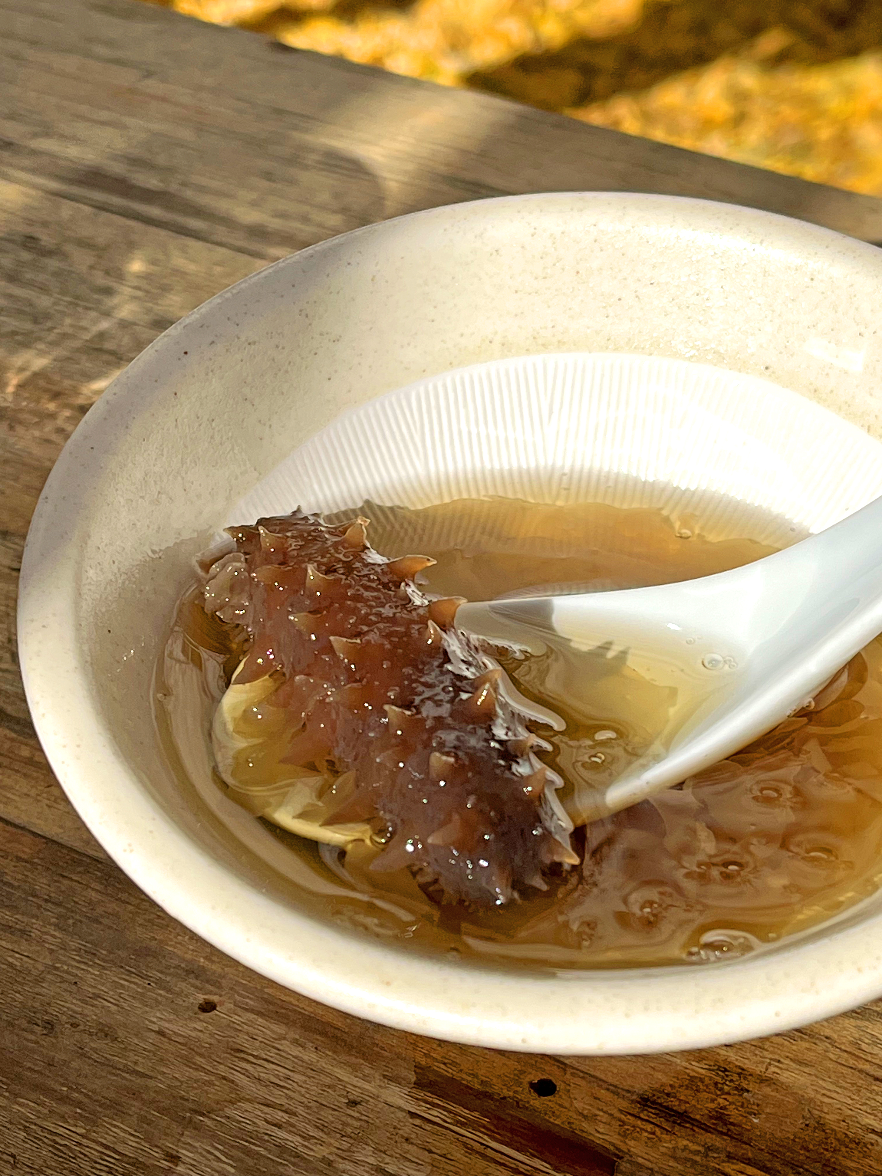 1、在加工之前,会给每一根辽参去沙嘴、做一次“全身SPA”:去除表面角质层,确保产品口感爽滑。