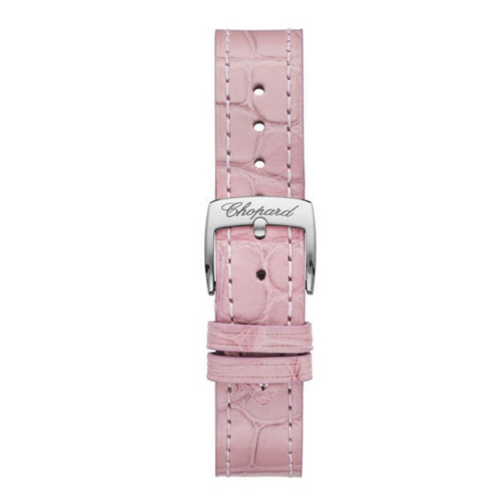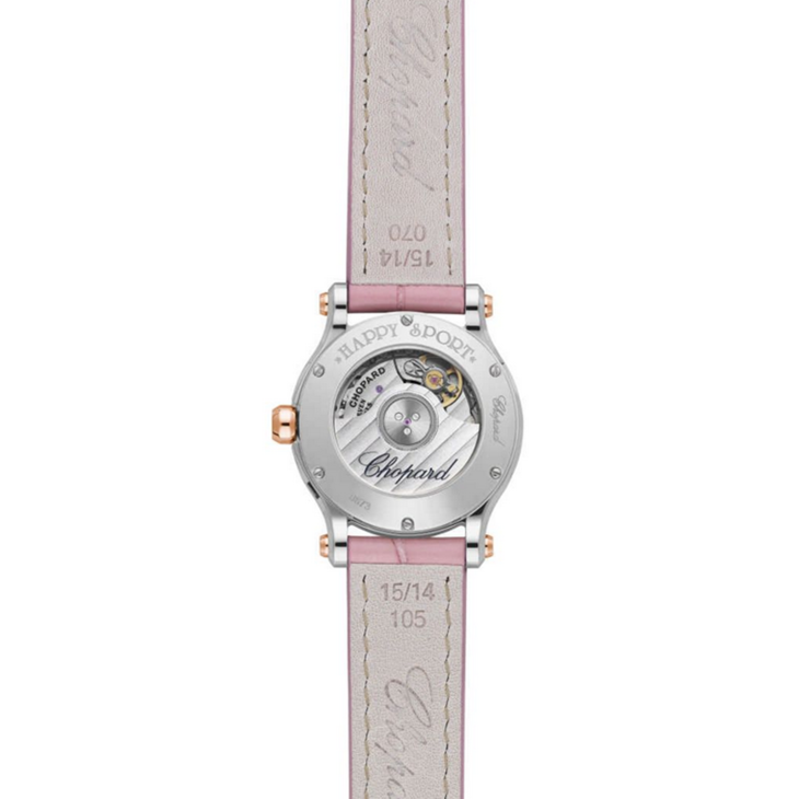 镜面材质 | 蓝宝石水晶玻璃 | 表盘 | 精钢 18K玫瑰金表壳 哑光粉色凹凸质感珍珠贝母表盘 罗马文及条形时标 5钻-钻石0.14克拉 透底,开放式表底盖通过螺丝固定,带有Happy Sport标志和防眩光蓝宝石水晶镜面 |
