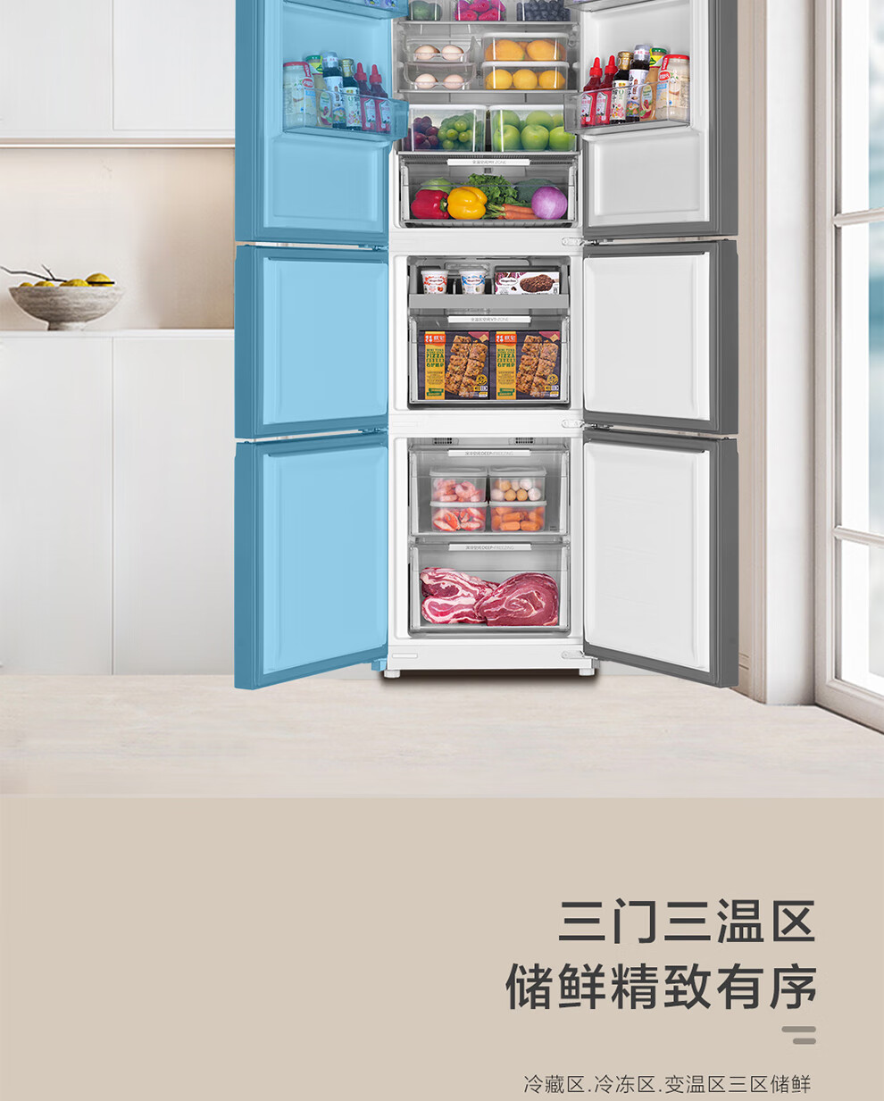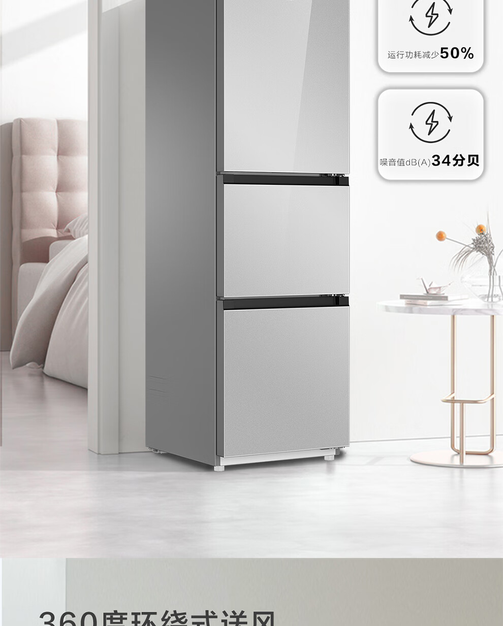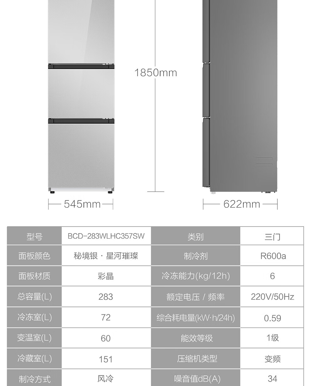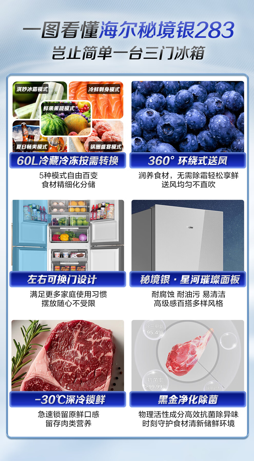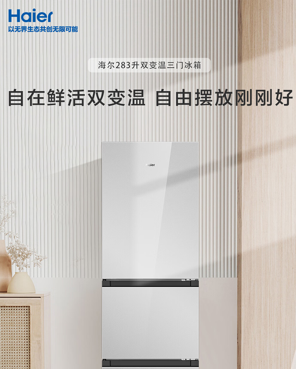 海尔冰箱三开门多门风冷无霜283升一级双变频节能彩晶玻璃面板小户型优选高颜值电冰箱【新品】 【三门三温区+黑金净化+深冷速冻】BCD-283WLHC357SW