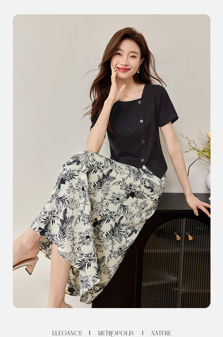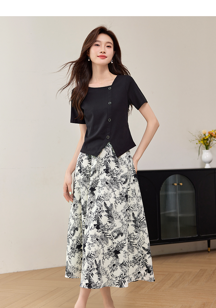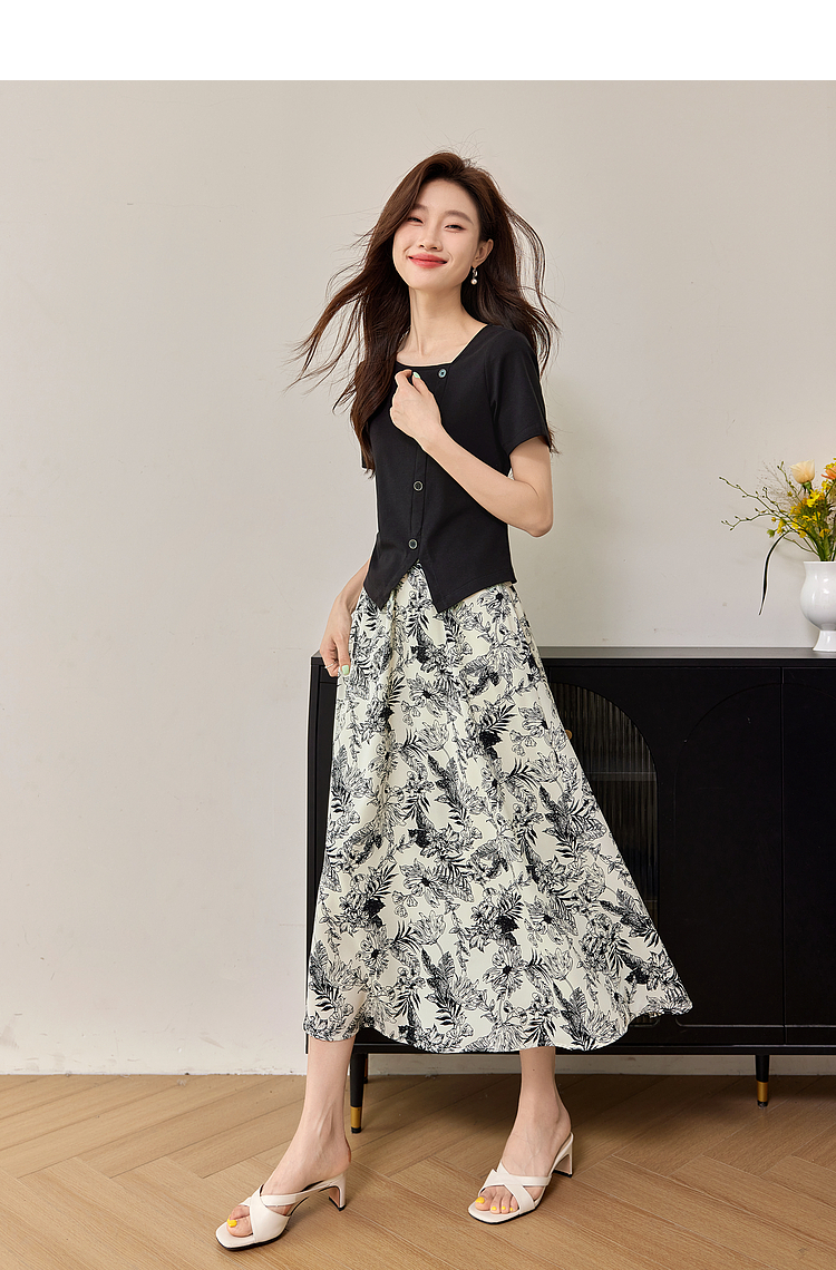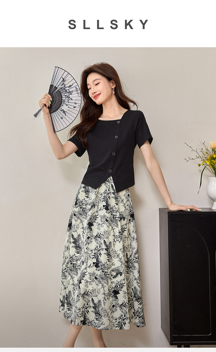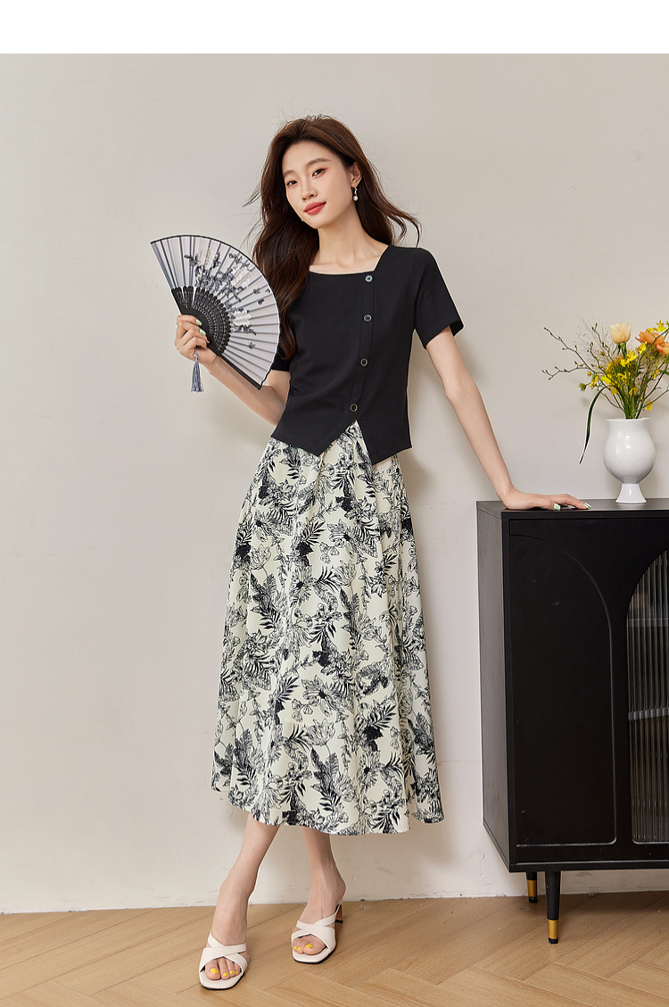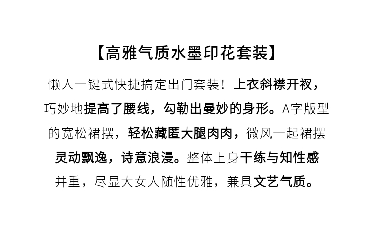 【专属特价】熙世界气质国风水墨印花套装夏装不规则方领T恤半身裙子两件套