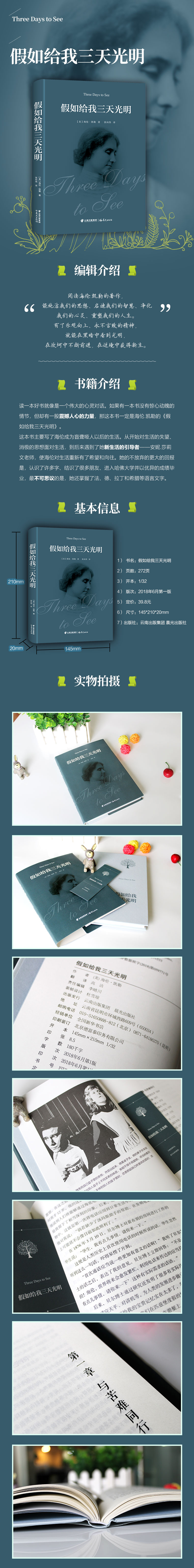 读一本好书就像是与一个伟大的心灵对话。如果有一本书没有惊心动魄的情节,但却有一股震撼人心的力量,那这本书一定是海伦·凯勒的《假如给我三天光明》。这是一本有眼泪、有欢笑,也有启迪的书。老实说,这本书的故事并不算精彩,可是却让人心中久久不能平静。这是因为书里的主人公,即本书的作者实在是一个了不起的人。