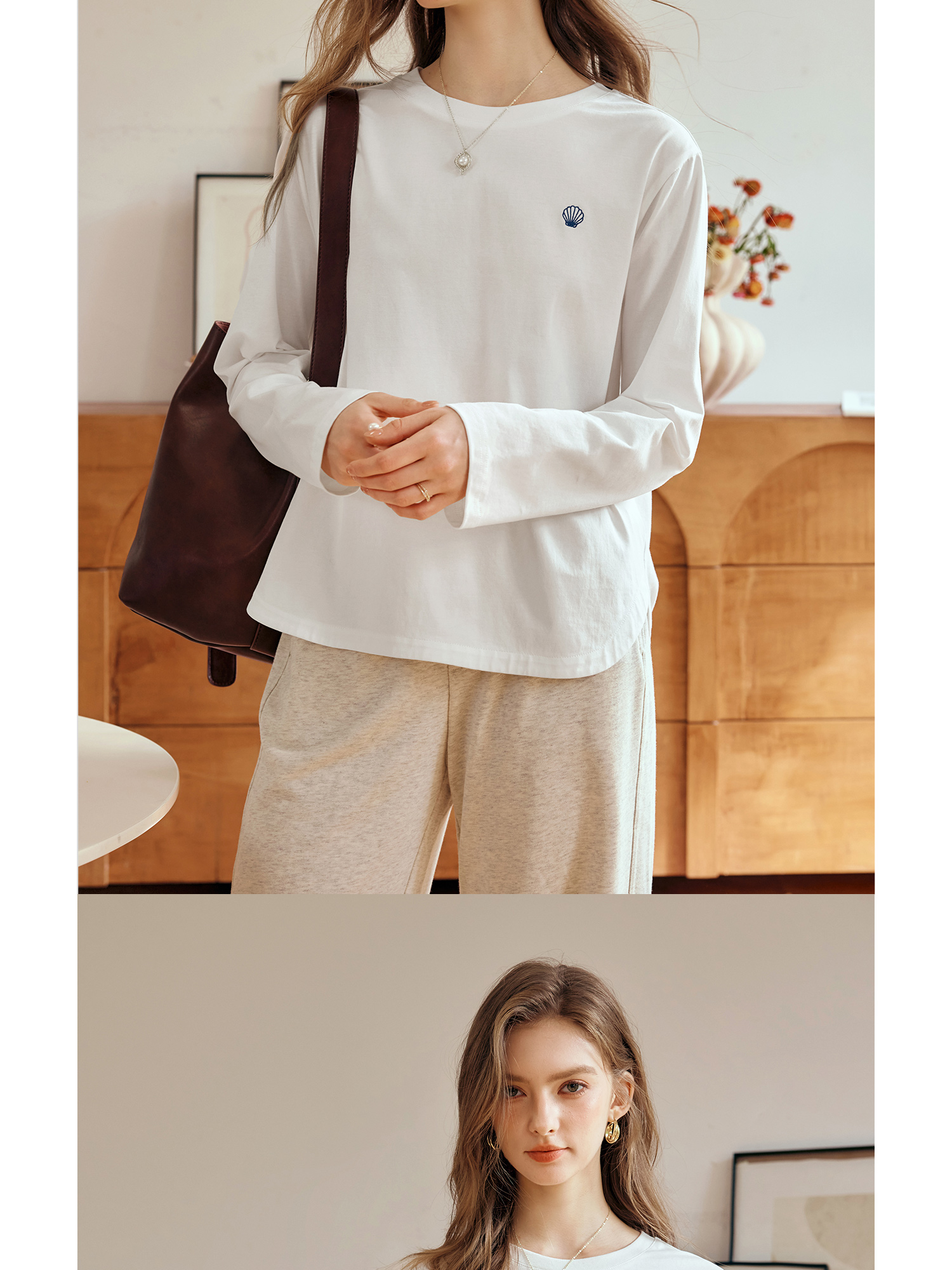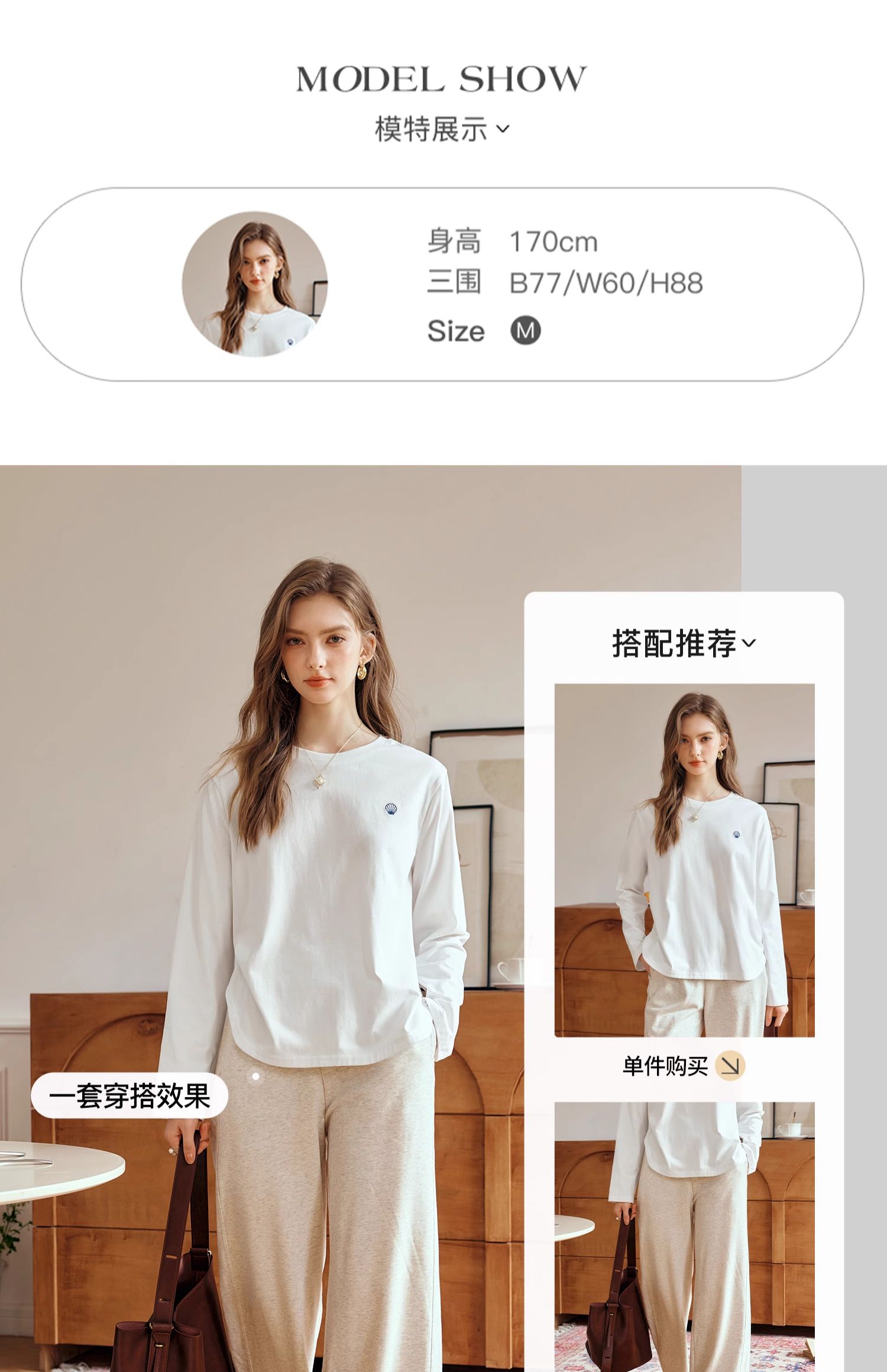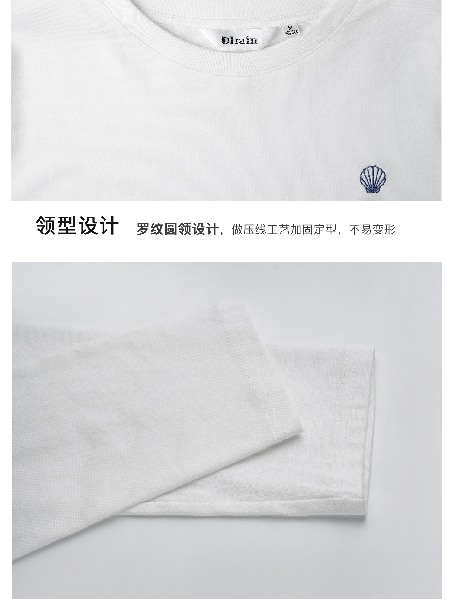 OLrain欧芮儿纯棉白色长袖T恤女秋季2024年新款圆领刺绣休闲上衣