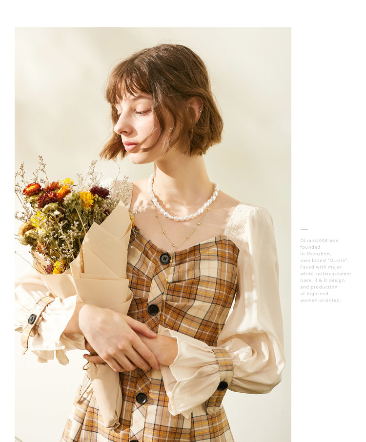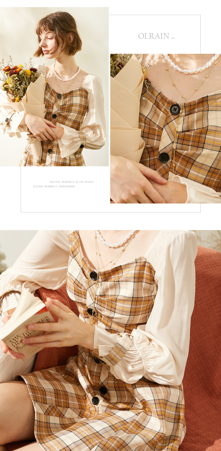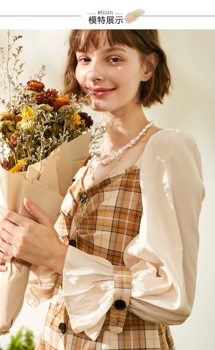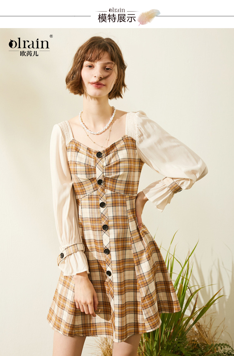 欧芮儿2019秋新品方领长袖格子连衣裙女中长款小个子拼接包臀裙