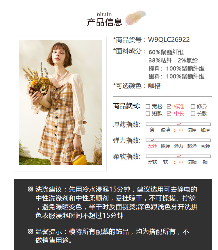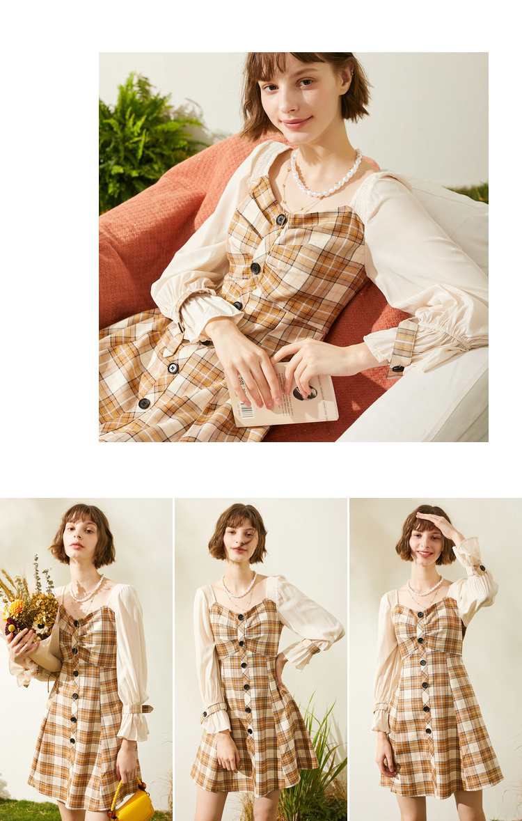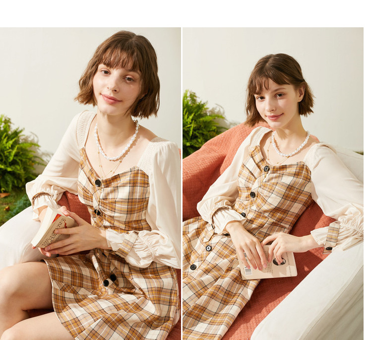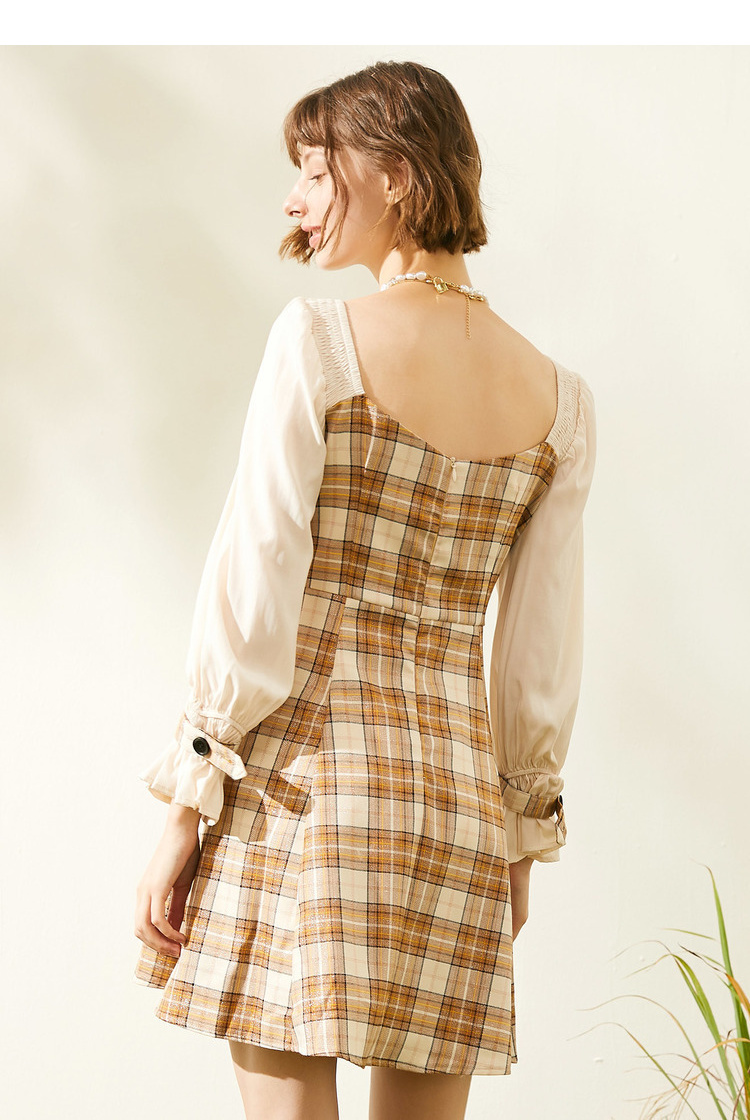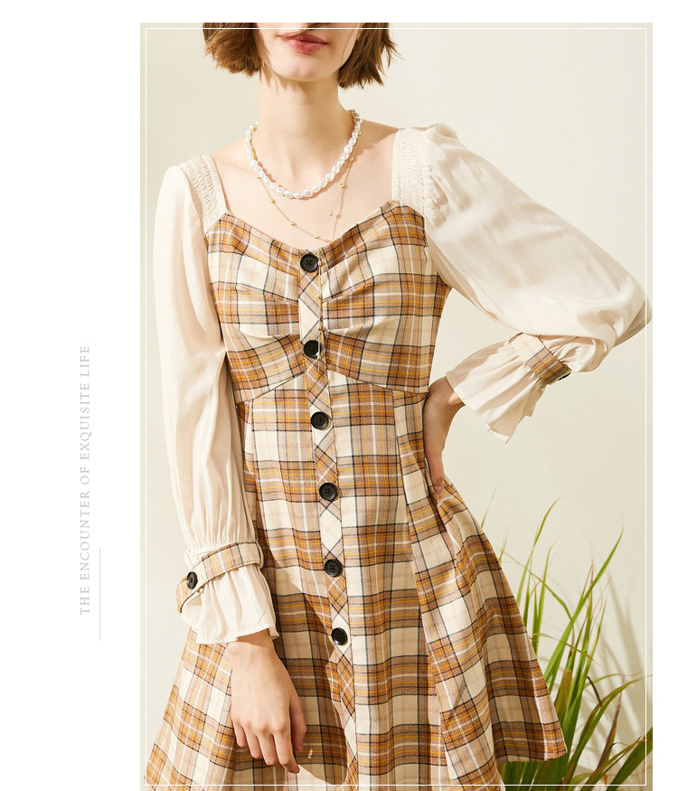 欧芮儿2019秋新品方领长袖格子连衣裙女中长款小个子拼接包臀裙