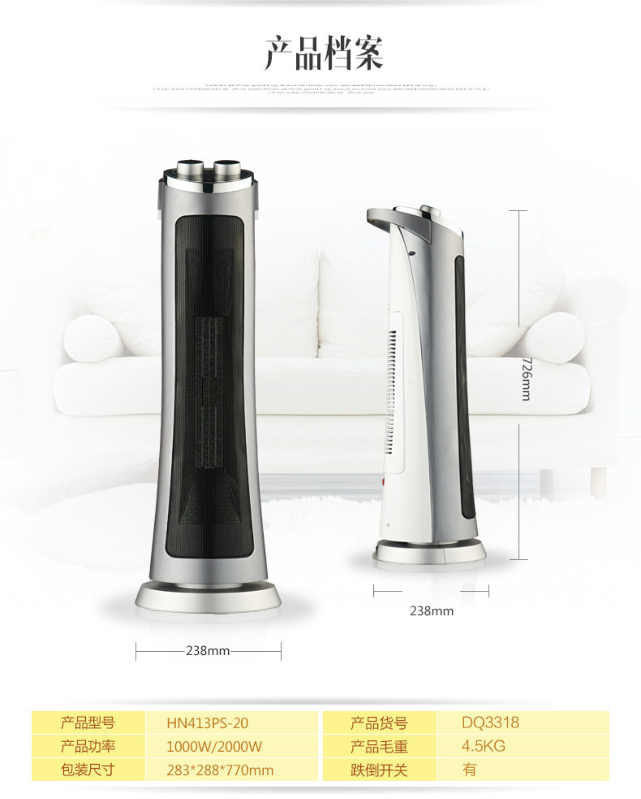 先锋取暖器DQ3318/HN413PS-20塔式家用暖风机速热电暖器摇头暖气