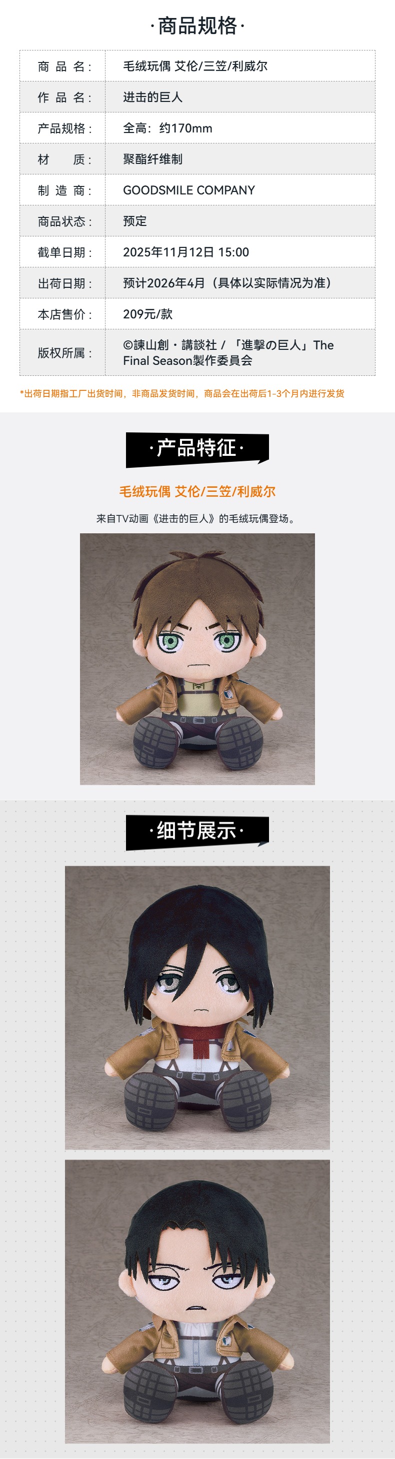 【GSC预售定金】毛绒玩偶 艾伦/三笠/利威尔 进击的巨人 手办模玩