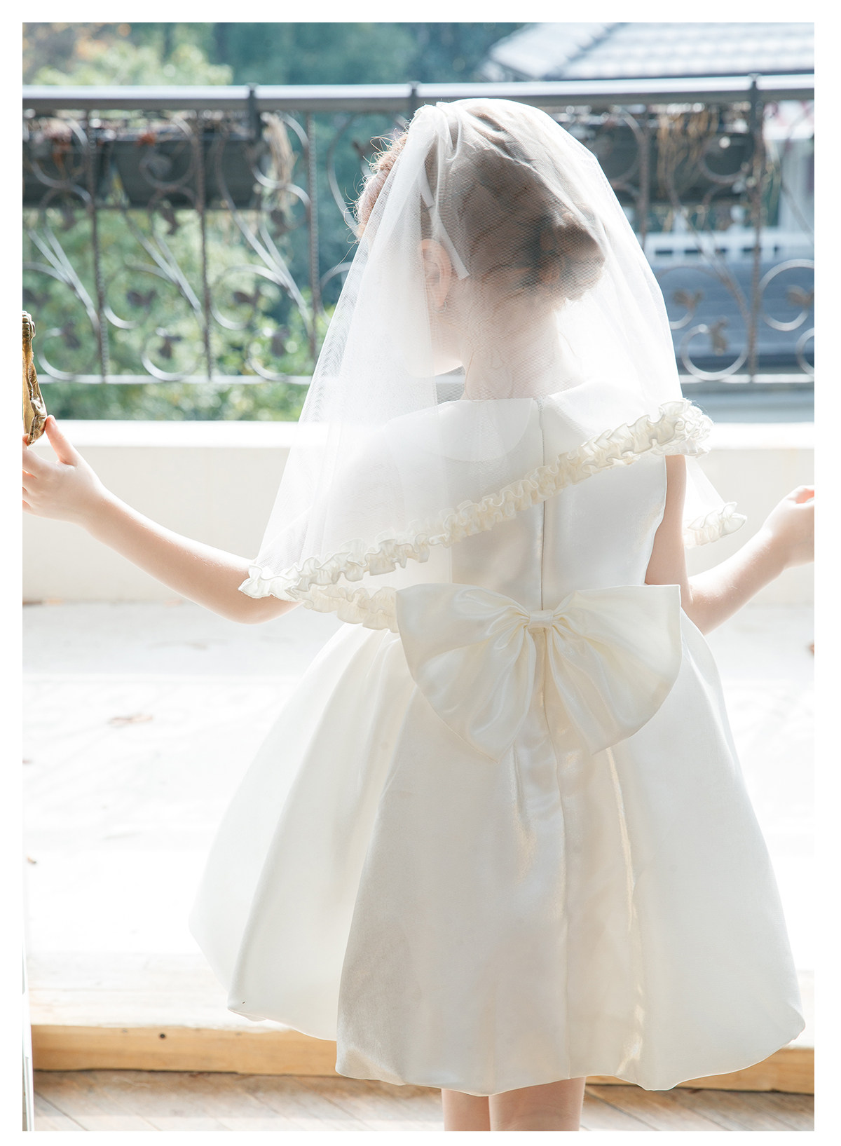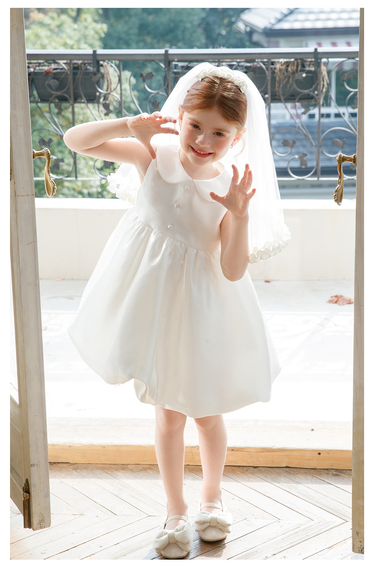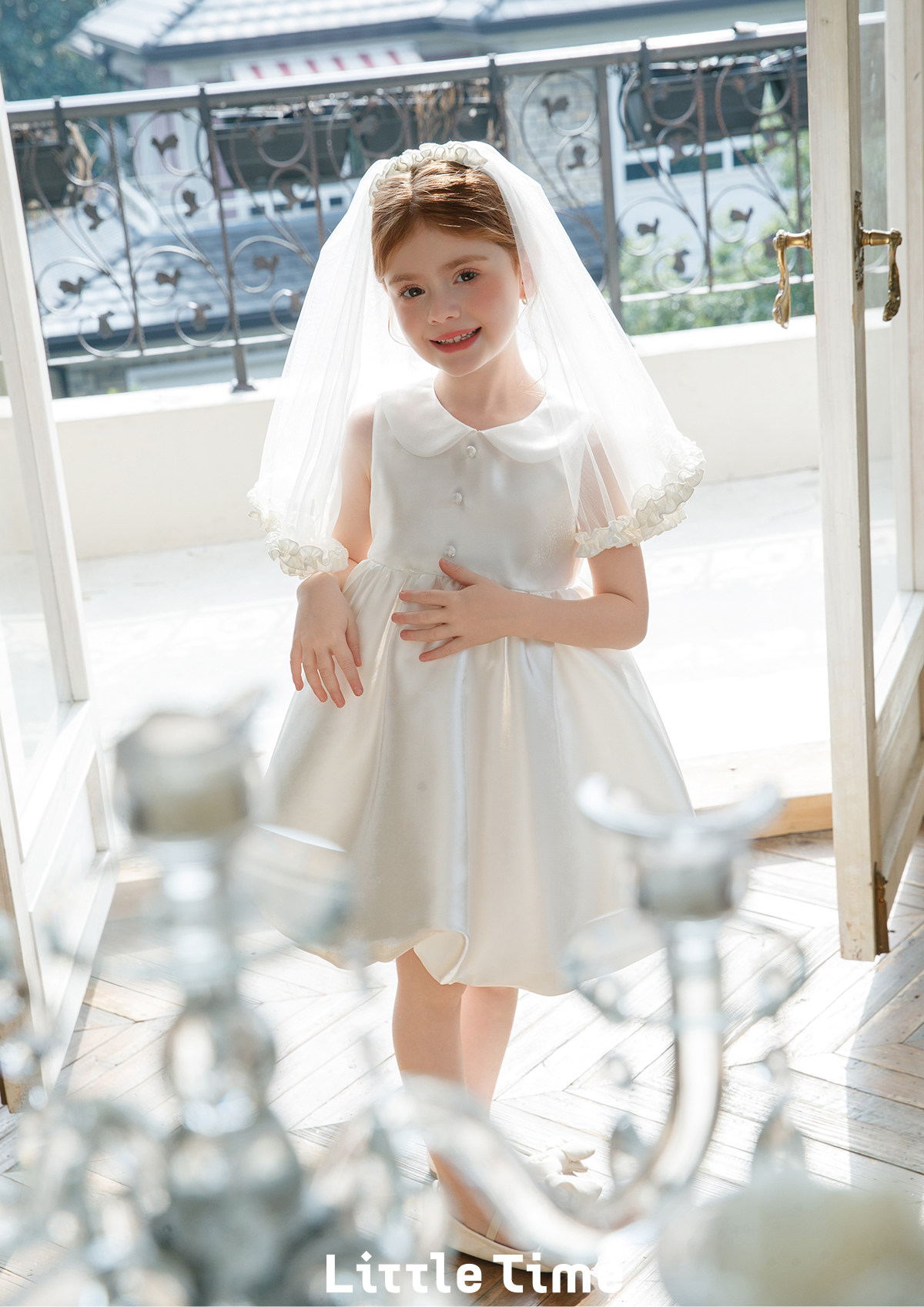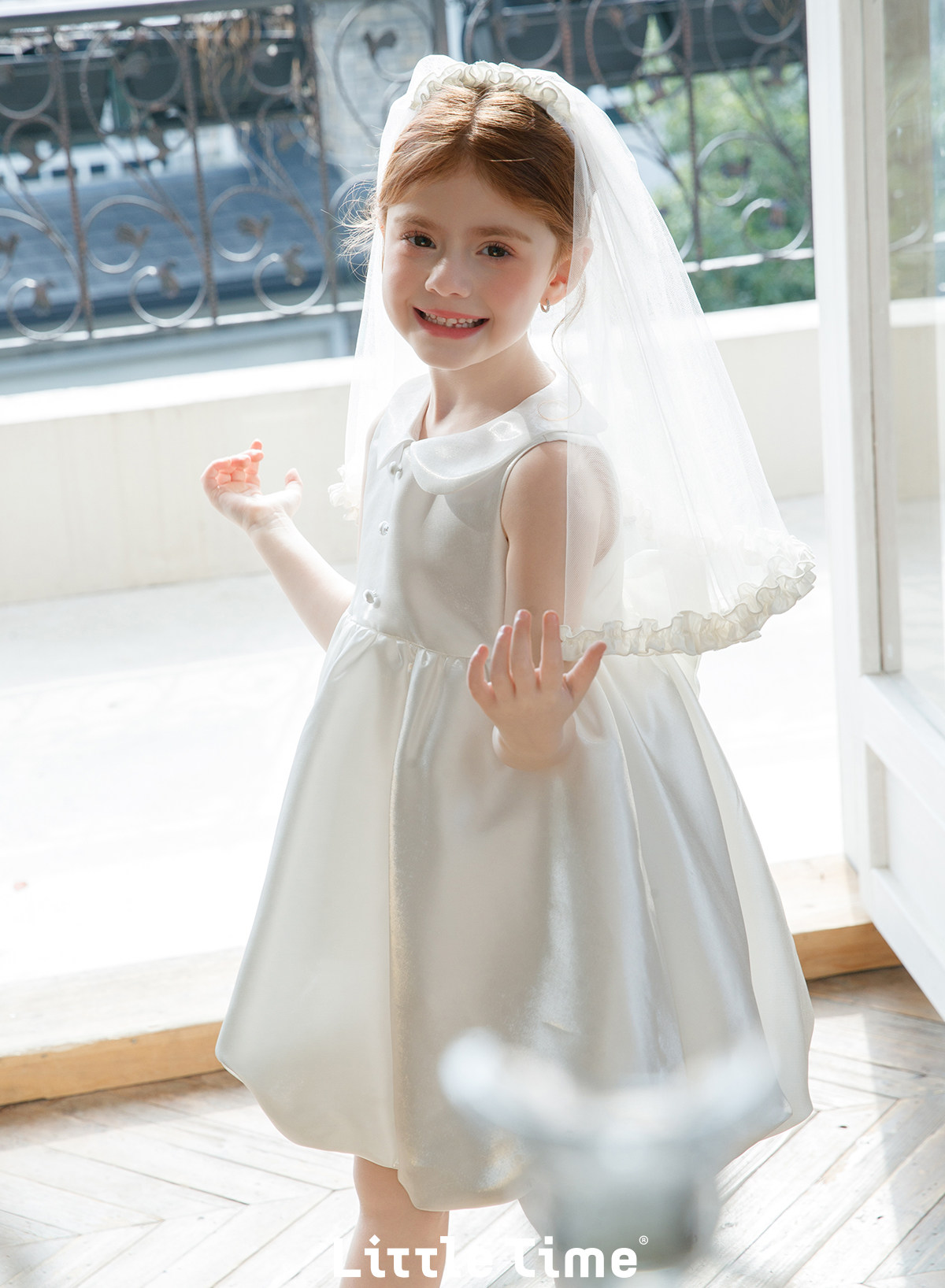 littletime白色娃娃领泡泡袖韩式婚礼水光缎花童婚纱连衣裙带头纱