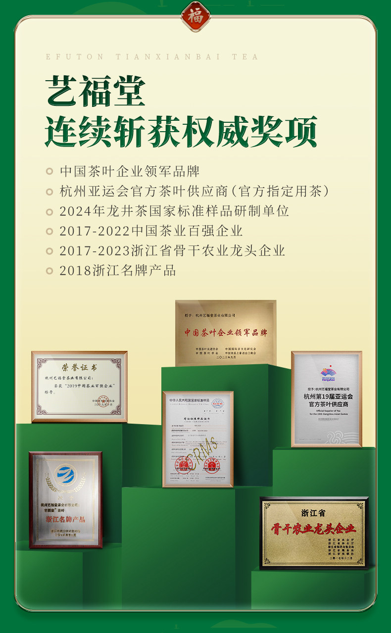 - “艺福堂茶业”创立于2008年,是一家集生产、销售、科研为一体的现代茶业企业,主打西湖龙井,兼营世界各地名优茗茶及花草茶,是中国茶行业为数不多的年销售额过5亿的品牌之一,是杭州亚运会官方指定用茶!