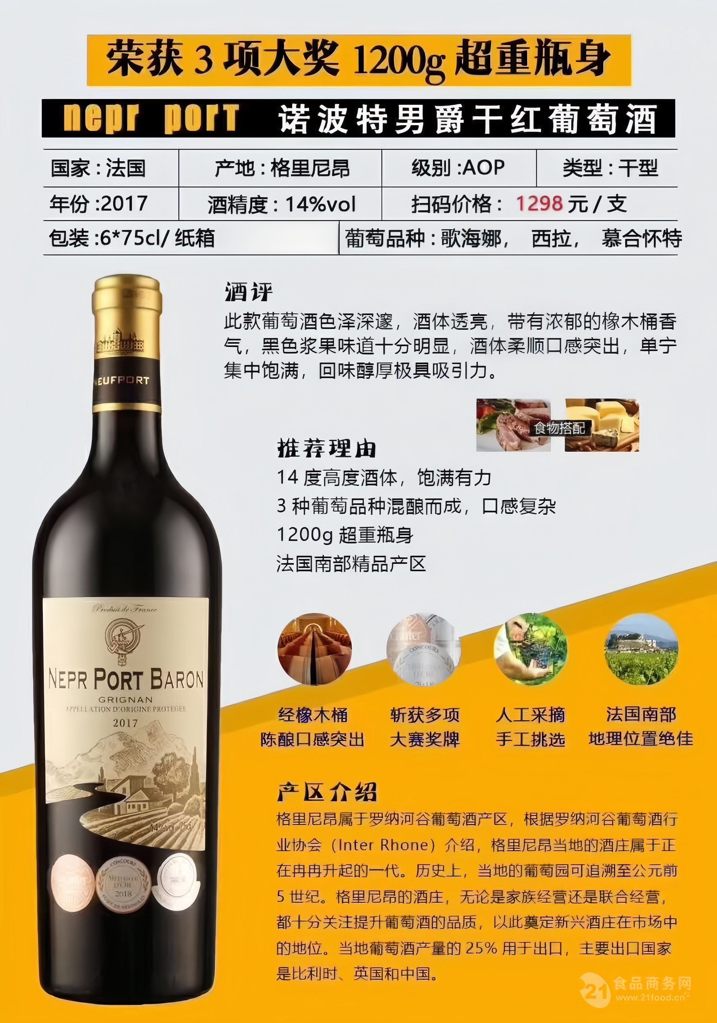 诺波特男爵干红葡萄酒 法国原瓶进口 AOP 14%vol 750ml