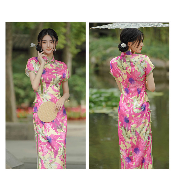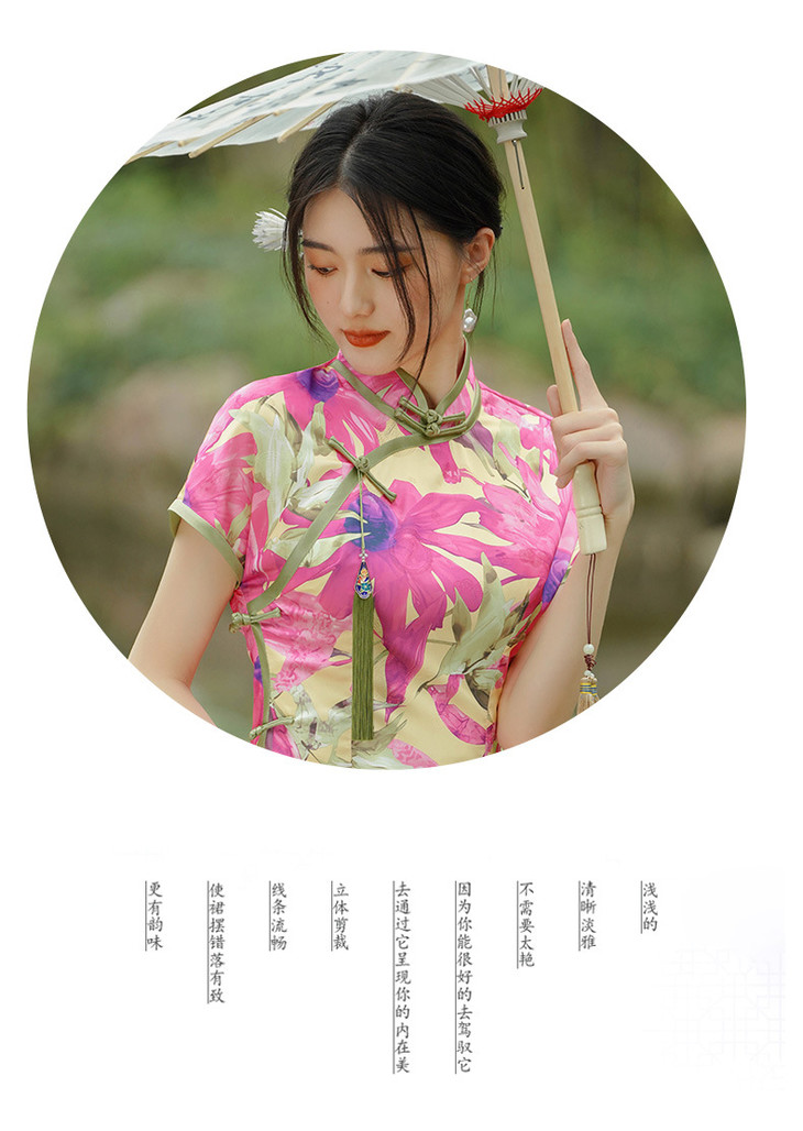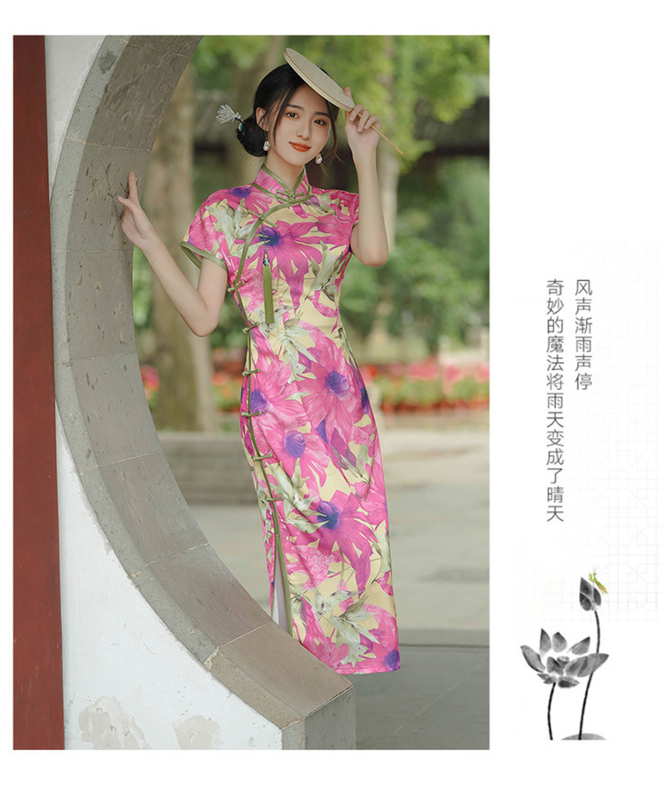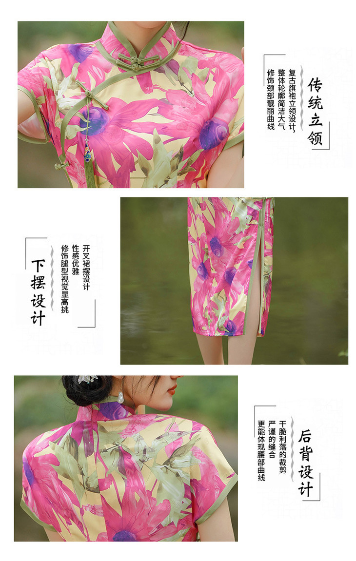 夏季新中式国风盘扣低开叉粉色芍药印花改良旗袍GSJ-3373