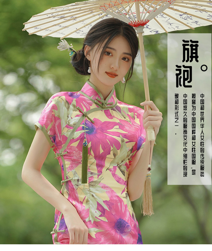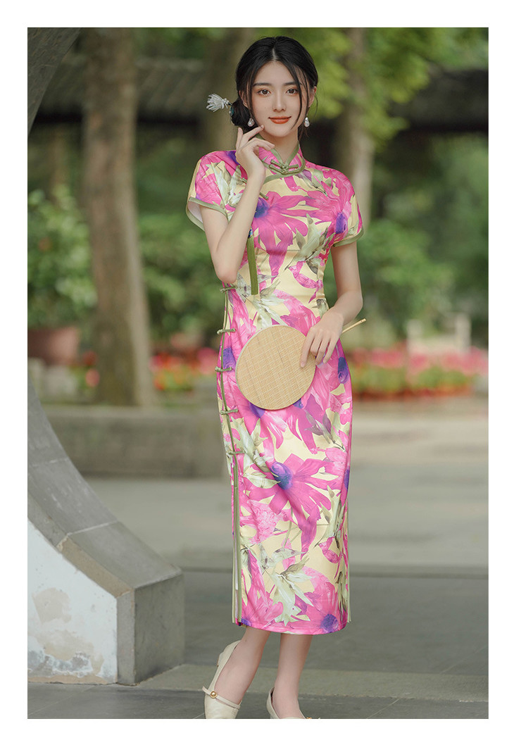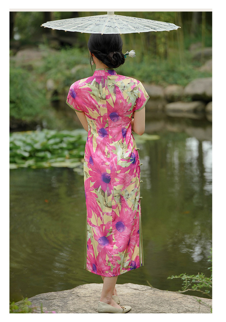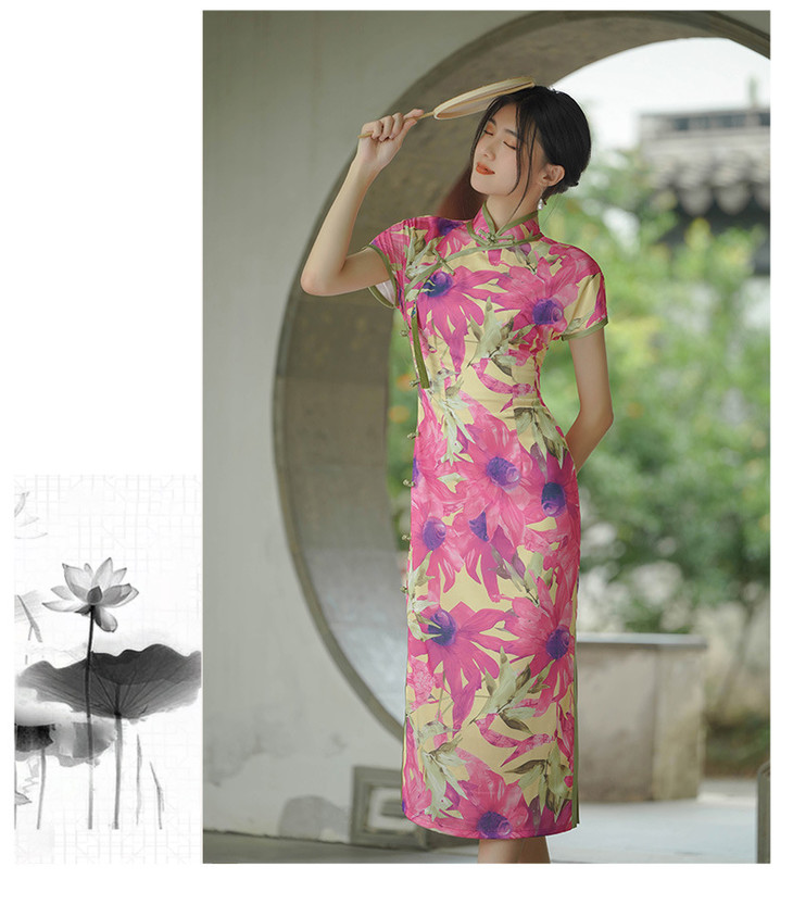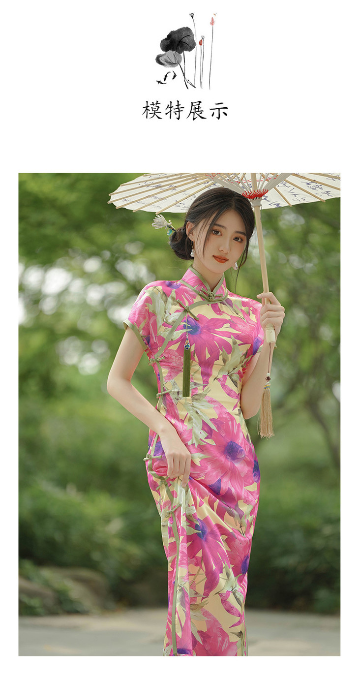 夏季新中式国风盘扣低开叉粉色芍药印花改良旗袍GSJ-3373