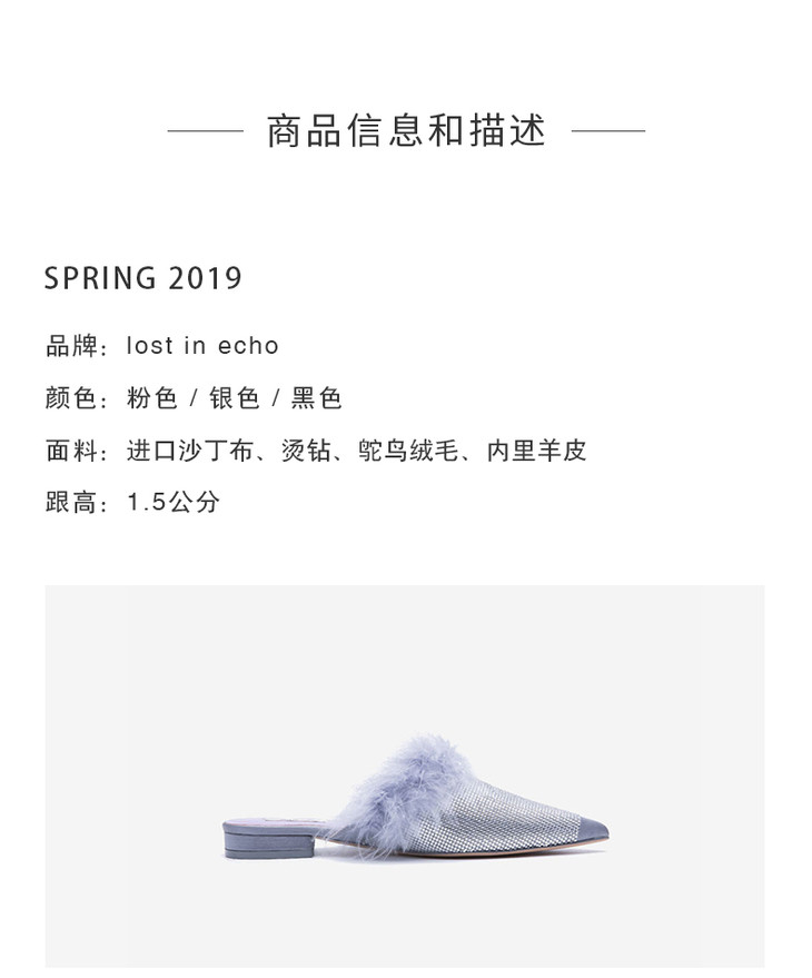 lost in echo进口鸵鸟毛满钻平底穆勒鞋 时尚银色尖头低跟女鞋