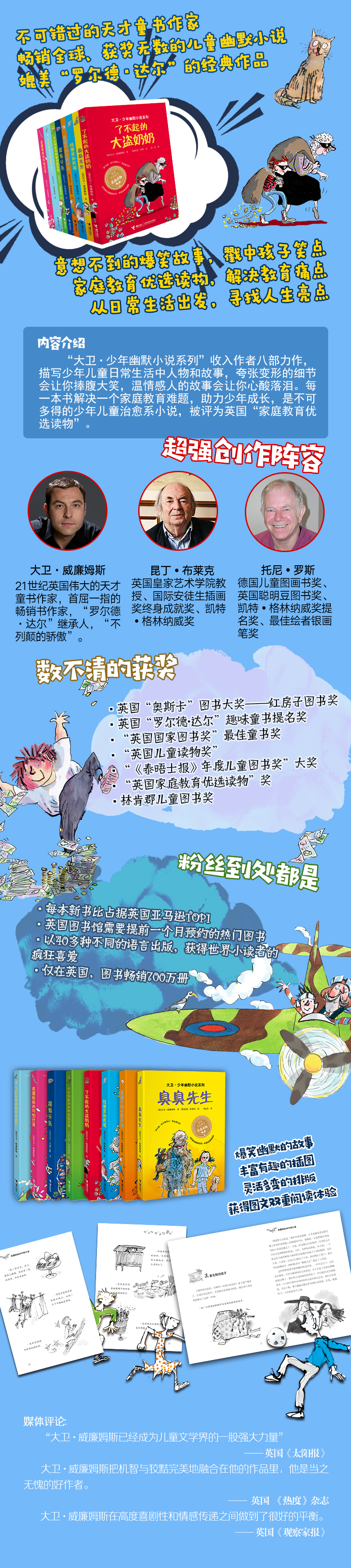“大卫 少年幽默小说系列”收入作者八部力作。作品描写的是少年儿童生活中常见的人物和故事,夸张变形的细节会让你捧腹大笑,温情感人的故事会让你心酸落泪。这种幽默诙谐和新奇故事的巧妙编织,让读者在体味生命、命运、财富、性别角色的同时,照亮心灵,驱赶心灵阴影,缓解心理压力,体现了作者超常的生活和创作智慧,是不可多得的少年儿童治愈系小说,是英国“家庭教育优选读物”。