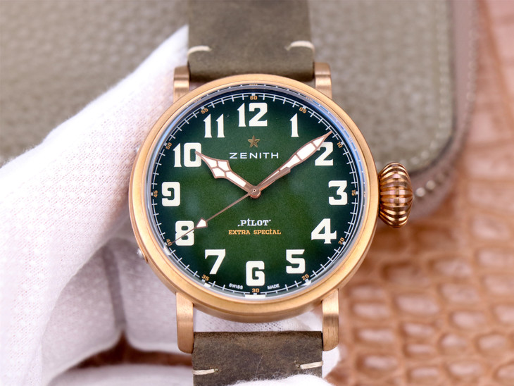 腕表45毫米的表壳由青铜打造,表镜采用弧形双面防眩处理蓝宝石水晶,浅变绿色表盘上粗体阿拉伯数字时标和镀金琢面的指针上都覆有SuperLuminova SLN C3超级夜光物料,夜间仍可清晰读取时间,SV 真力时飞行员系列,实现你的大飞梦