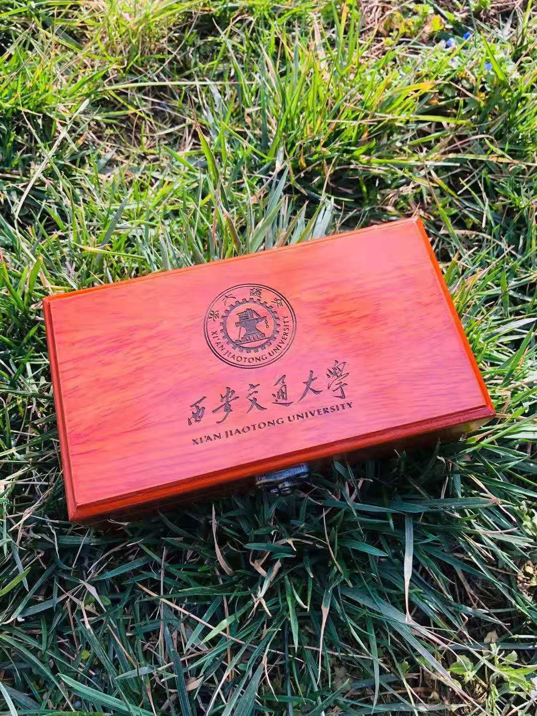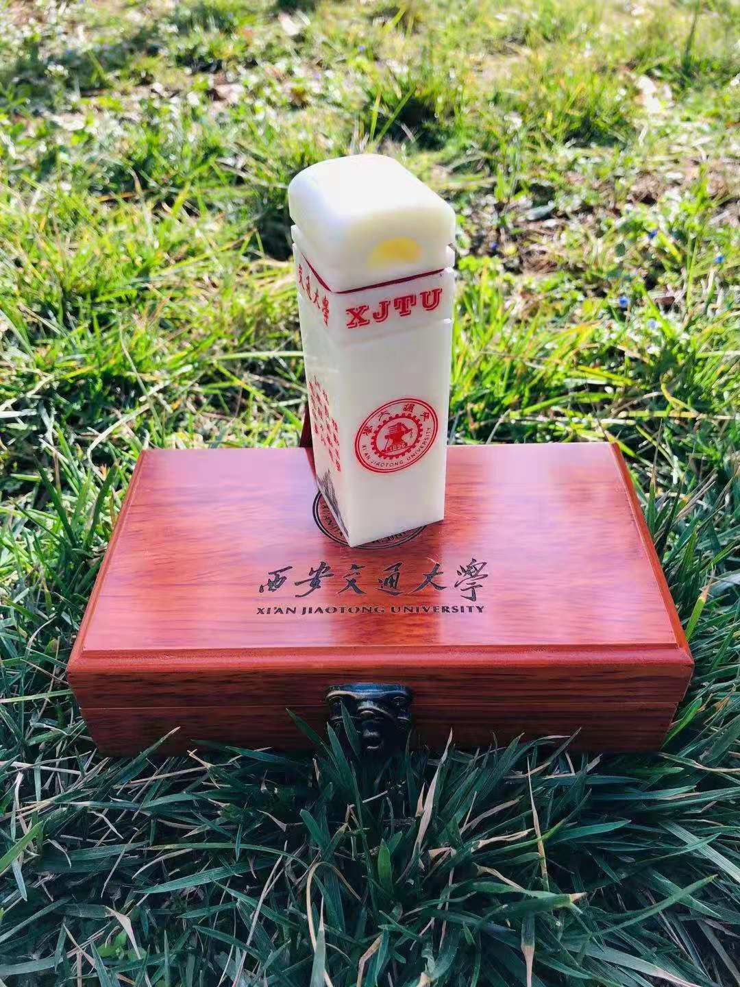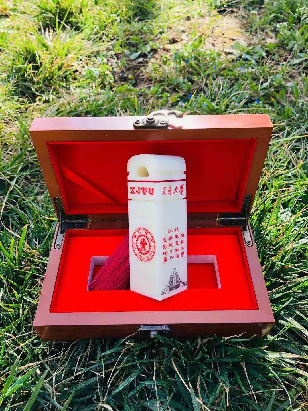 蓝田玉是中国非常古老且传统的玉石,玉石中镌刻李交通大学的校训,还有交大校徽,最下面的图案是钱学森图书馆。