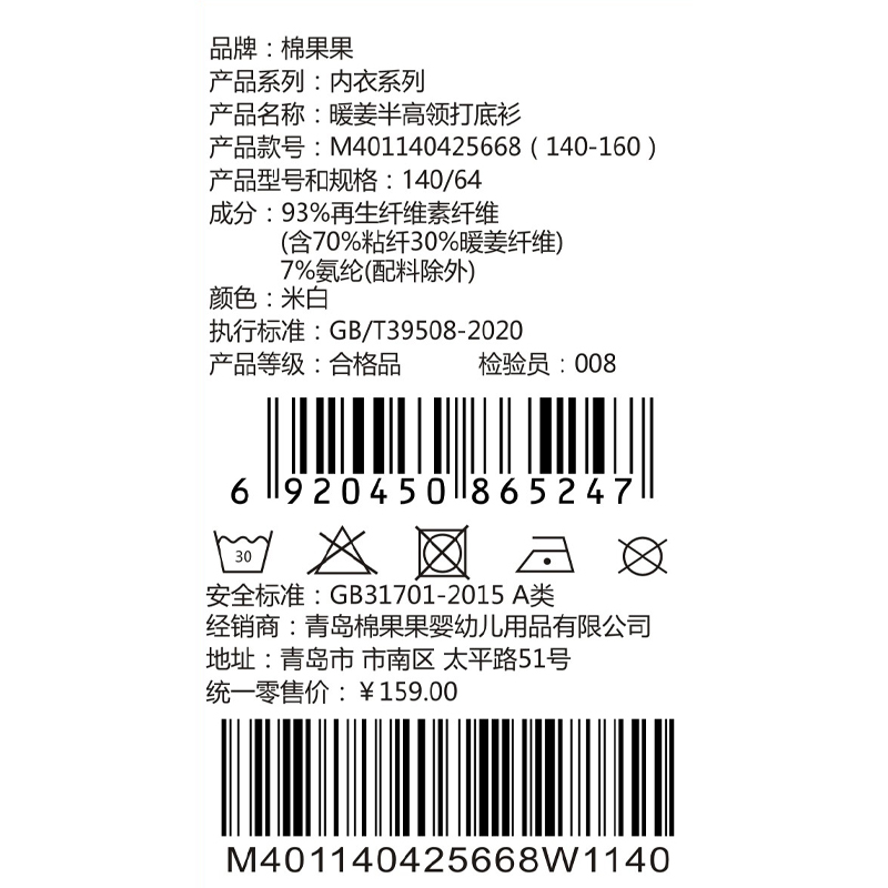 棉果果冬季新品暖姜棉柔软保暖140-160码大码中大童暖姜半高领打底衫M401140425668