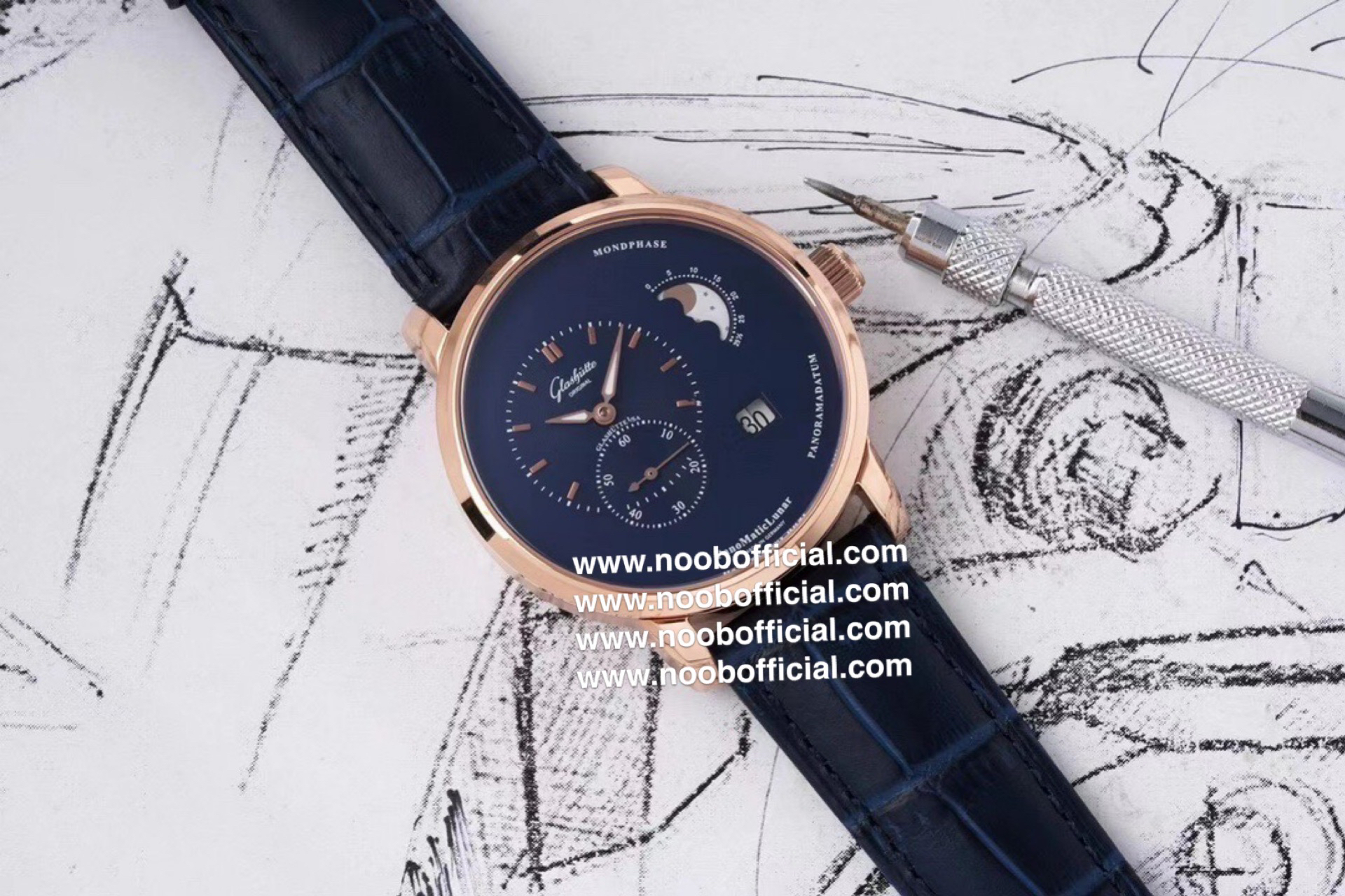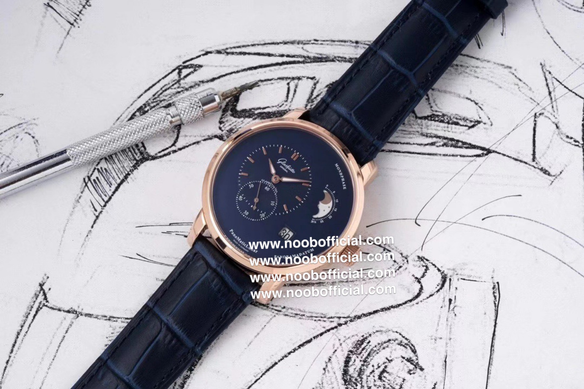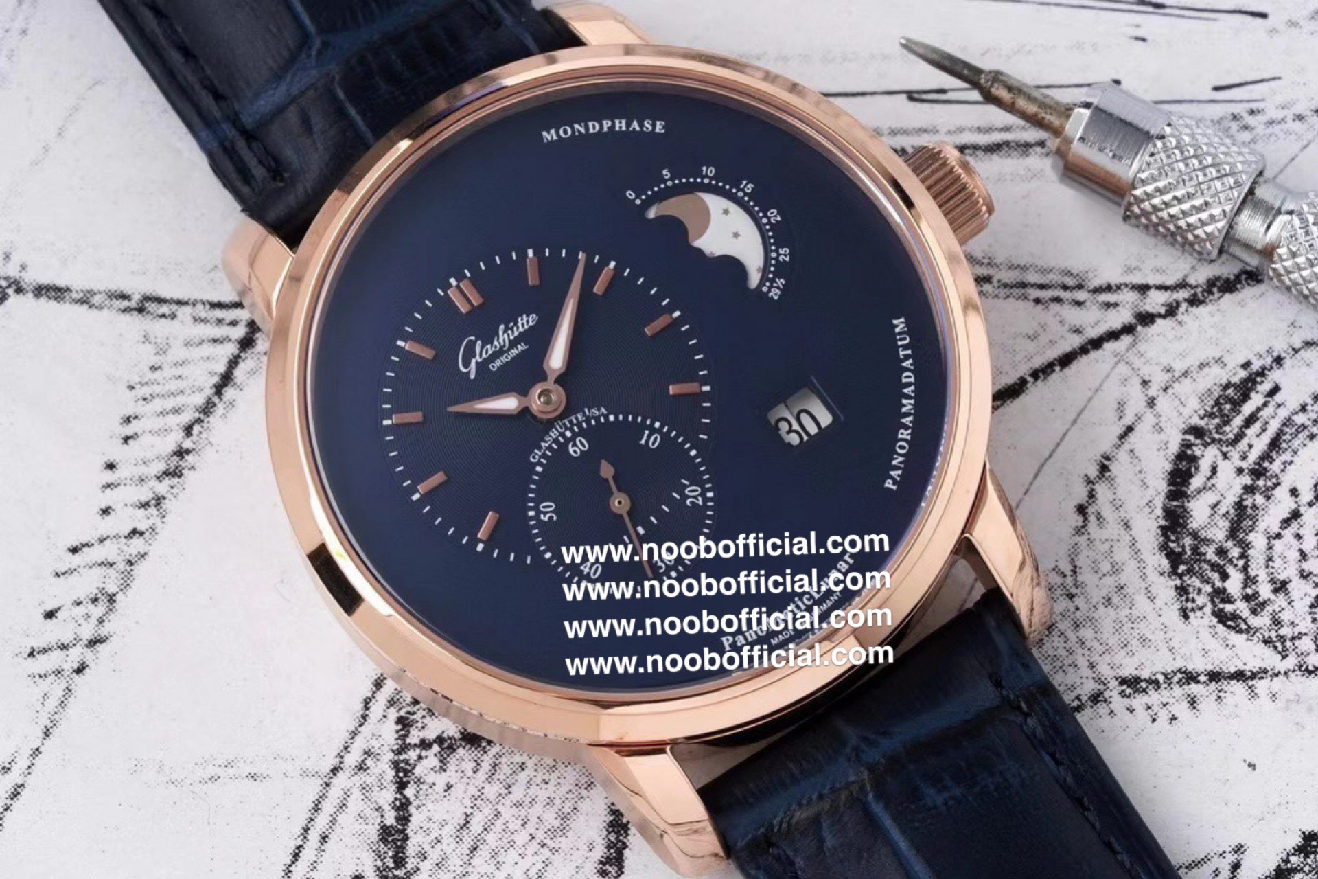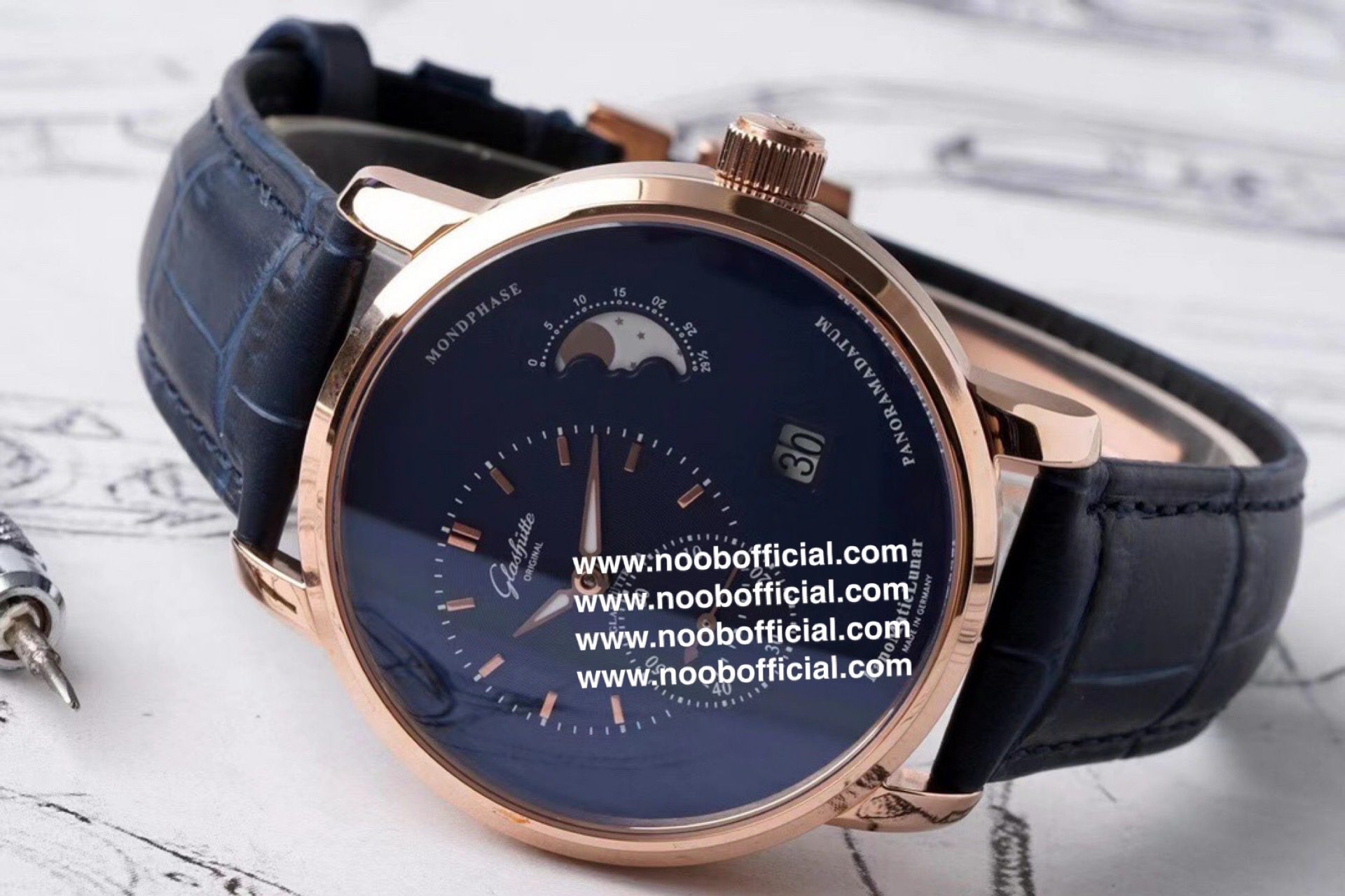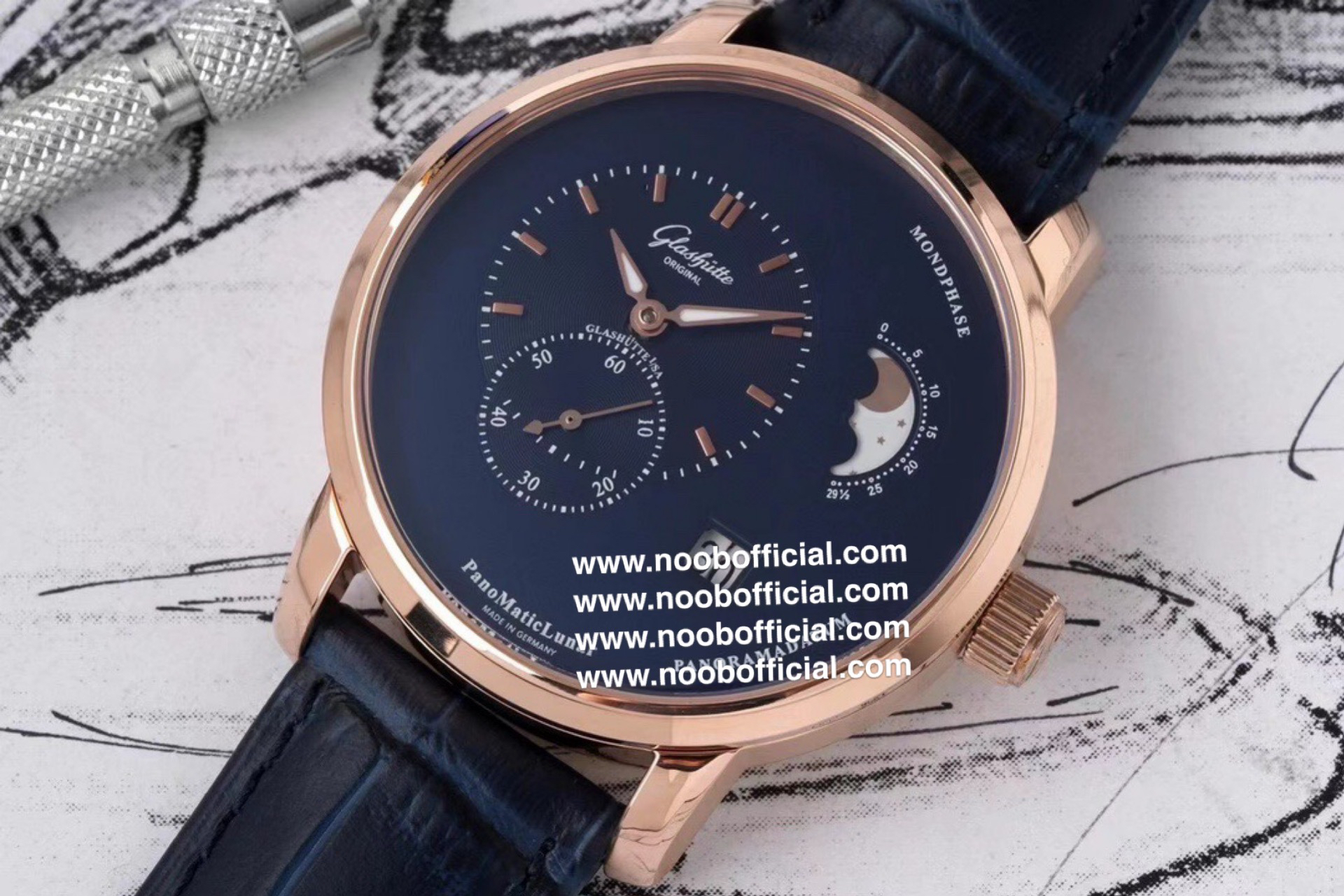 NOOB工厂最有“德味儿”的腕表———格拉苏蒂原创90偏心大日历月相,订制机芯的双跳大日历显示,日期显示的个位和十位并不在同一个日期圈上,有两个独立的显示盘,采用双模组设计