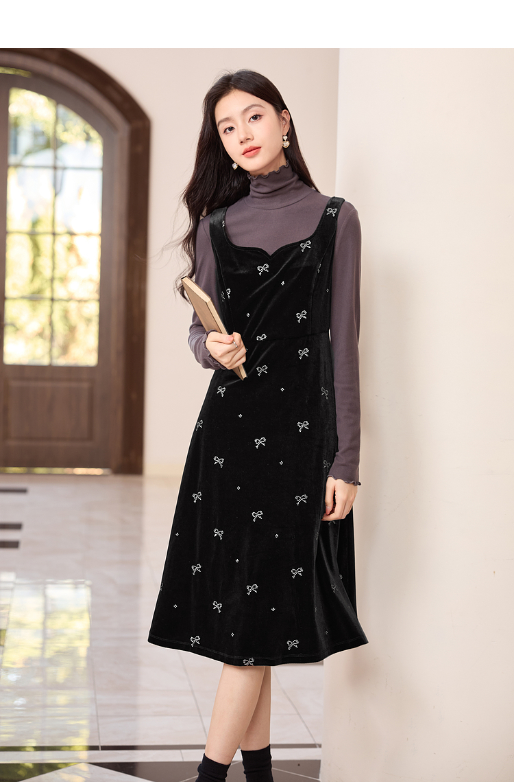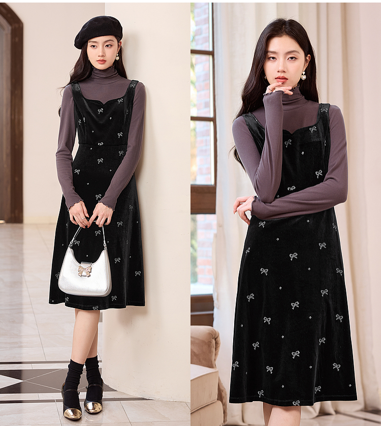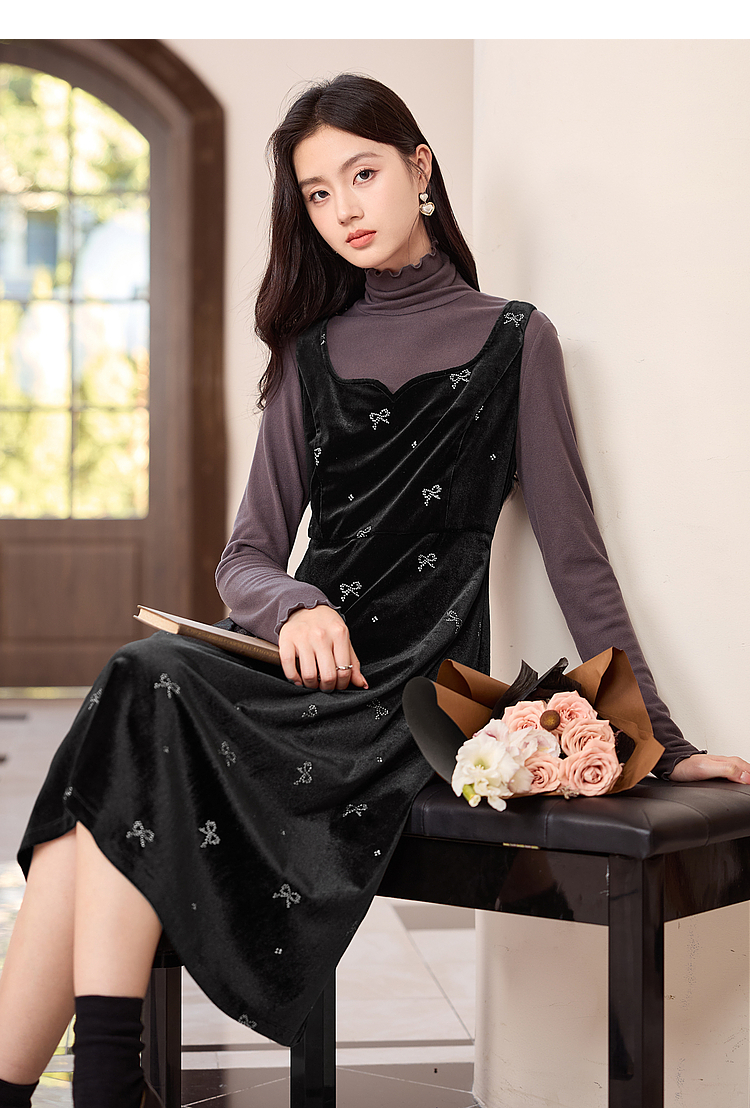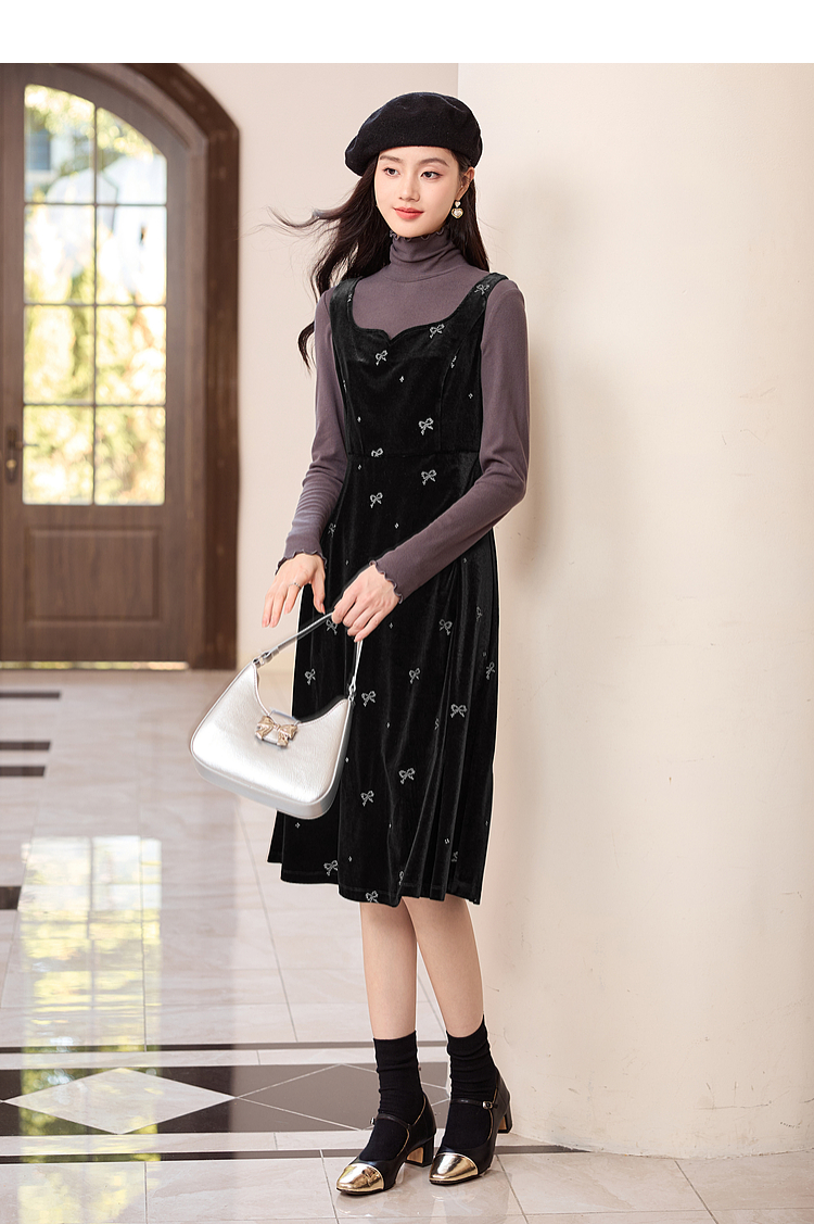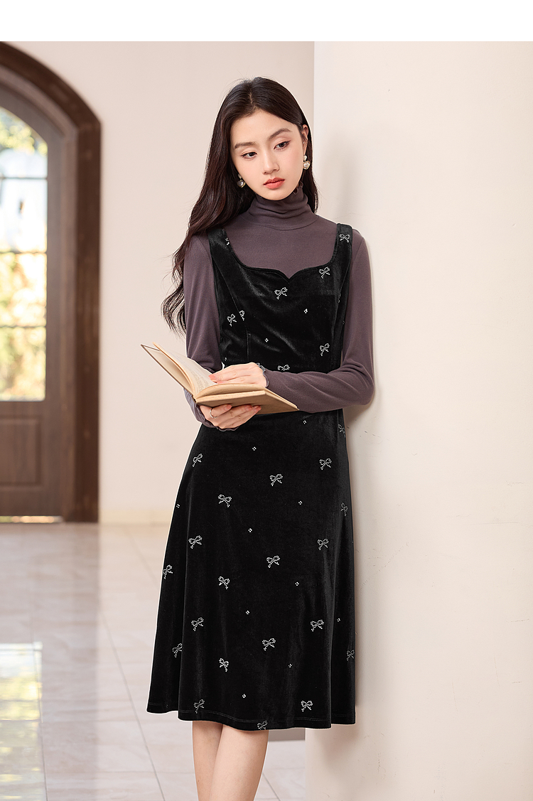【年终特卖】熙世界黑色复古刺绣丝绒吊带长裙女秋冬季法式优雅无袖背心连衣裙