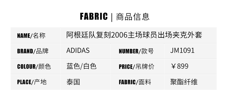 SFS正品 Adidas阿迪达斯2006世界杯阿根廷主场球员出场夹克外套JM1091