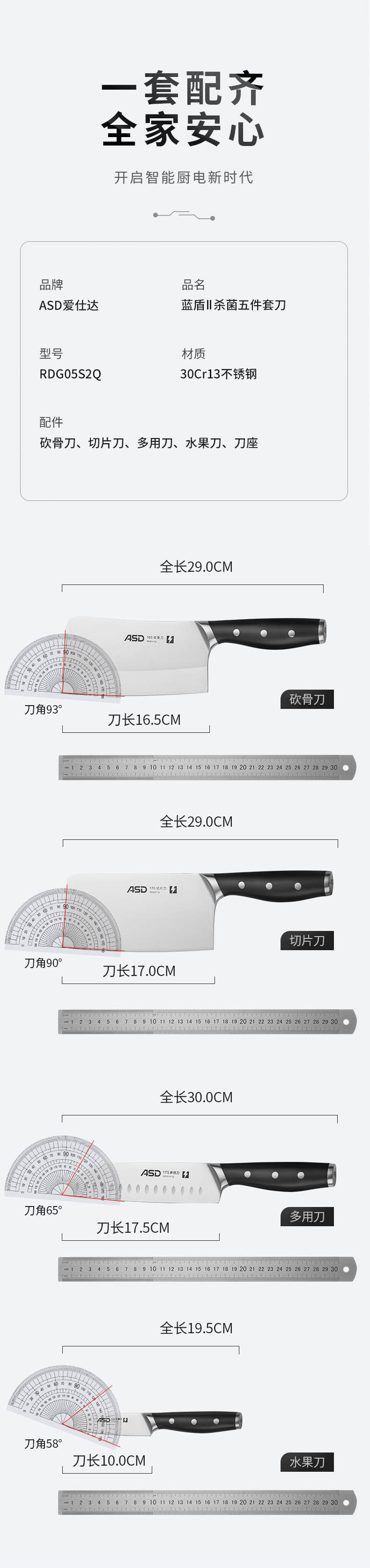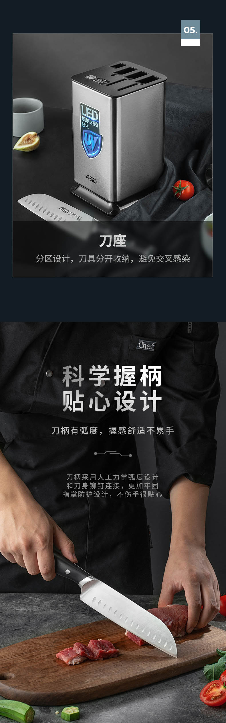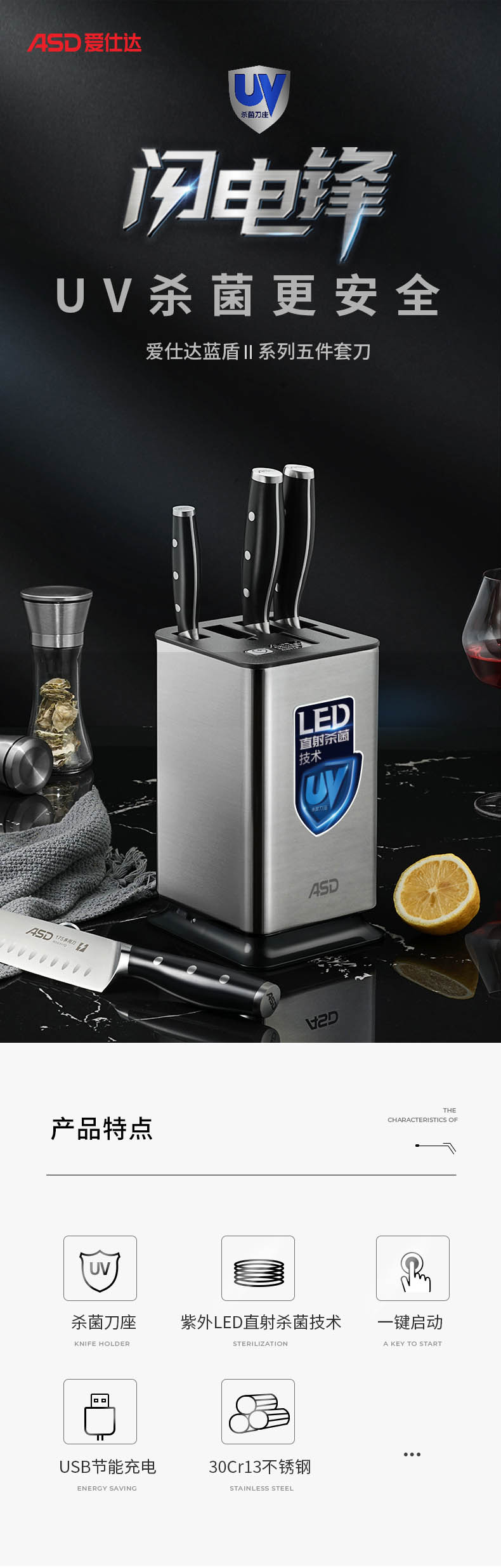 爱仕达 RDG05S2Q 家用套刀五件套LED紫外线杀菌消毒菜刀切片刀套装【全国】