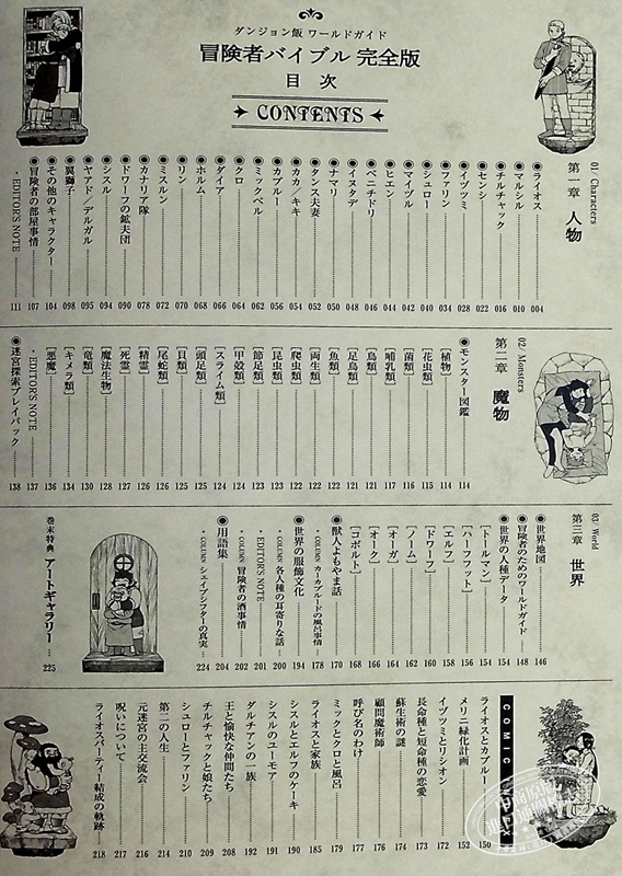 第1章 人物(ライオス/マルシル/チルチャック/センシ ほか)/第2章 魔物(モンスター図鑑/迷宮探索プレイバック)/第3章 世界(世界地図/冒険者のためのワールドガイド/世界の人種データ/獣人よもやま話/世界の服飾文化/用語集)/巻末特典 アートギャラリー