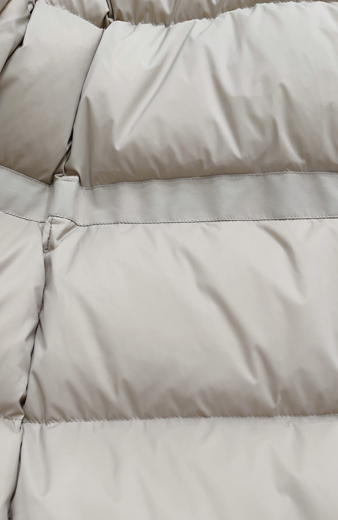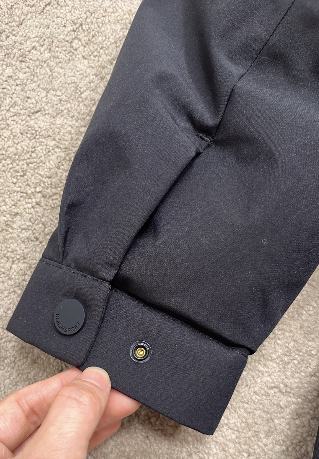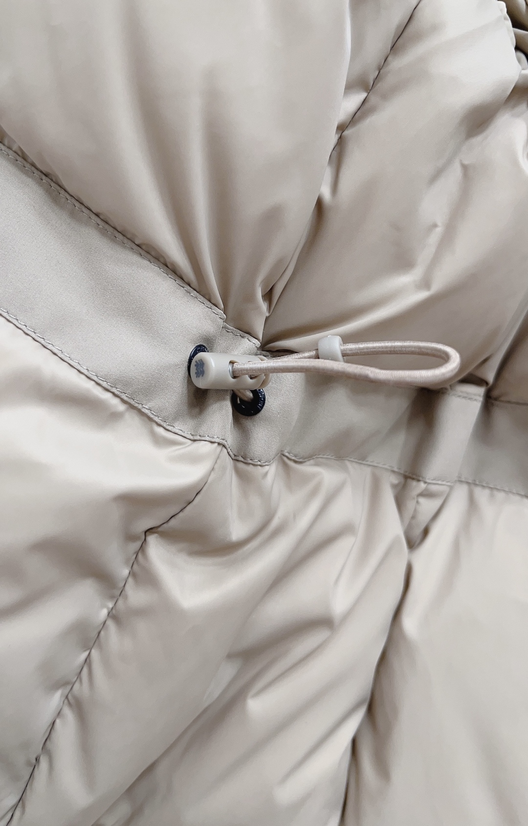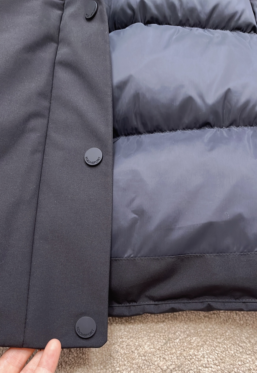 细节来一波,拉链,摁扣,松紧,扣头都是客供。后领绒绒的,即便连帽,有羽绒衣领,脖子也不空,