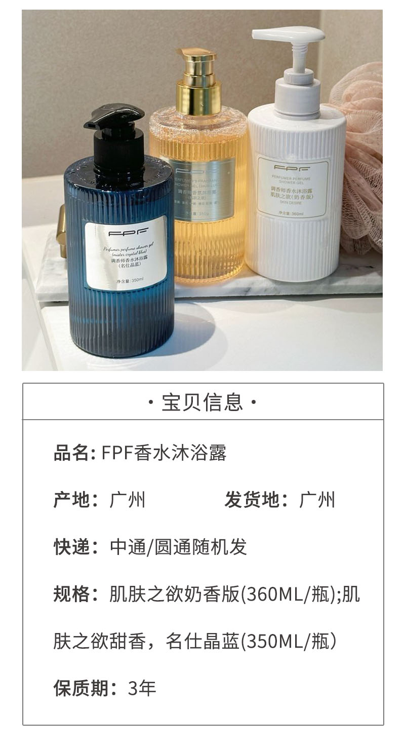 【FPF香水沐浴露】高级的调香,绵密的泡沫~用FPF洗掉的不止是尘埃,重更是疲惫!挤一泵在手轻松就能搓出绵密泡泡,一冲水泡沫就能洗干净,不假滑也不拔干,用它洗完澡,皮肤细腻又香香。