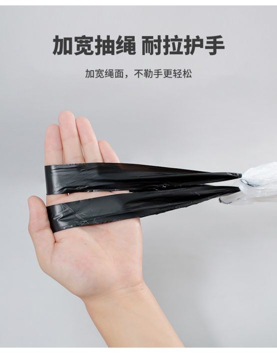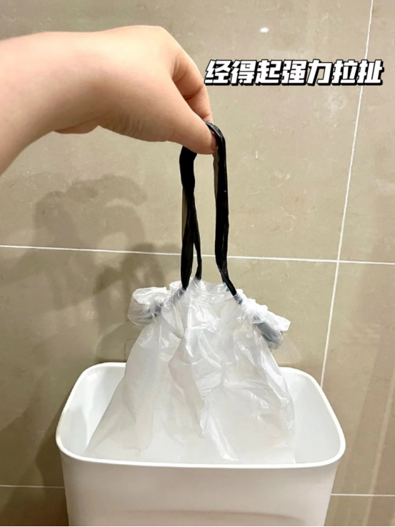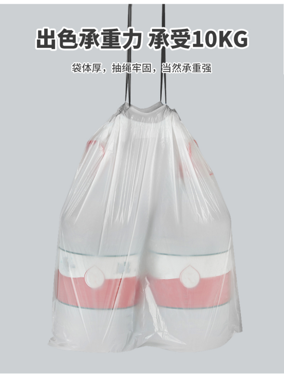 承重达到了10kg。加厚袋体,以及双侧牢固的抽绳设计,让垃圾袋不易扯断