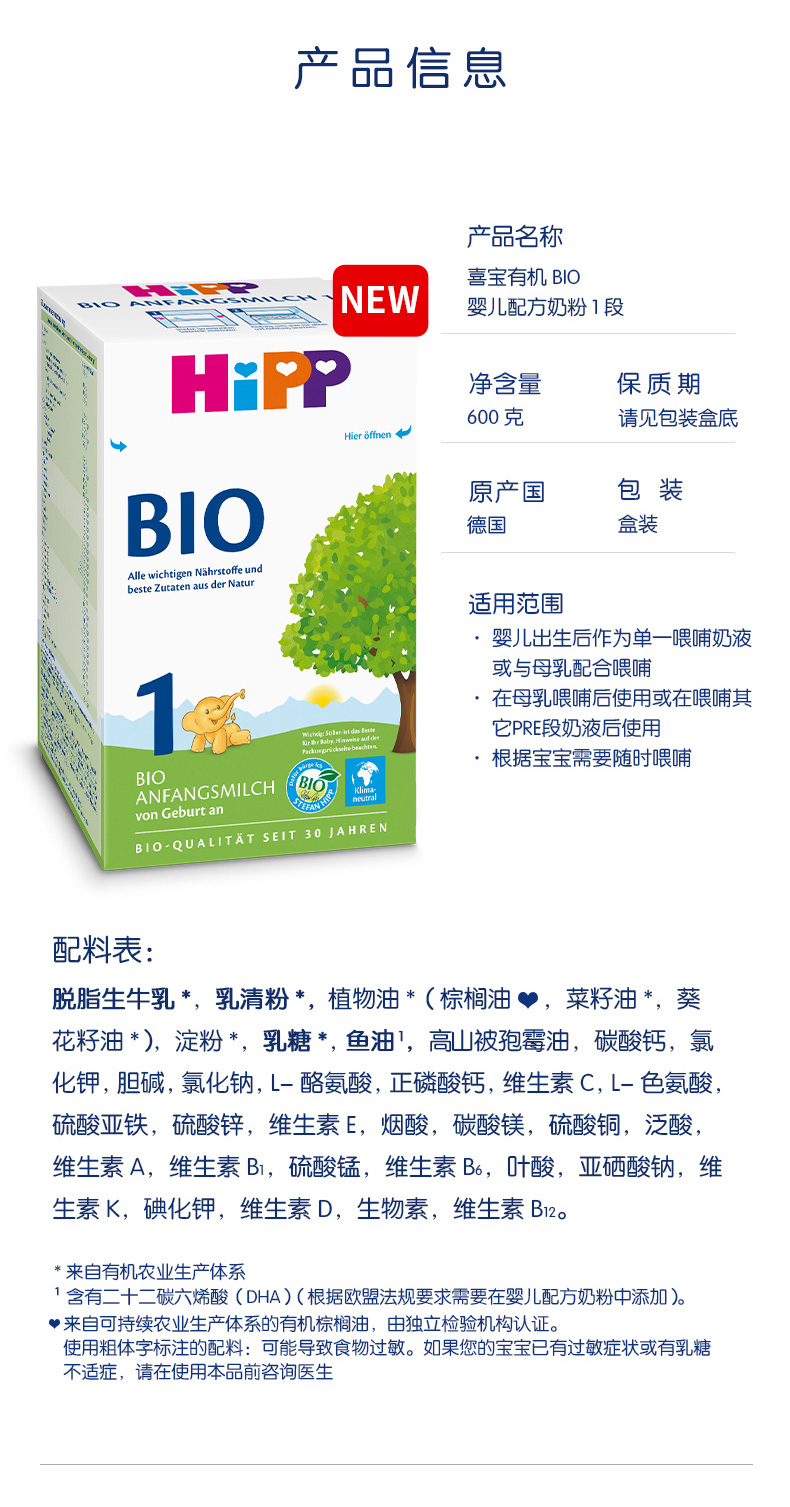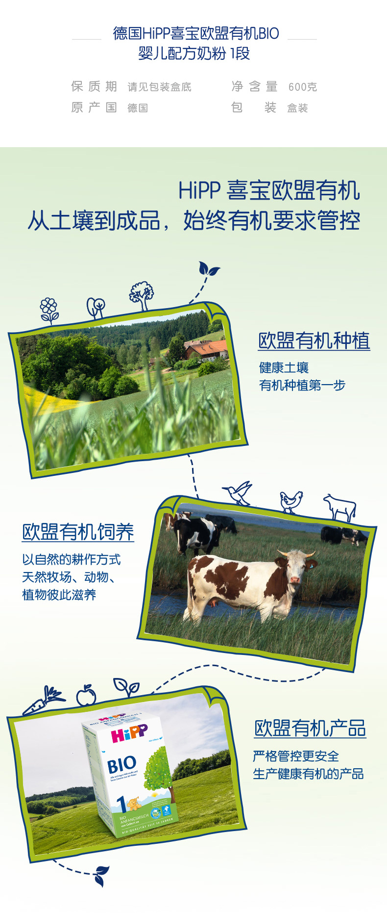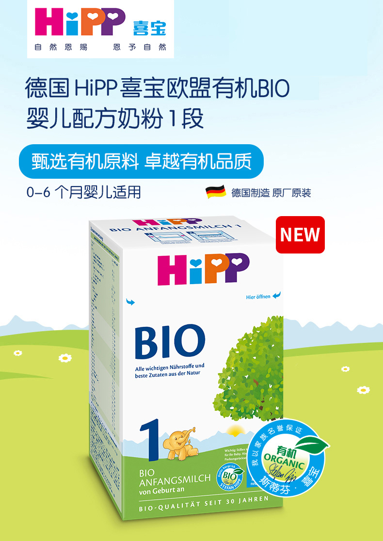 6盒【保税】德国喜宝有机奶粉1段600g/盒(新包装)