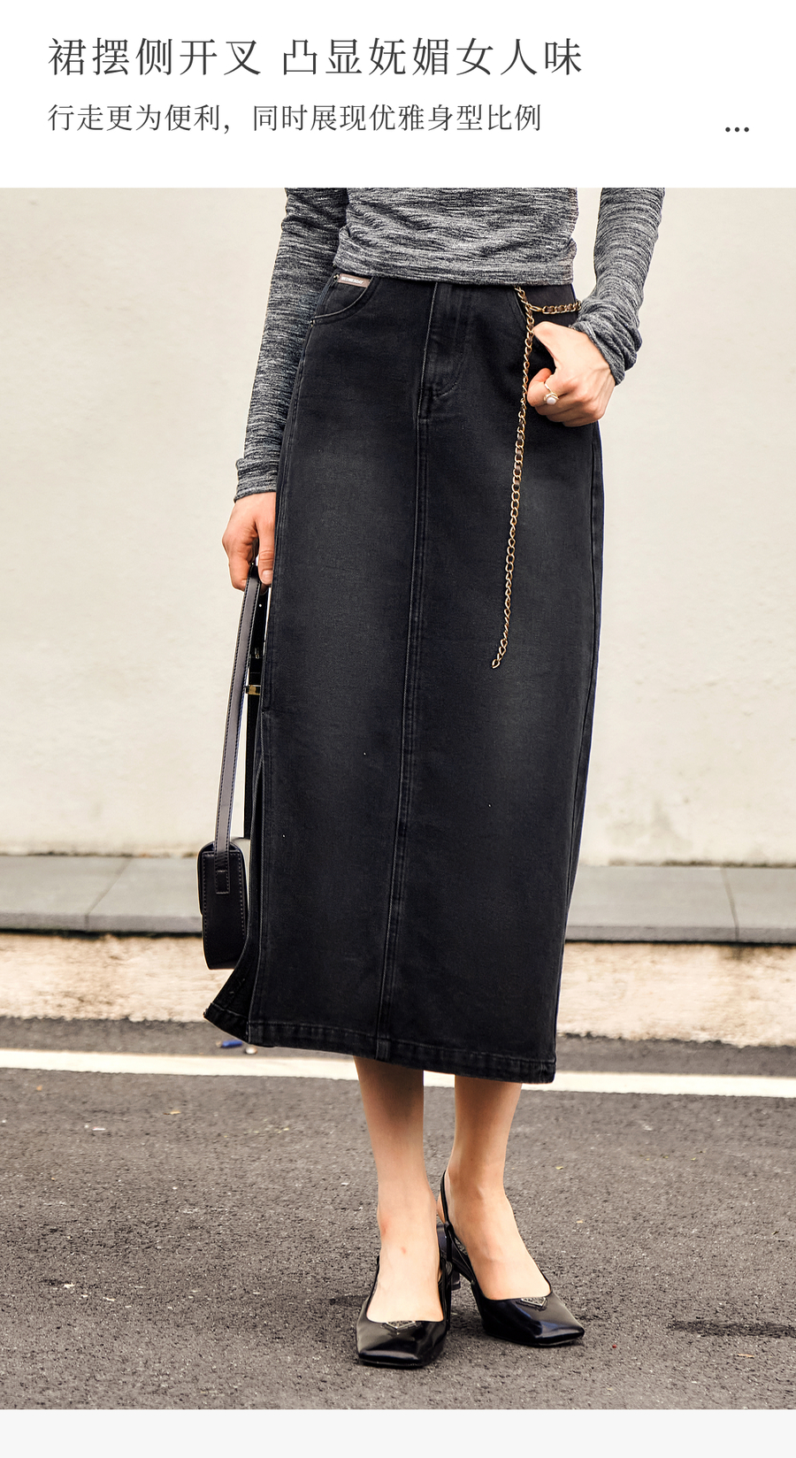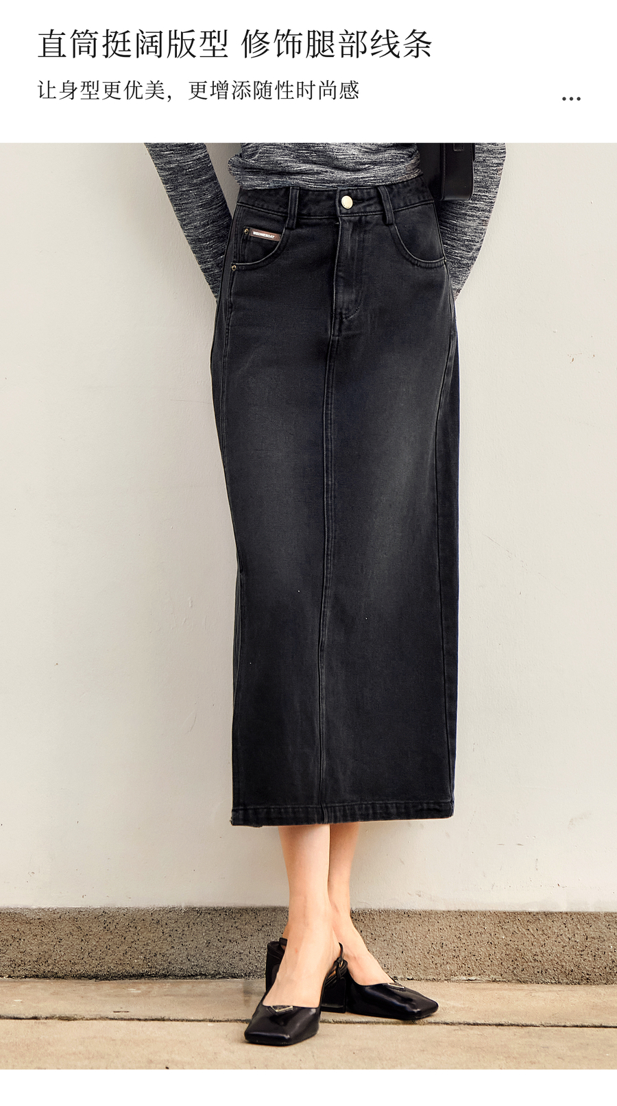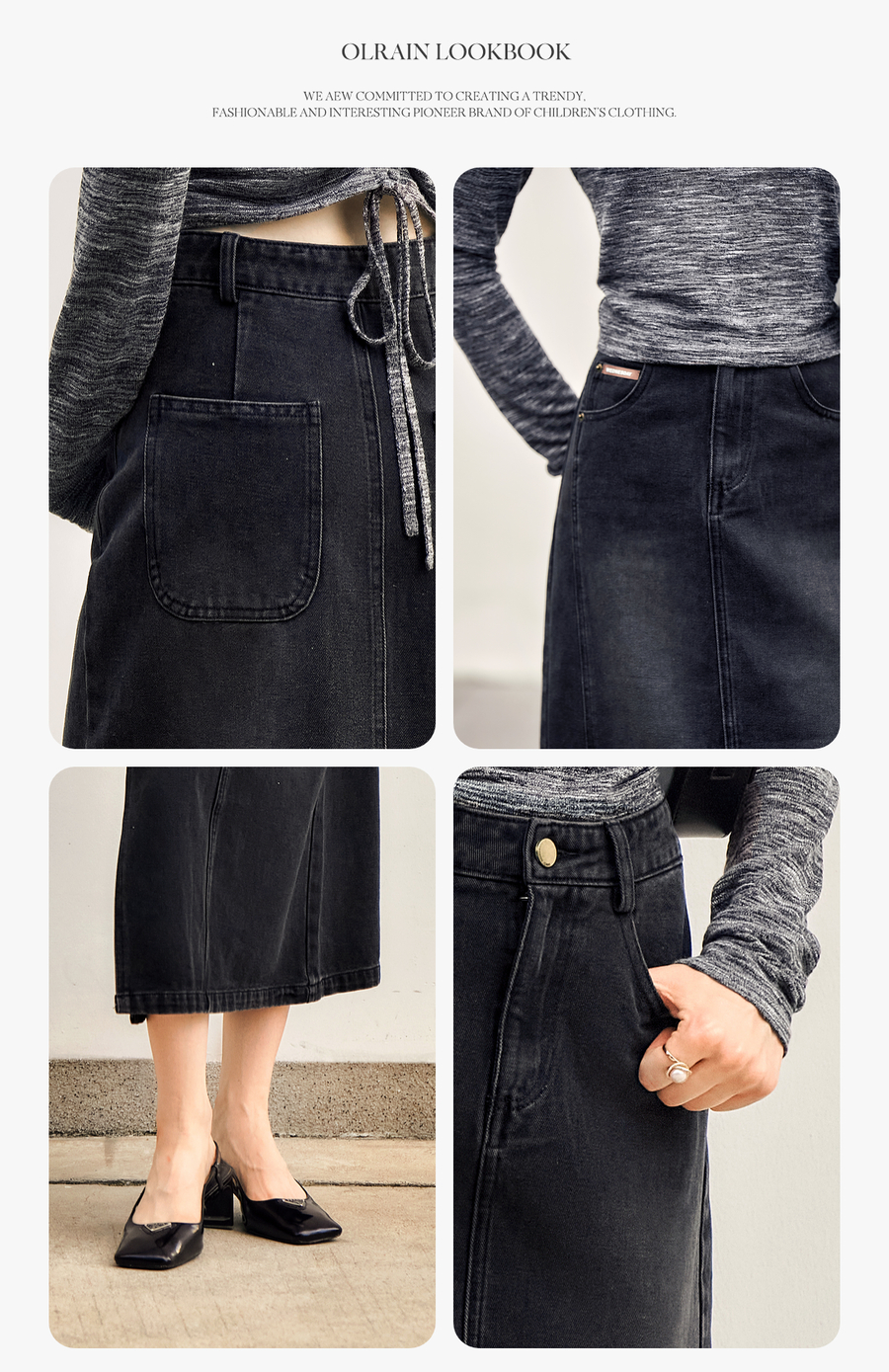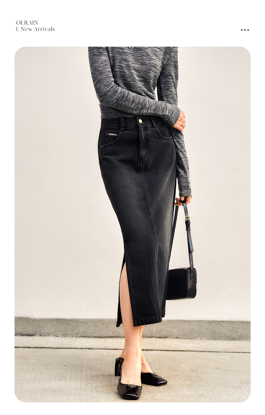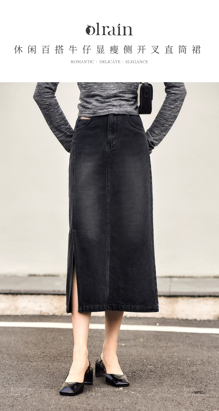 OLrain欧芮儿黑色牛仔半身裙女春季2025新款通勤休闲侧开叉直筒裙