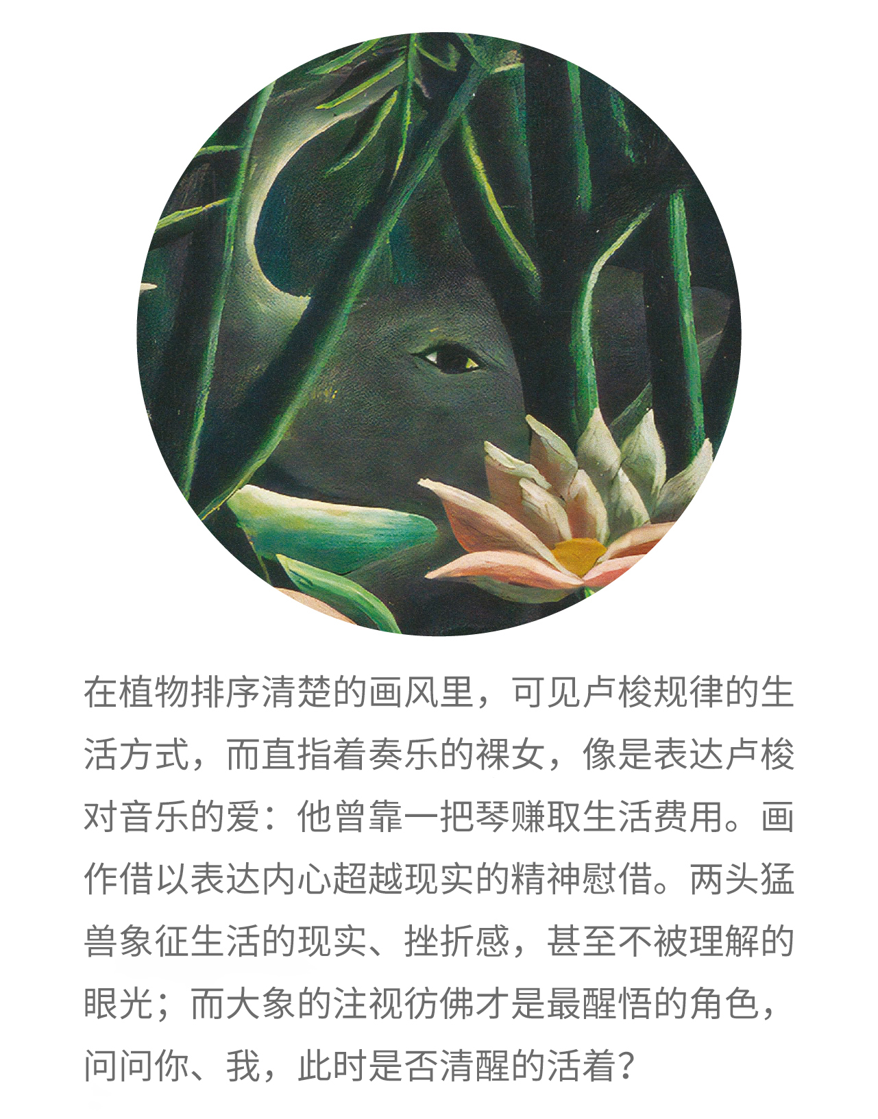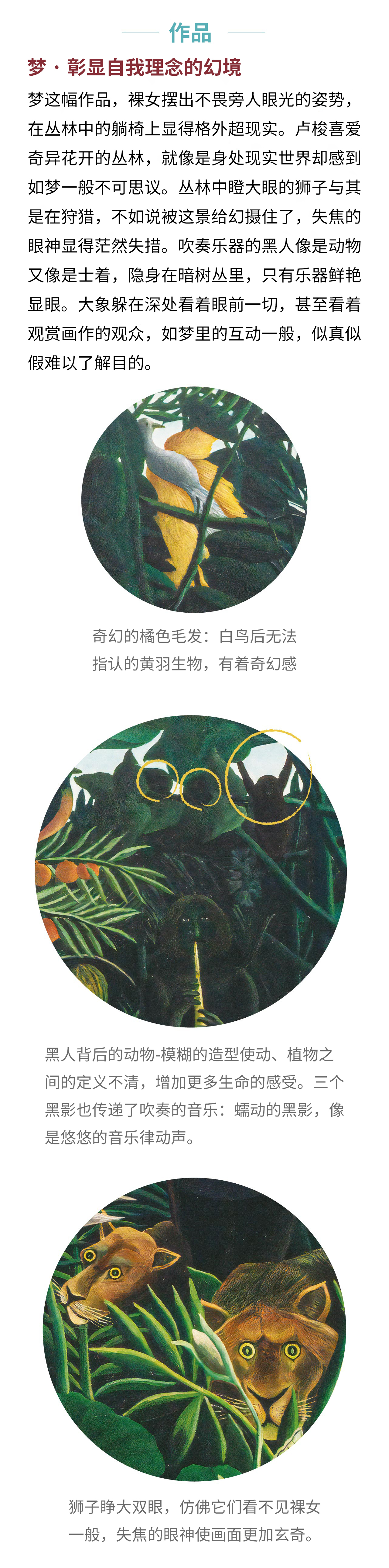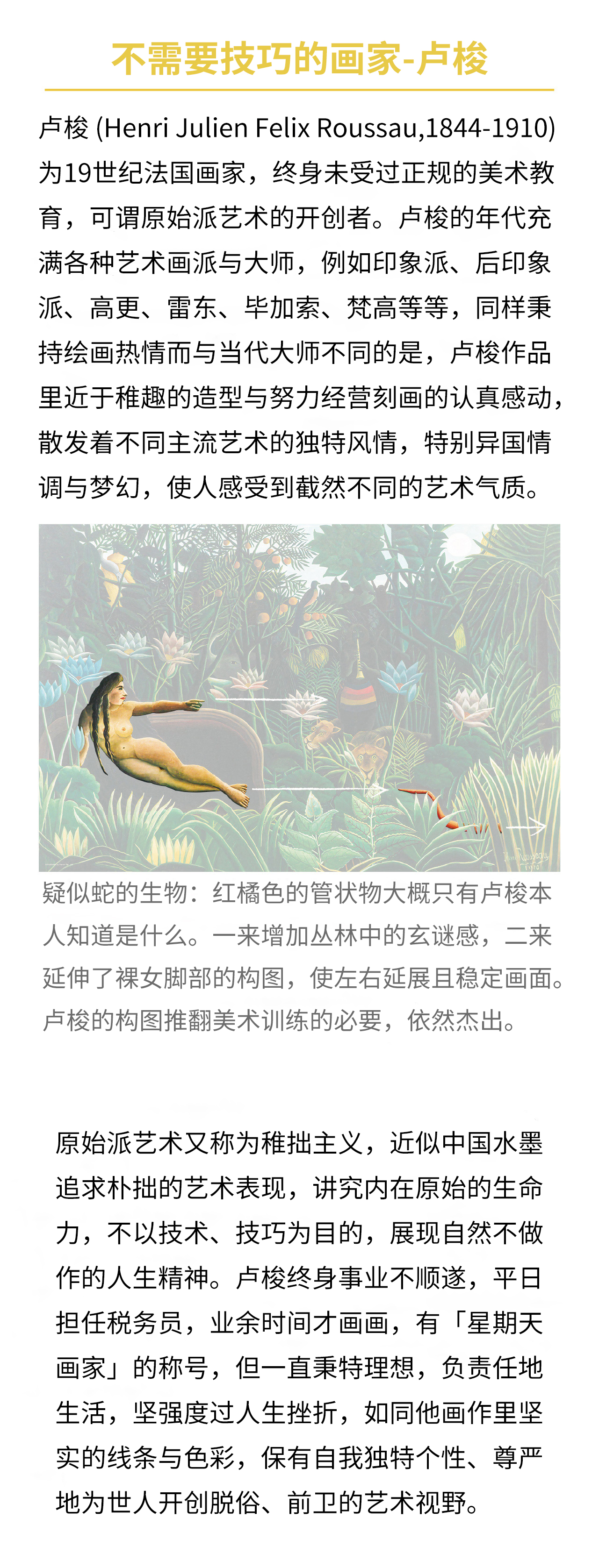 卢梭(1844-1910)为19世纪法国画家,终身未受过正规的美术教育,可谓原始派艺术的开创者。卢梭的年代充满各种艺术画派与大师,同样秉持绘画热情而与当代大师不同的是,卢梭作品里近于稚趣的造型与努力经营刻画的认真感动,散发着不同主流艺术的独特风情,特别异国情调与梦幻,使人感受到截然不同的艺术气质。