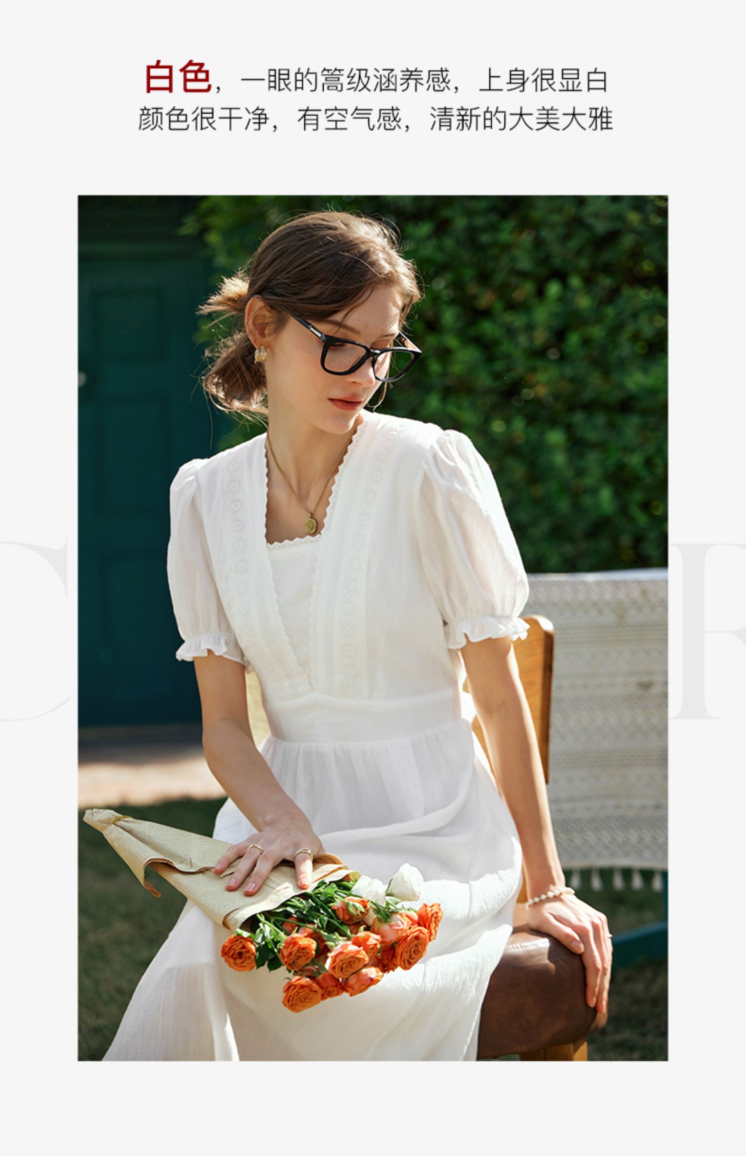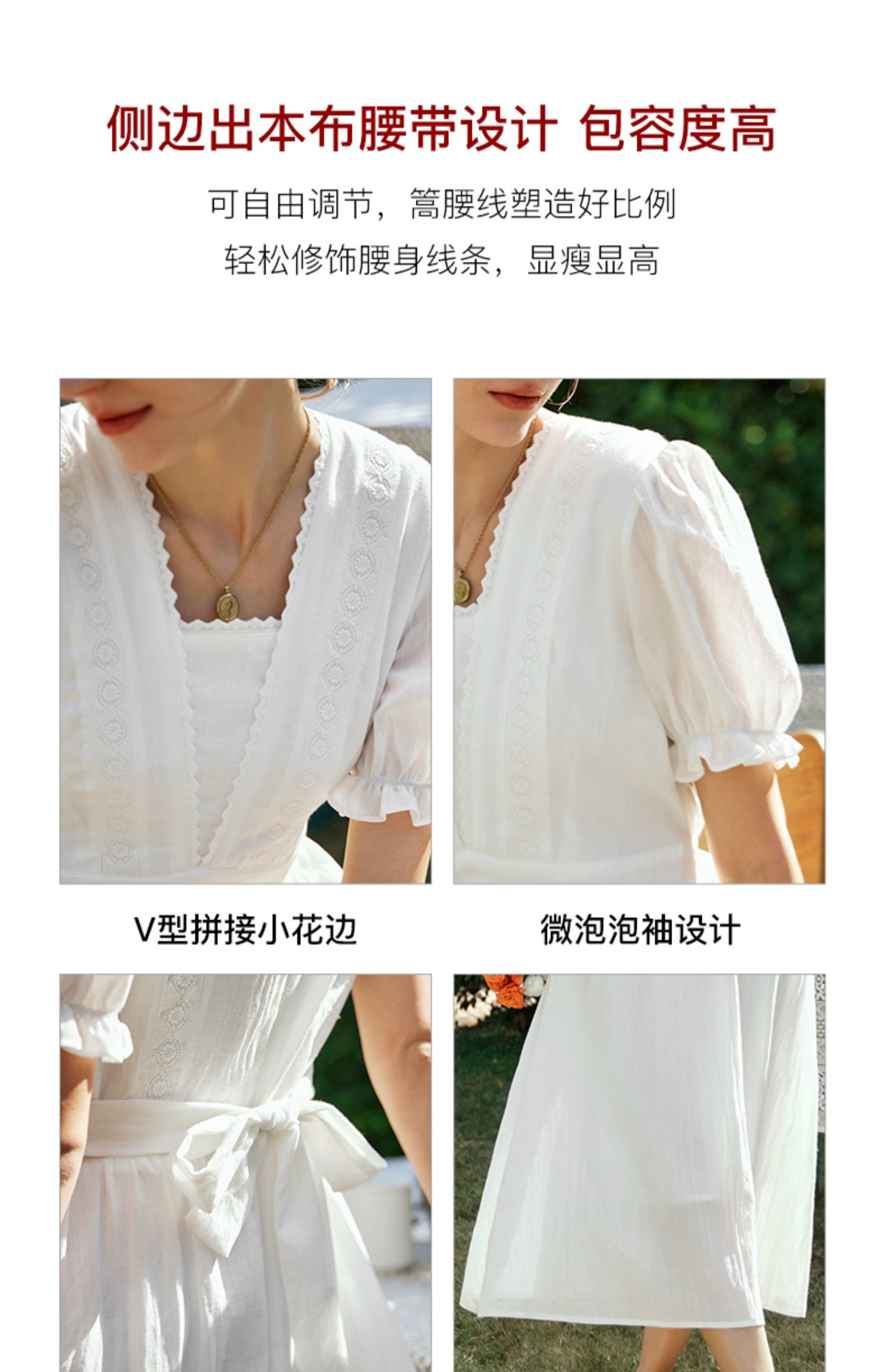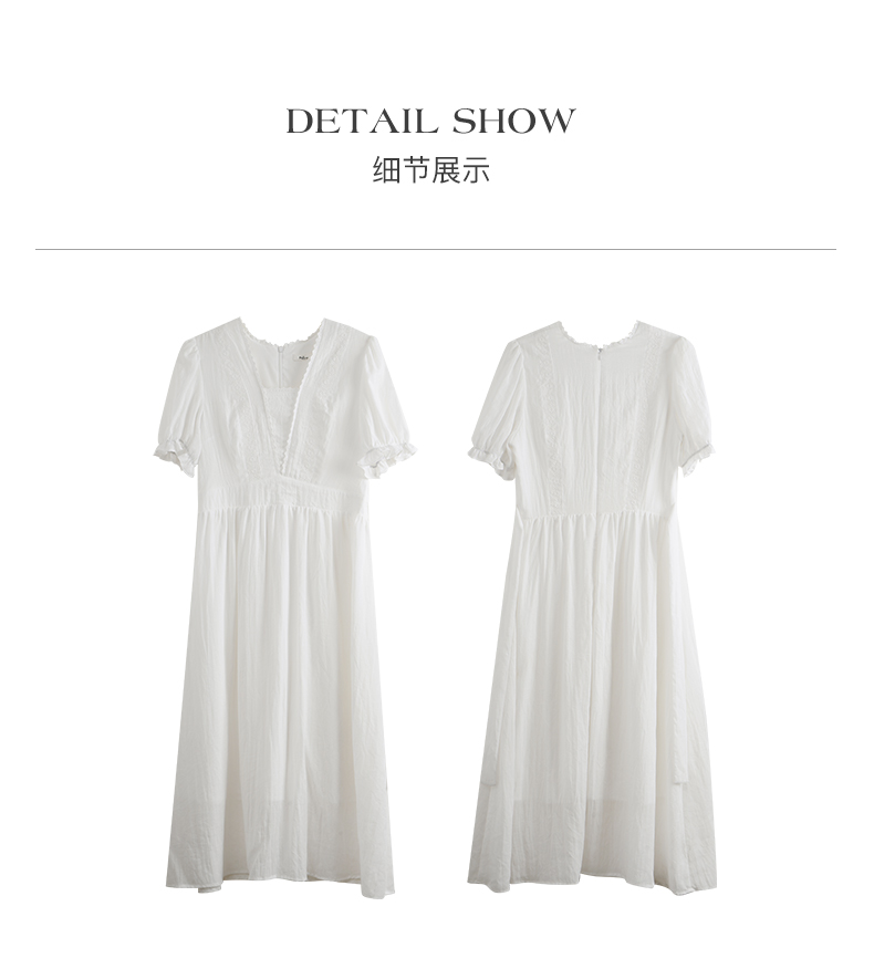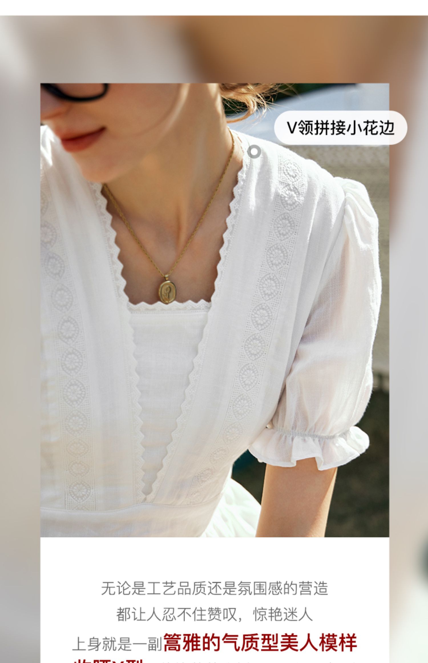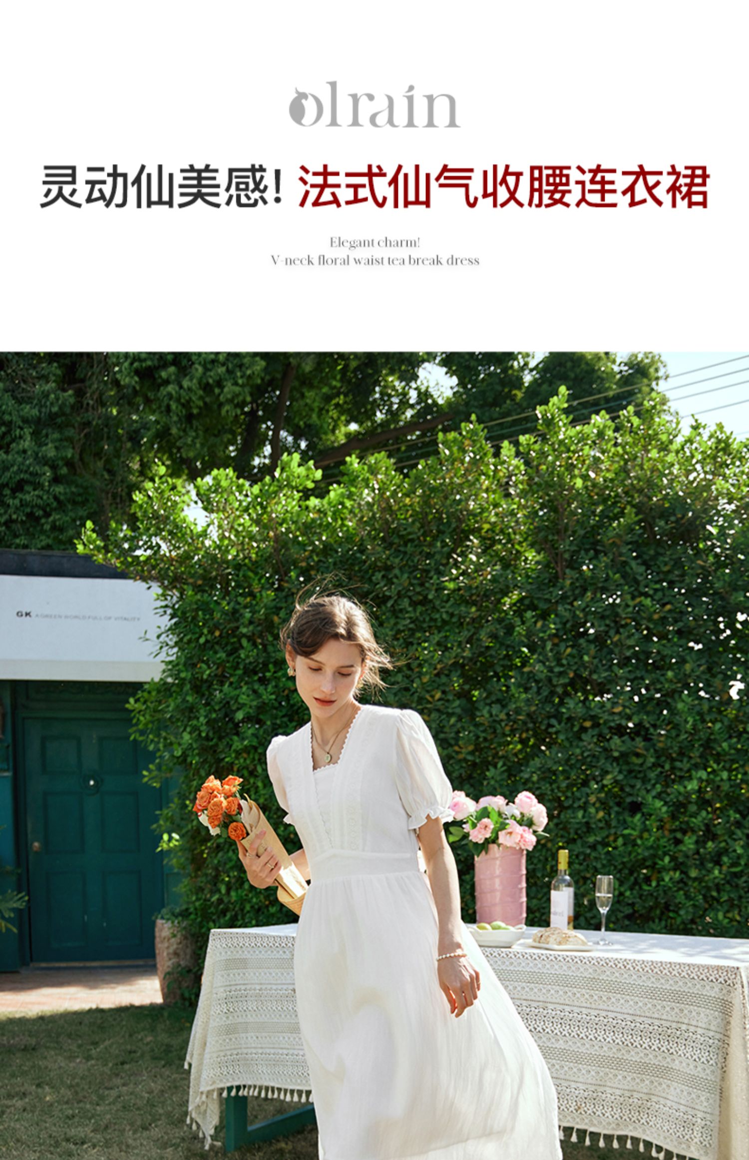 OLrain欧芮儿法式泡泡袖白色V领小花边连衣裙女夏季2024新款显瘦长裙