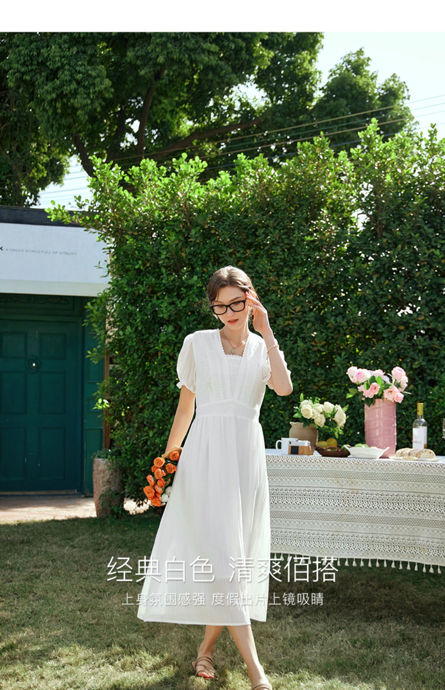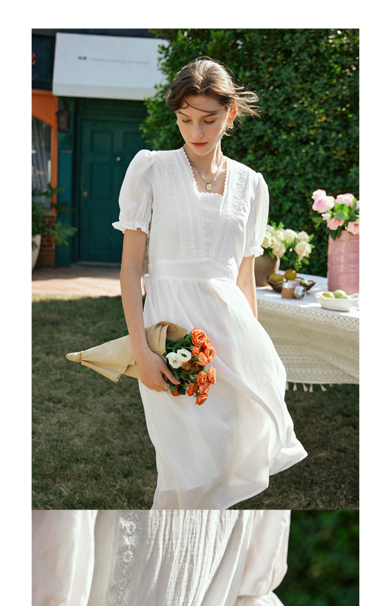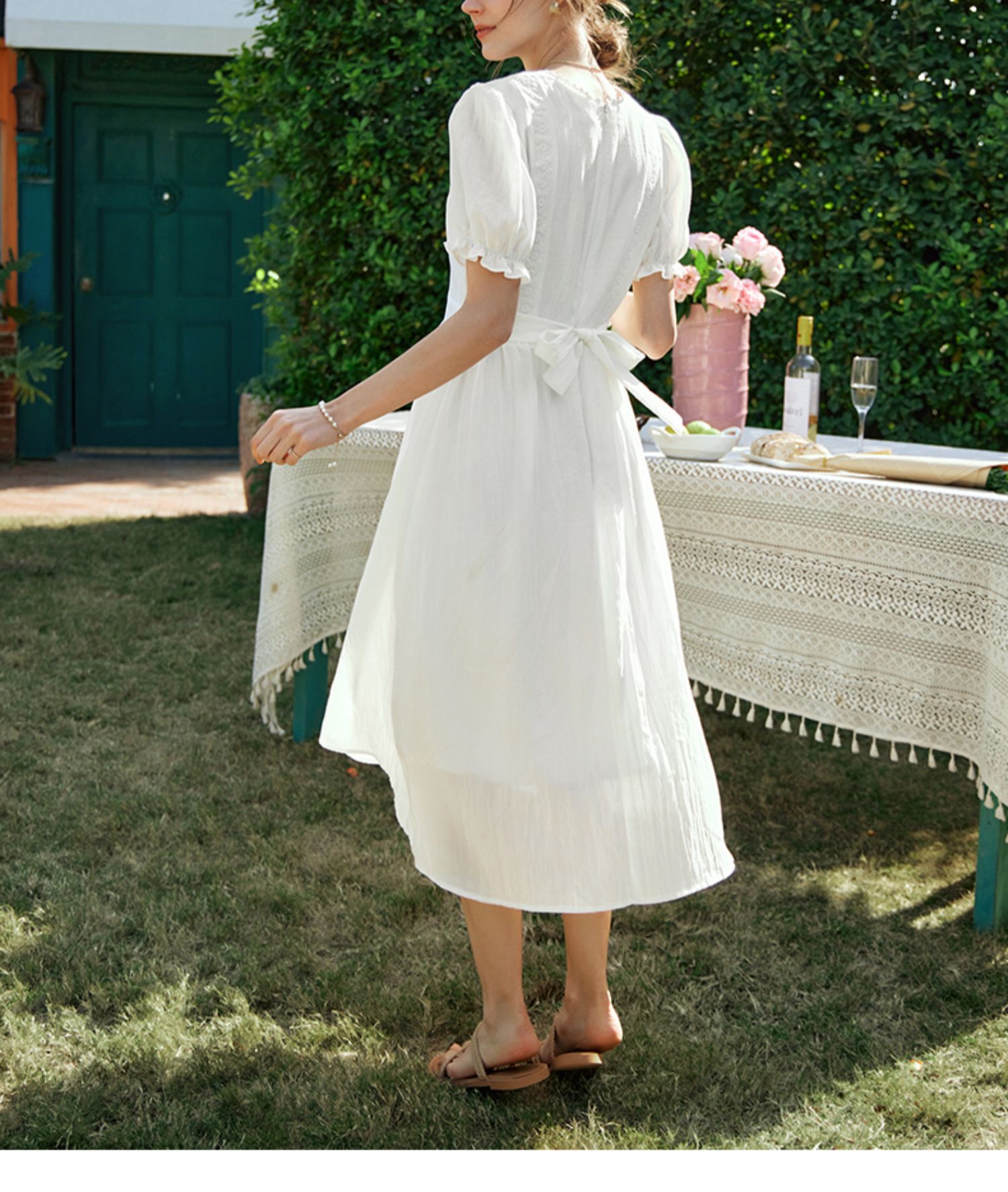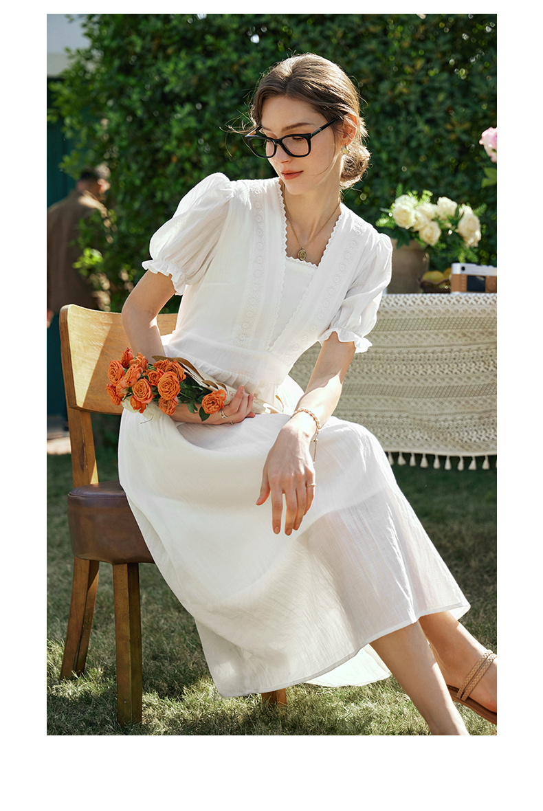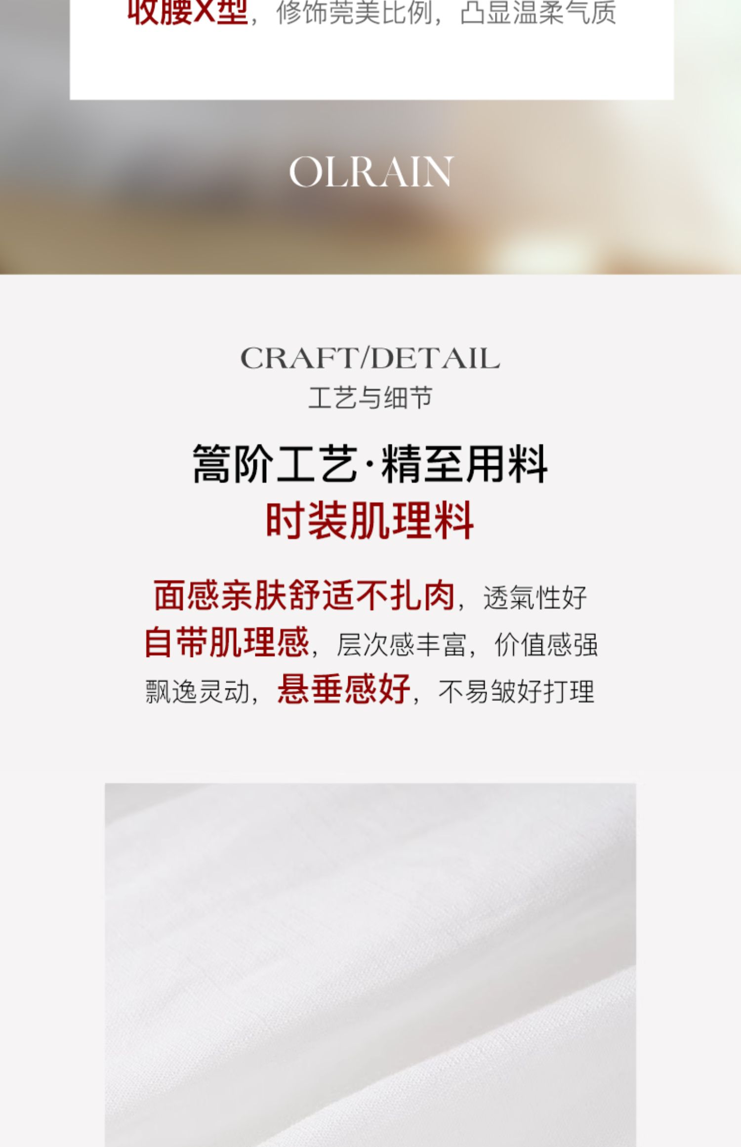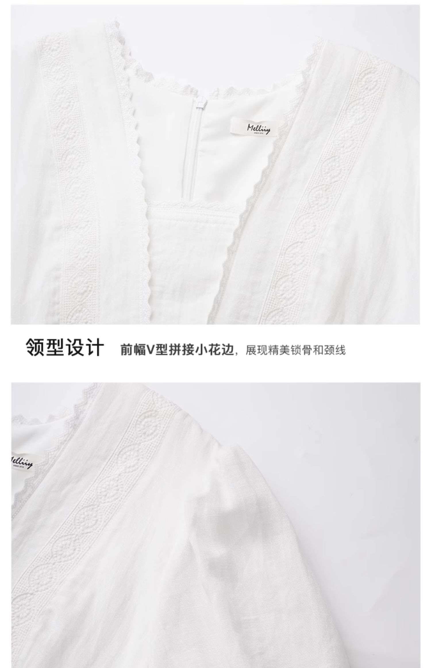 OLrain欧芮儿法式泡泡袖白色V领小花边连衣裙女夏季2024新款显瘦长裙