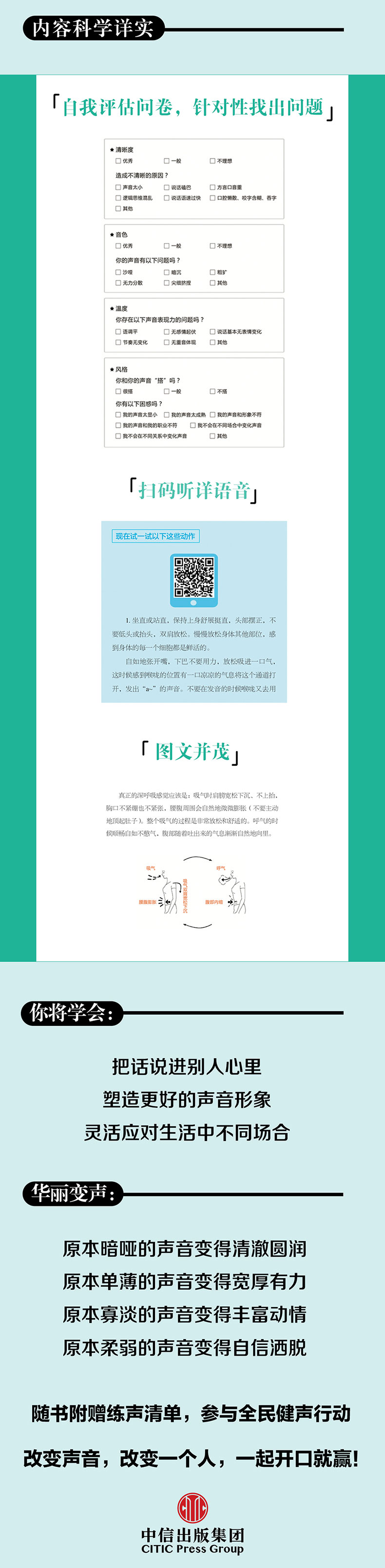 我将一路走来的所有关于声音的心得感悟和方法技巧整理成完整的体系,带着满满的诚意化作这本书呈现给大家。书中除了教学部分示范音频外还有问答环节,这些都是授课中大多数学员在学习相应内容时反馈给我的真实提问,极有代表性。书中还附有练习清单,让你清楚地知道自己该练什么、怎