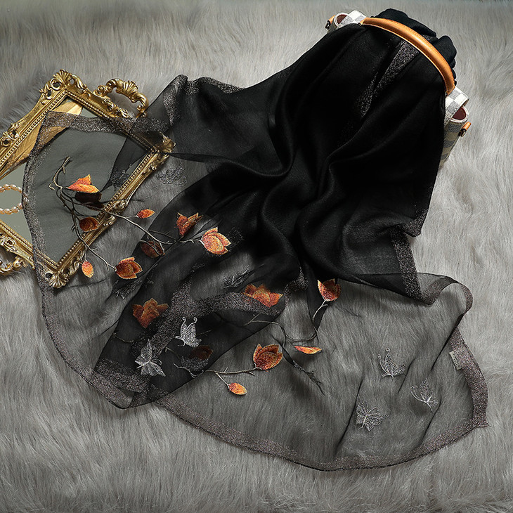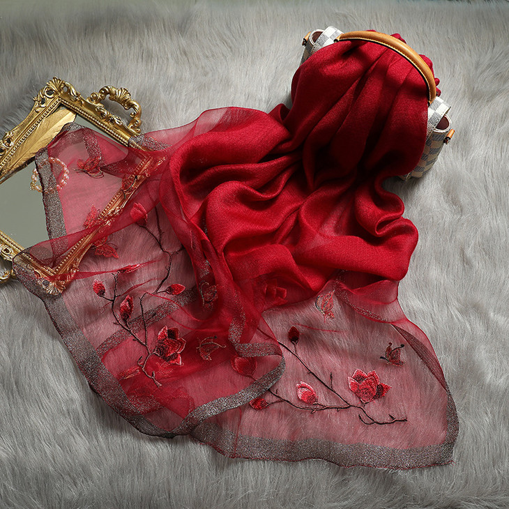 新款春秋百搭真丝绣花围巾 ,刺绣真丝丝巾羊毛混纺披肩围巾QM000289