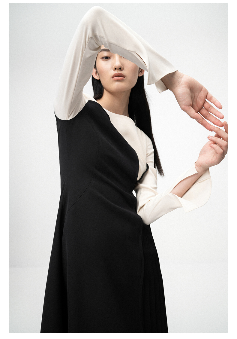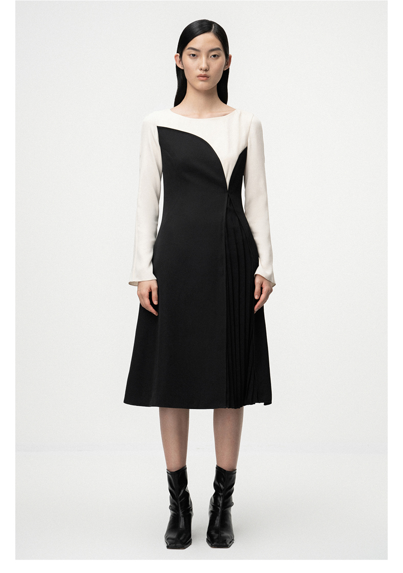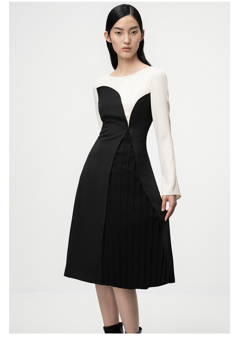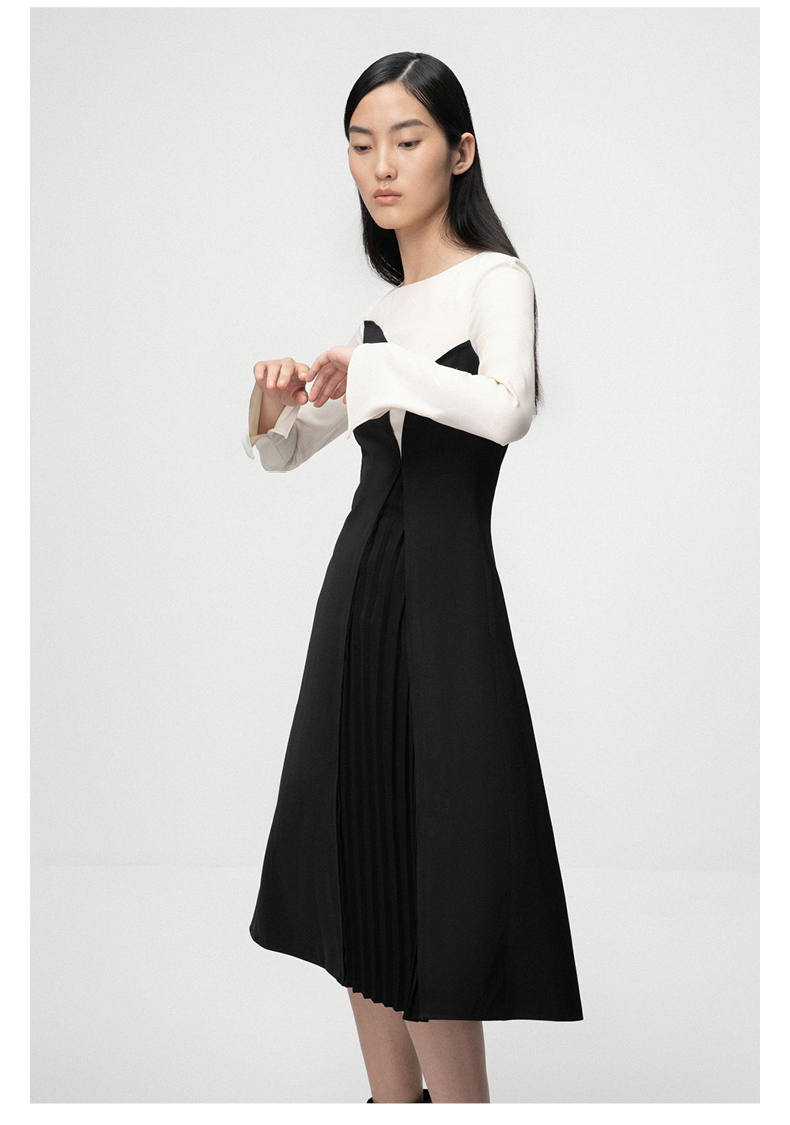【密林小径】流畅曲线黑拼米白风琴折收腰长袖连衣裙/0000741A