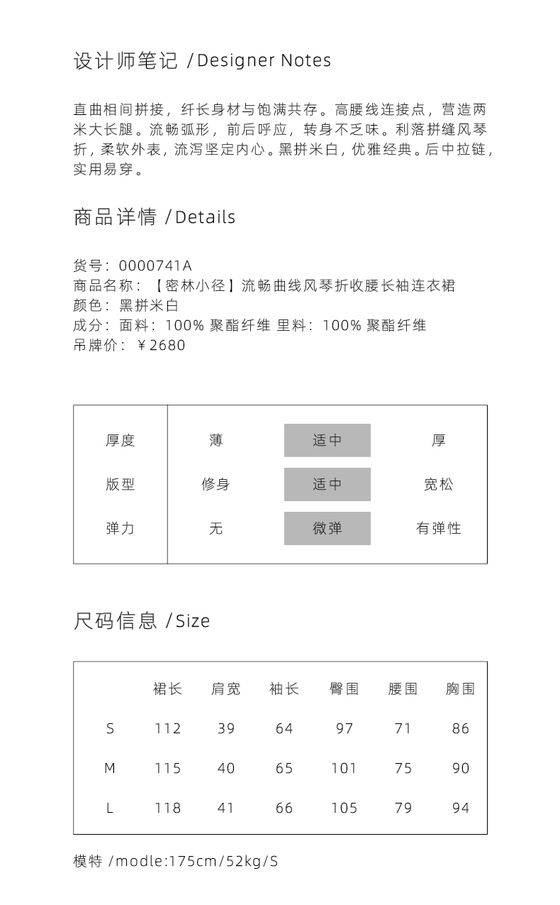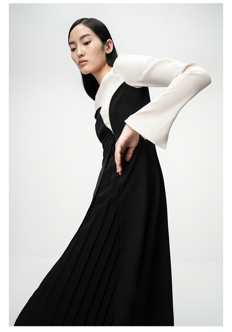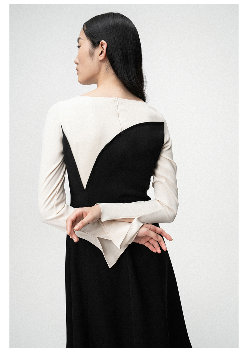 【密林小径】流畅曲线黑拼米白风琴折收腰长袖连衣裙/0000741A