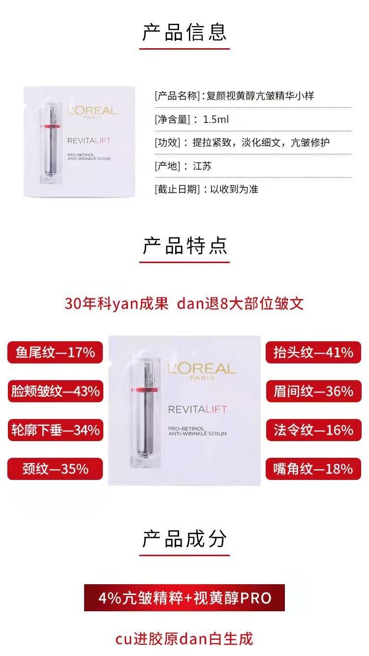 【爆款超低价预售 急单慎拍】小样-欧莱雅逆时瓶复颜视黄醇精粹抗皱精华液滋养润抗皱紧致淡纹