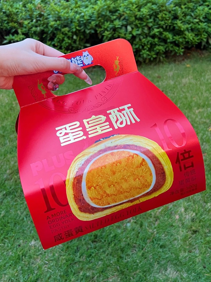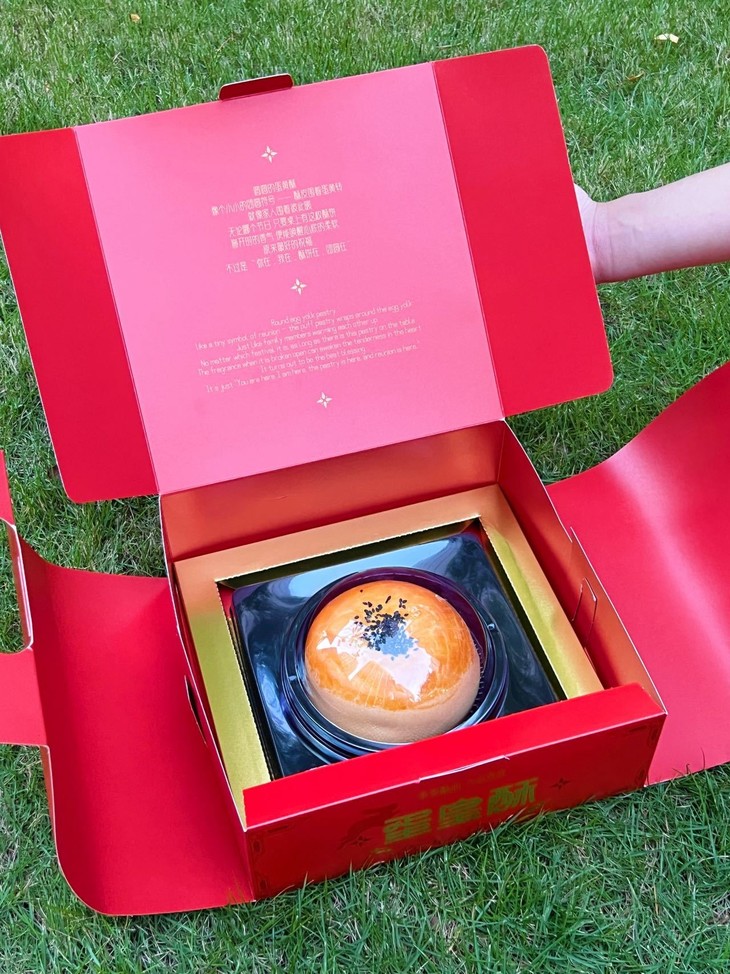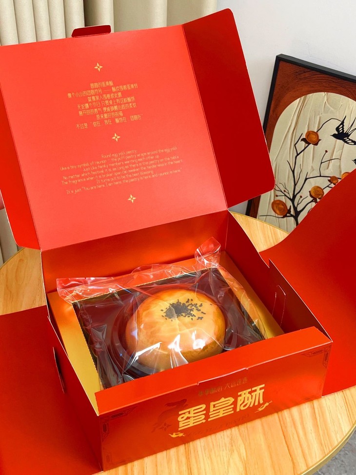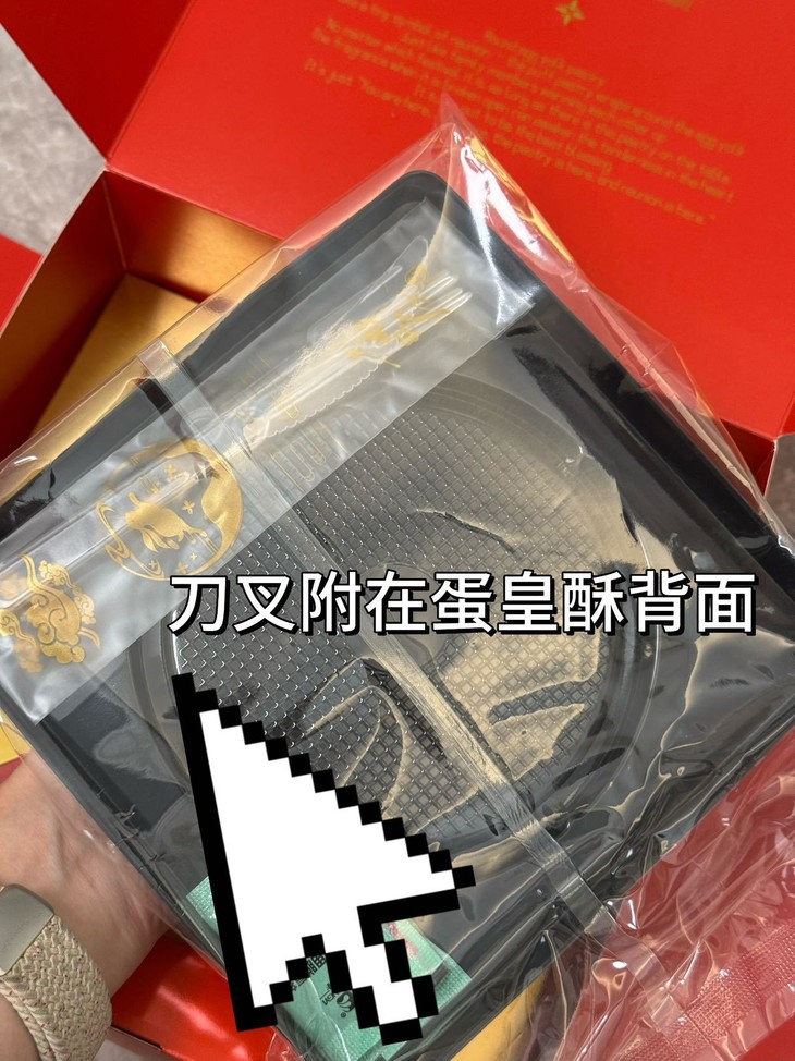 👋拿出来比我手掌还大! 平时吃普通蛋黄酥总感觉不过瘾…这个一颗管饱! (⚠️建议切块分享!不然真的吃不完hhh) 🎁包装高级感拉满~ 精美手提礼盒设计!还送刀叉! 均价算下来比买小颗的划算太多!